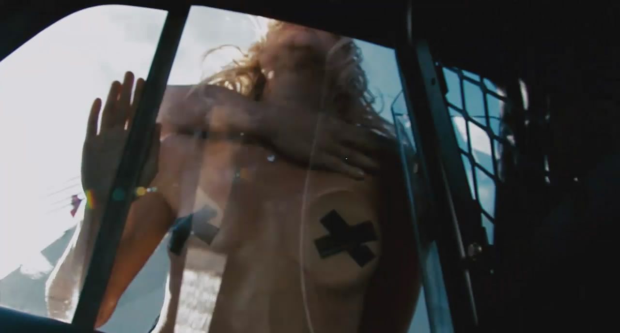 Эми Смарт выходит из стрип-клуба с парнем, одетая только в чёрные ленты на сосках и очень короткие шорты. Затем парень вступает в столкновение с полицией, и Эми пытается ему помочь. В итоге её сажают в полицейскую машину, но не раньше, чем её прижимают к машине, и её грудь прижимается к стеклу окна.At one point, Amy jumps on the back of one officer and accidentally slips a view of her labia as her tiny shorts don’t cover her up.