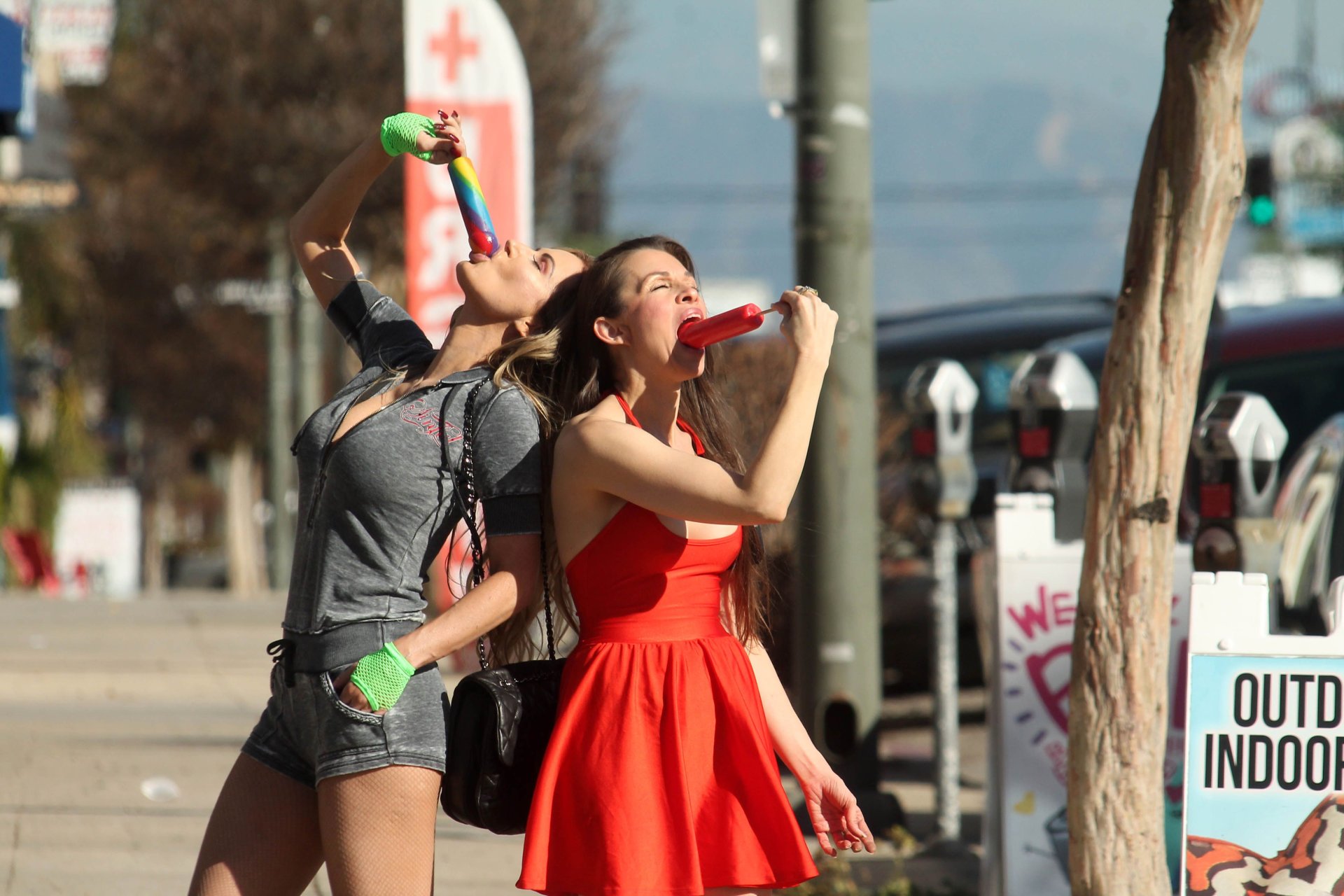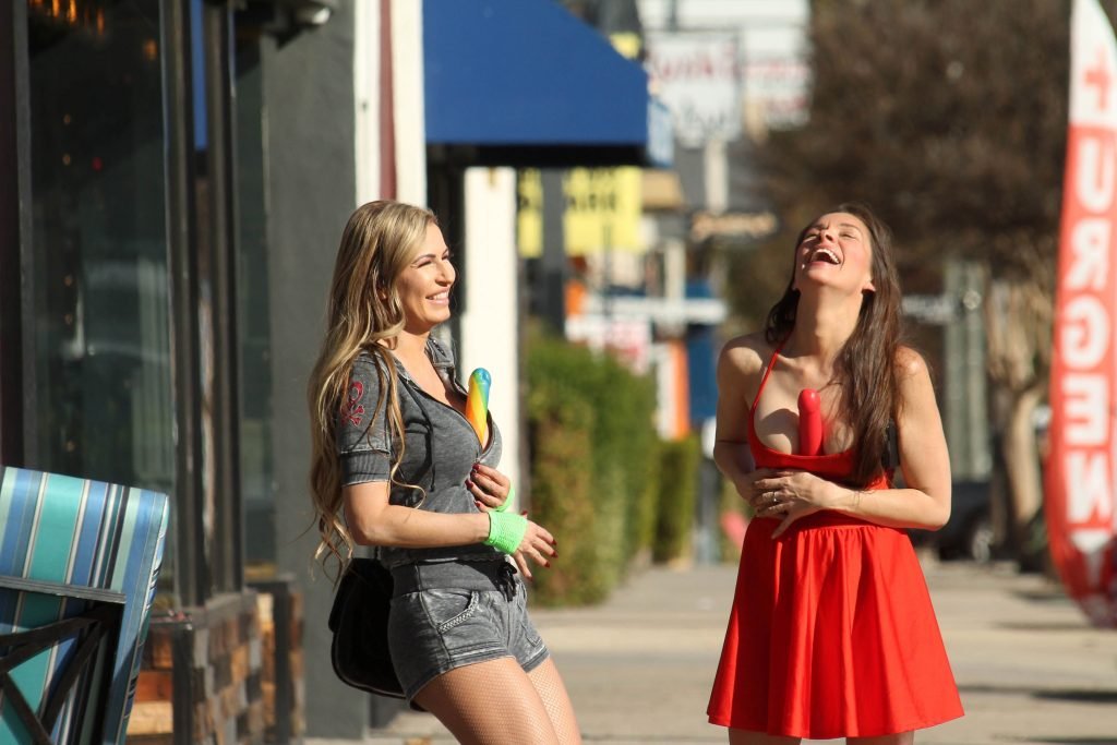Бразильская плеймейт Ана Брага и актриса из “Спасателей Малибу” Алисия Арден позируют для папарацци, когда их застали выходящими из эротического бутика, наслаждаясь леденцами, которые они купили в Студио-Сити, 22.01.2018.