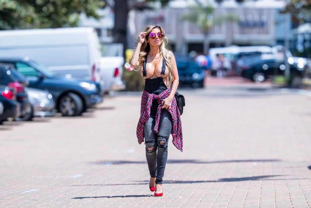 Бразильская модель и плеймейт Ана Брага носит подтяжки без ничего под ними в Малибу, 31.08.2017.