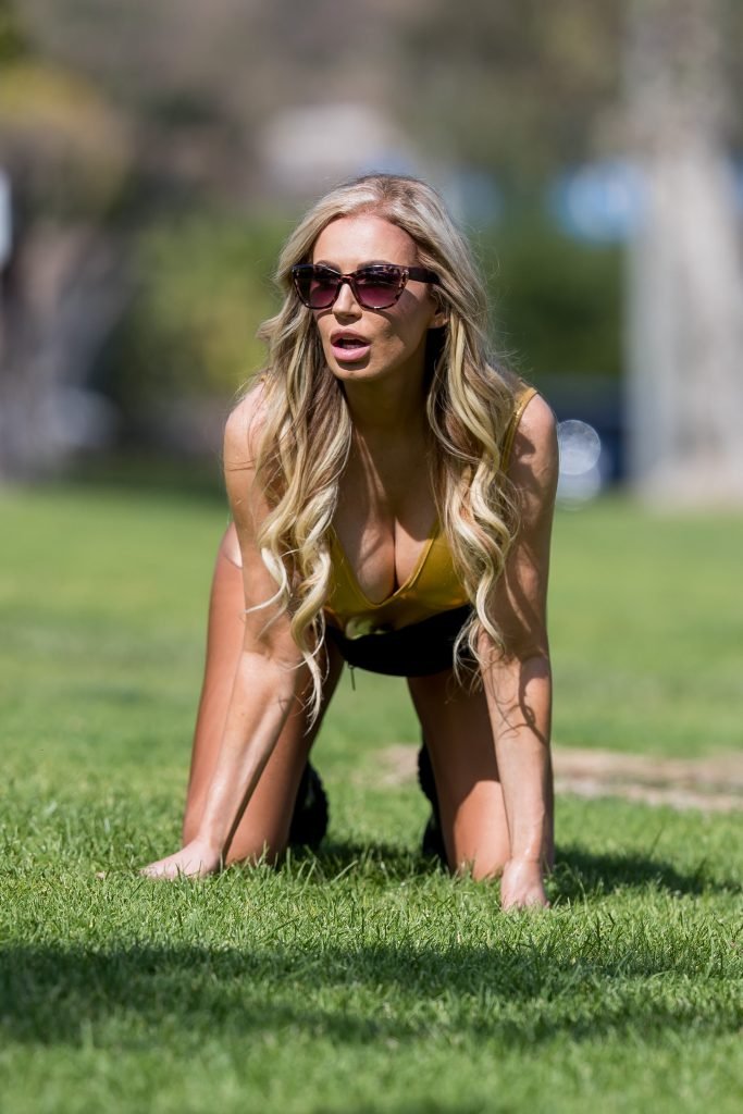 Playmate Ана Брага демонстрирует свой золотой спортивный костюм в парке в Лос-Анджелесе, 05/06/2018. Модель выполнила несколько упражнений во время фотосессии.