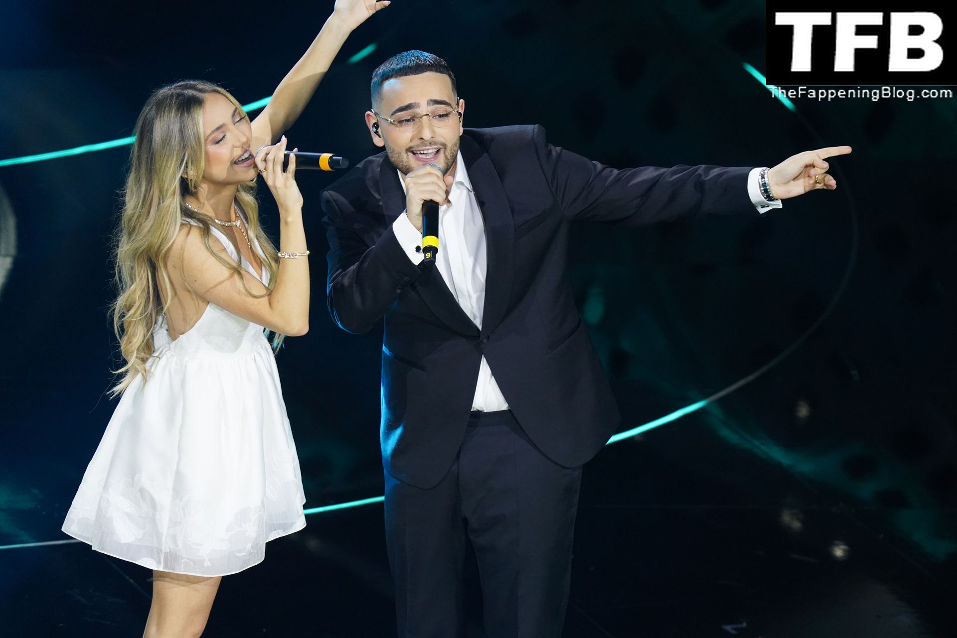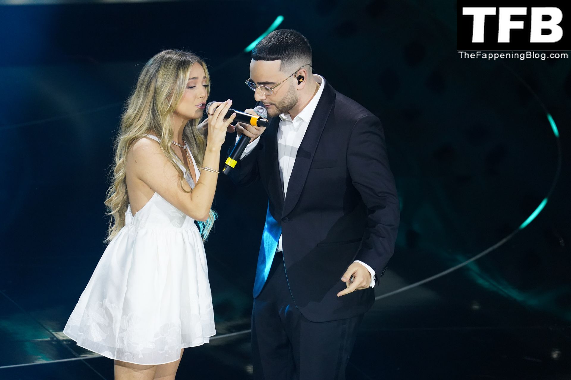 Красивая испанская певица Ана Мена выступает в белом платье на 72-м музыкальном фестивале Санремо в Италии, 02/04/2022.