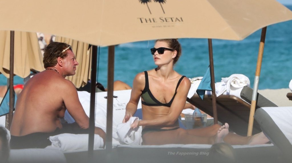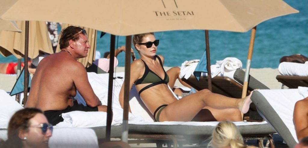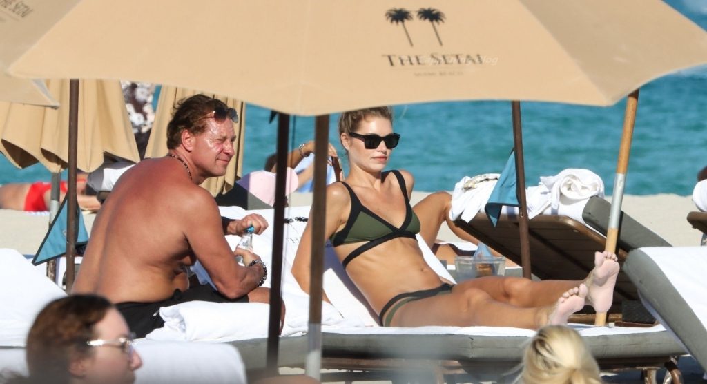 Модель Анастасия Грик наслаждается днем и ловит солнечные лучи на пляже Майами в зеленом бикини, 26.01.2021.