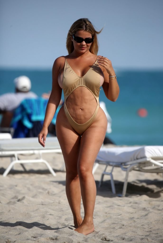 Instagram-суперзвезда Анастасия Квитко, 23 года, демонстрирует свои формы в золотом купальнике с танга на пляже в Майами-Бич, 08.03.2018.