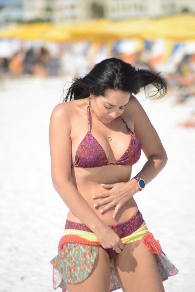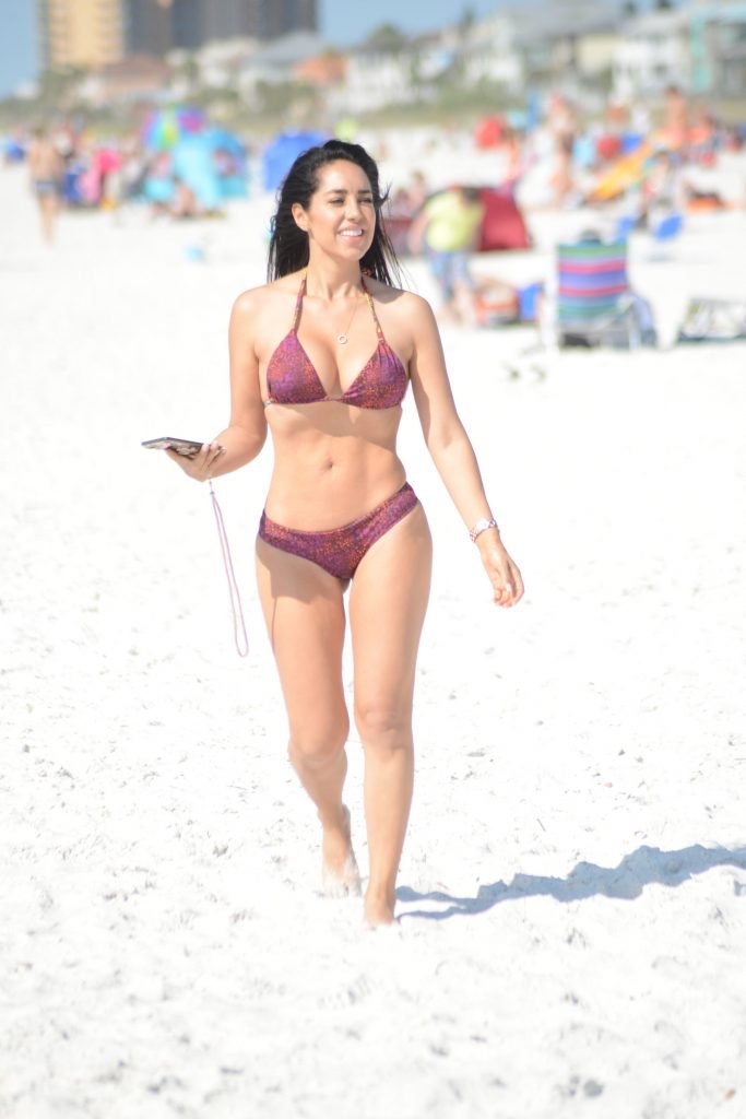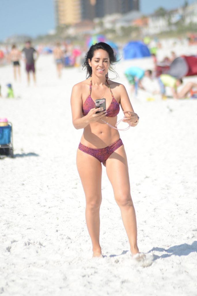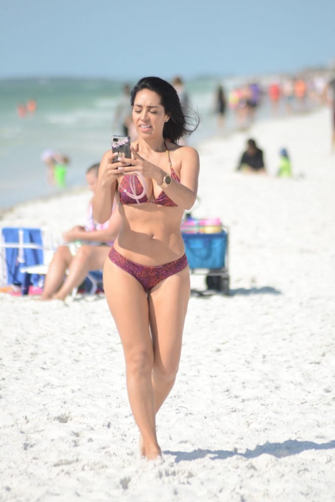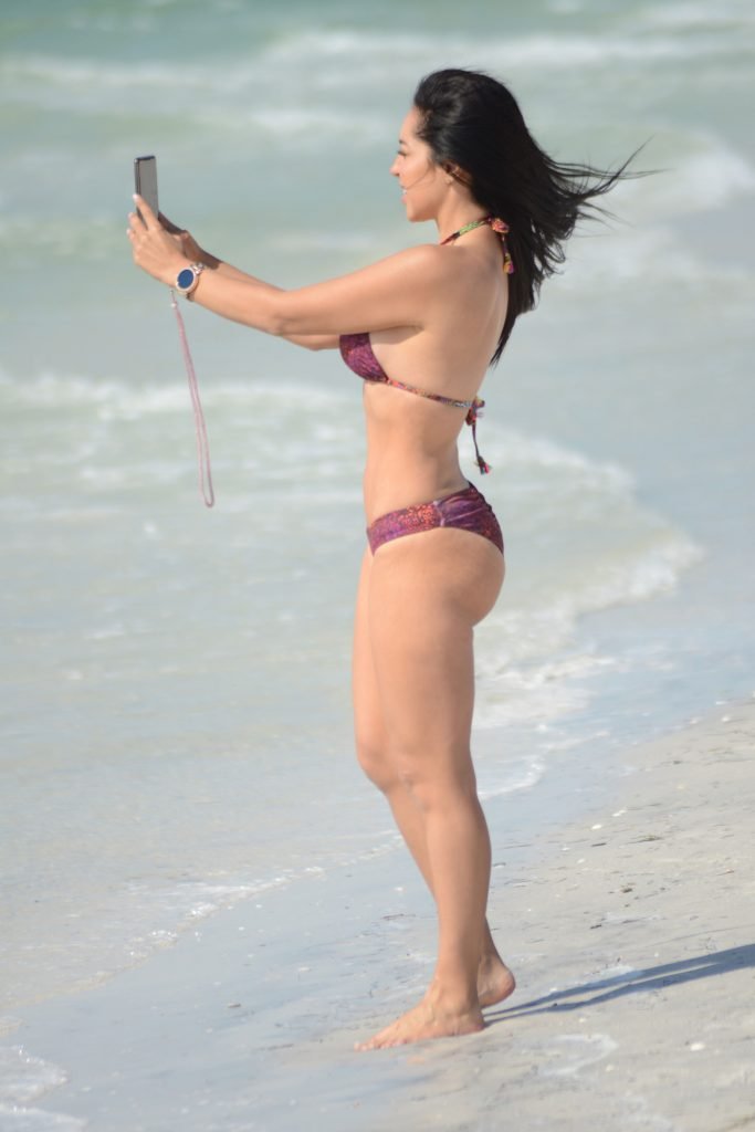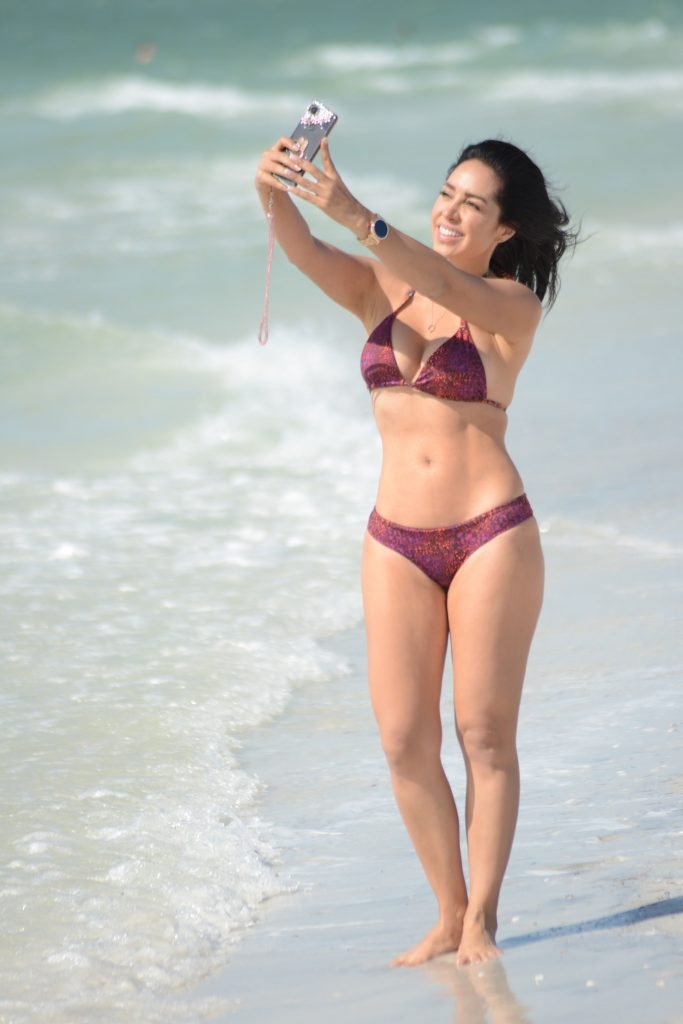 Тонированная и подтянутая модель и спортивный комментатор Андреа Калле, 35 лет, снимает видео и делает селфи для своих поклонников или особенного человека на пляже в Майами, 24.04.2018. Подтянутая комментатор MMA / UFC привлекала внимание, когда шла по пляжу.