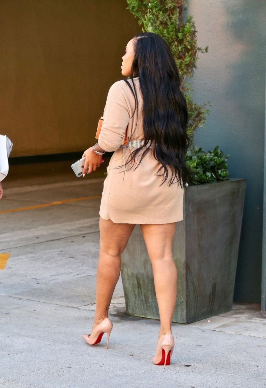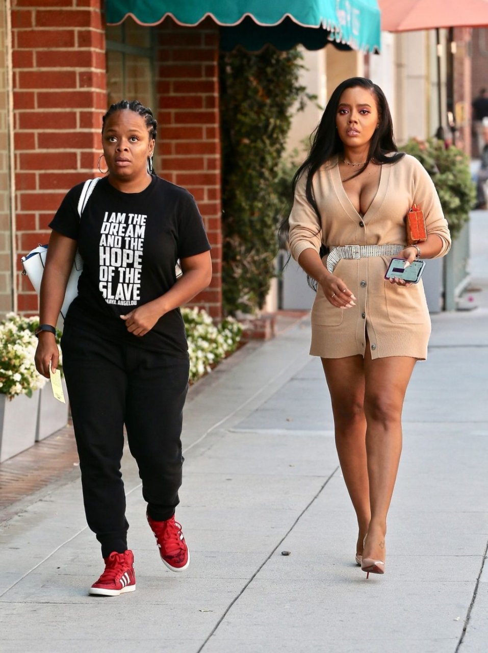 Дизайнер обуви Анжела Симмонс демонстрирует декольте в коротком платье-рубашке во время поездки в медицинское учреждение в Беверли-Хиллз с подругой, 11.09.2019.