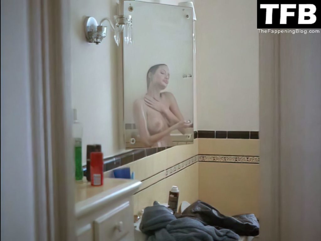 Анджелина Джоли раздевается до бюстгальтера и трусиков перед мужчиной, а затем мы видим её грудь во время душа без лифчика и отражение в зеркале ванной комнаты.