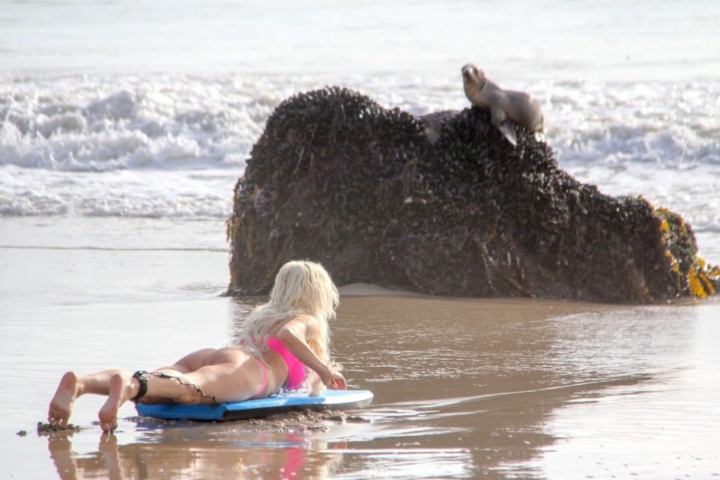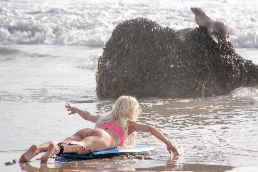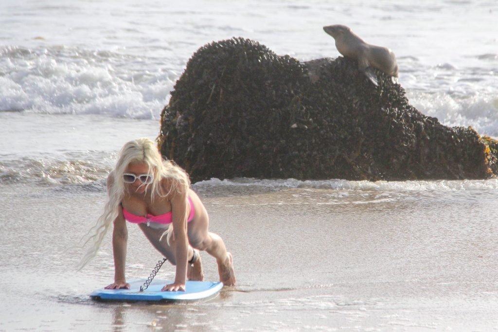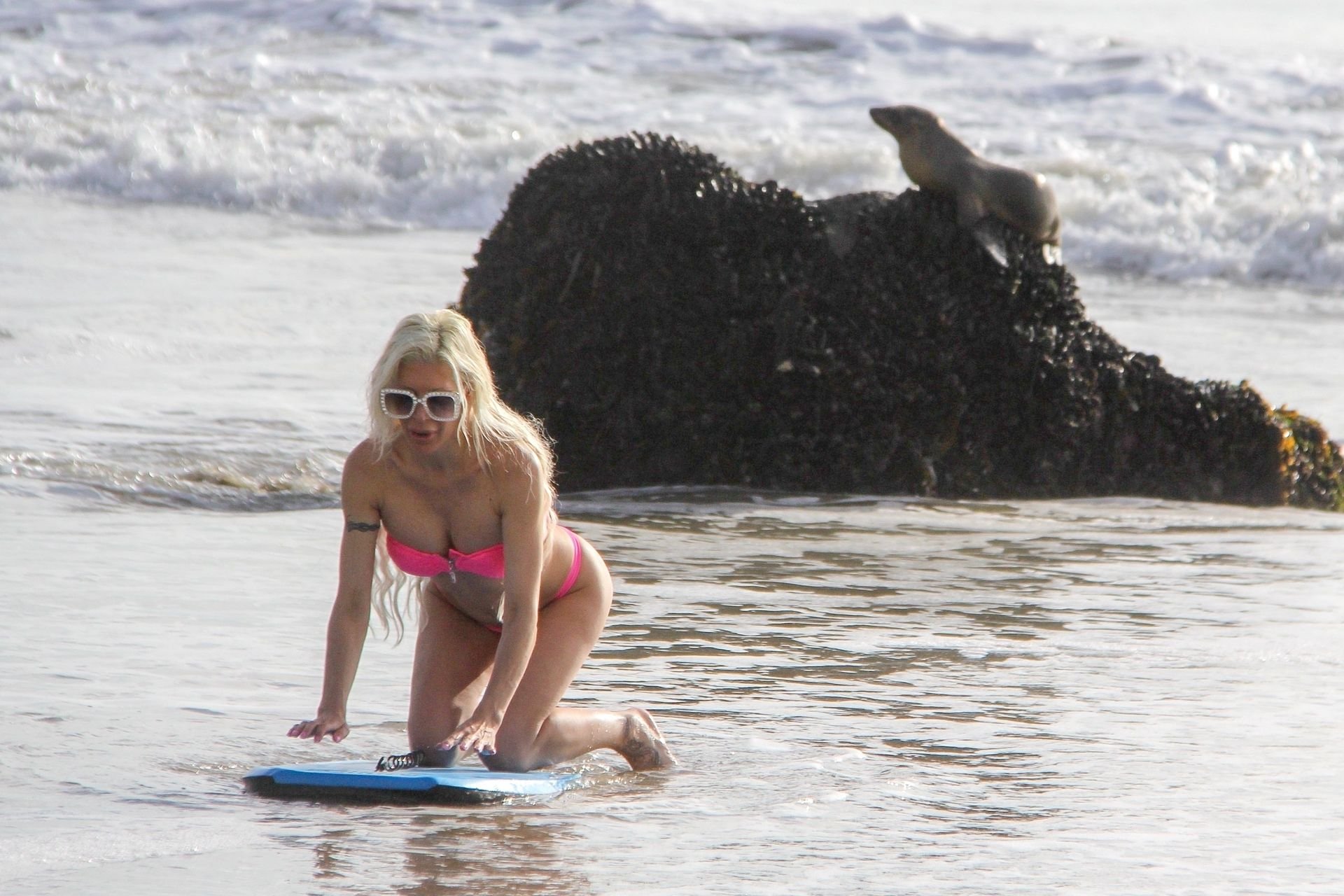 Блондинка Анджелика “Френчи” Морган была замечена в розовом бикини на пляже Малибу, демонстрируя свои навыки бодибординга, 01/03/2019.