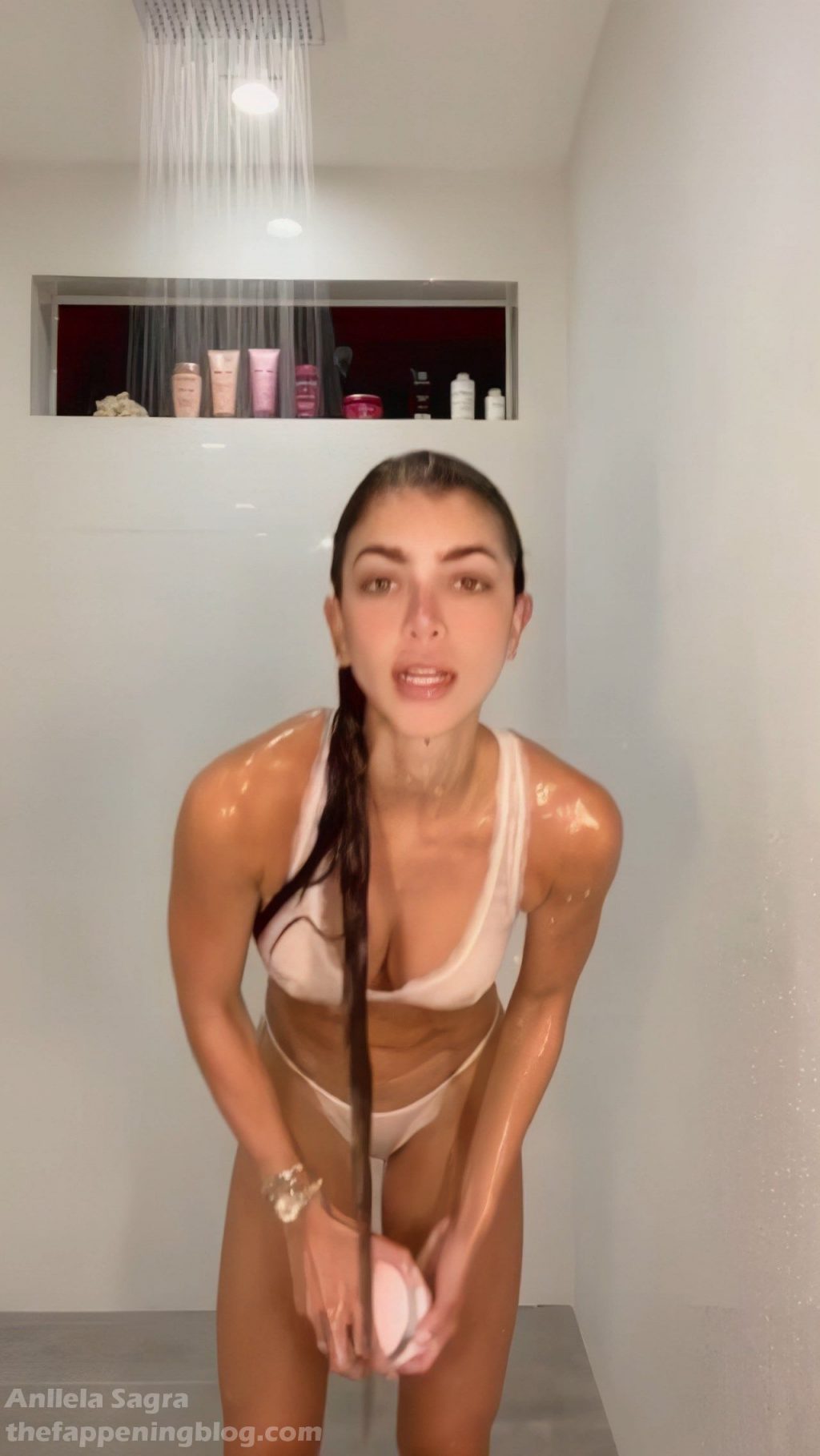 Фитнес-модель Анлелла Сагра демонстрирует свои слегка обнажённые сиськи в кружевном белье, позируя мокрой в душе – Instagram, 09/03/2020.