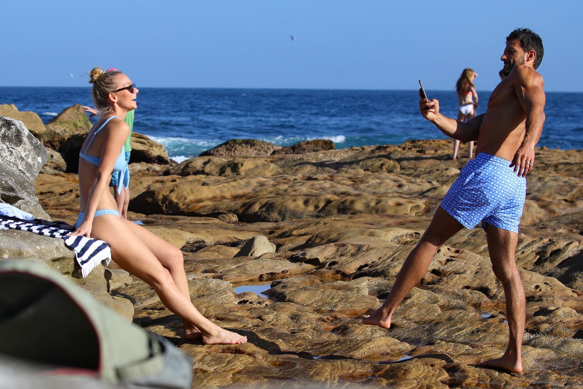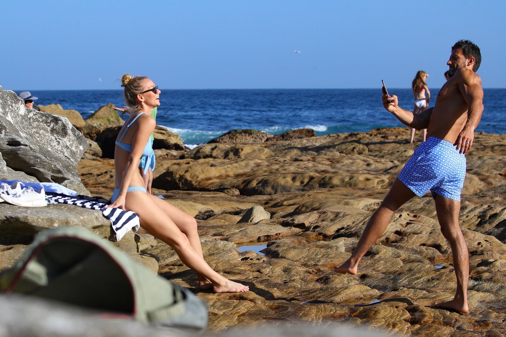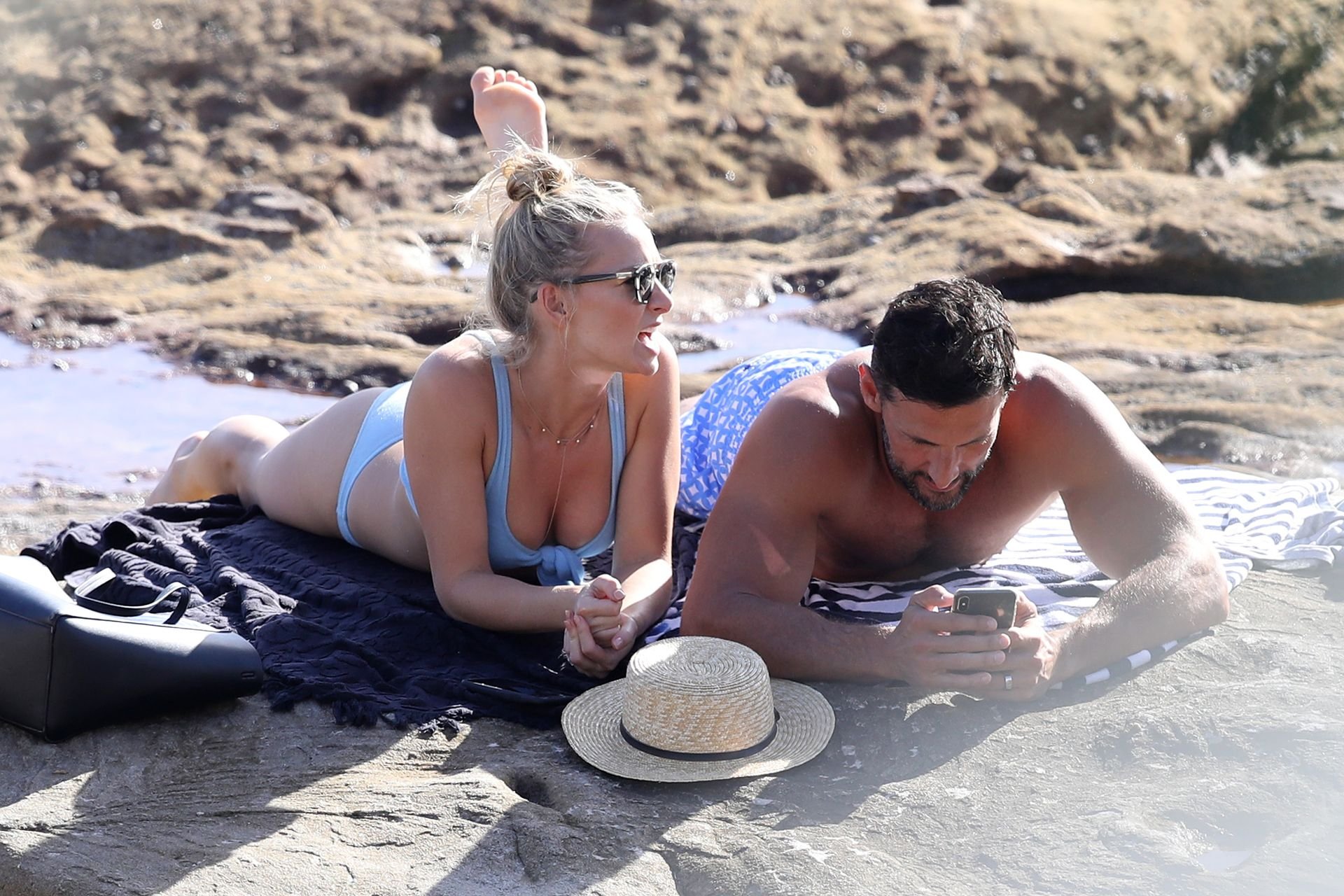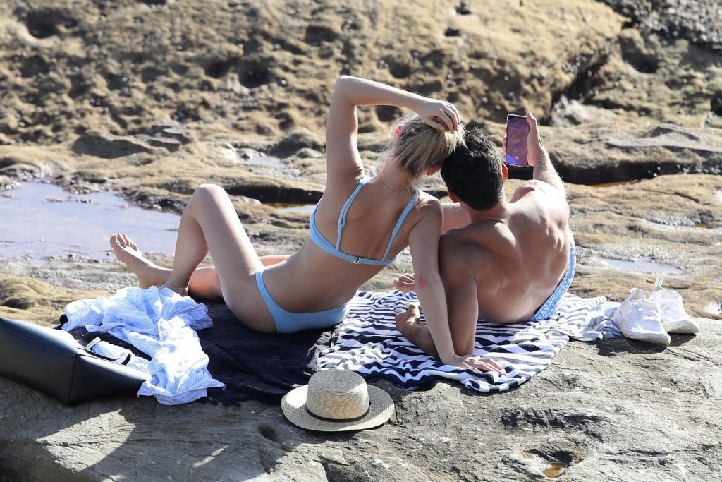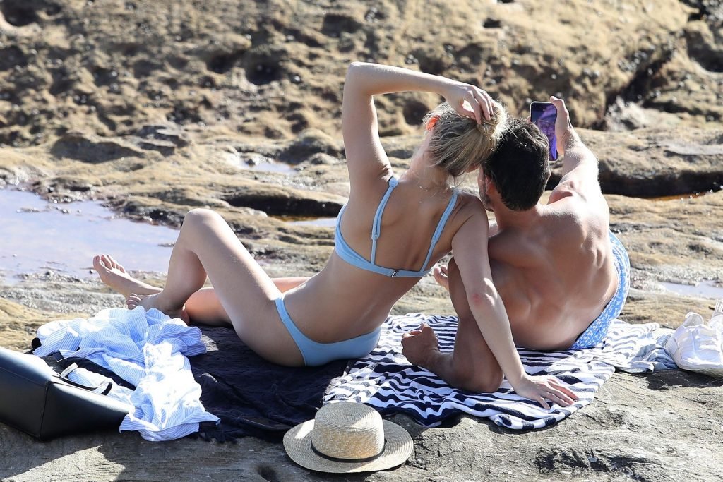 Влюбленная пара Анна Хайнрих и Тим Робардс запечатлены на пляже Бонди в Сиднее, 04/07/2019. 32-летняя австралийская звезда реалити-шоу продемонстрировала свое великолепное тело в синем бикини.