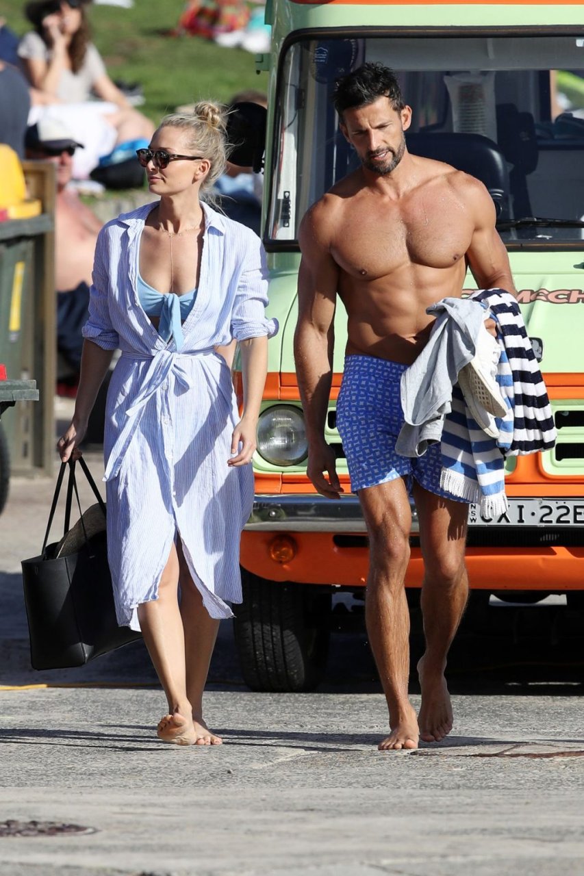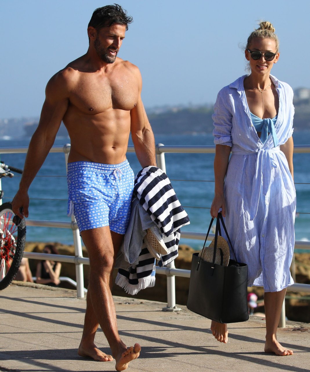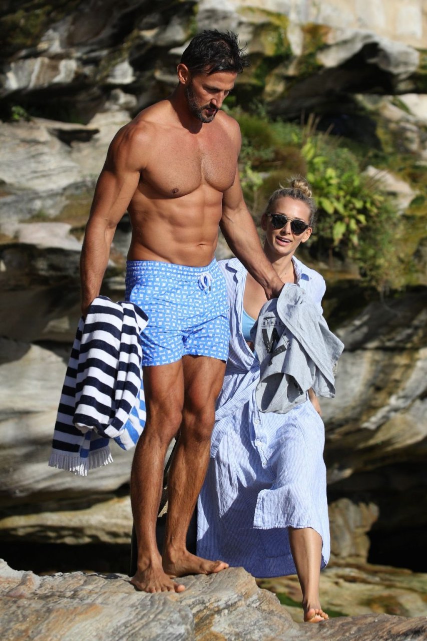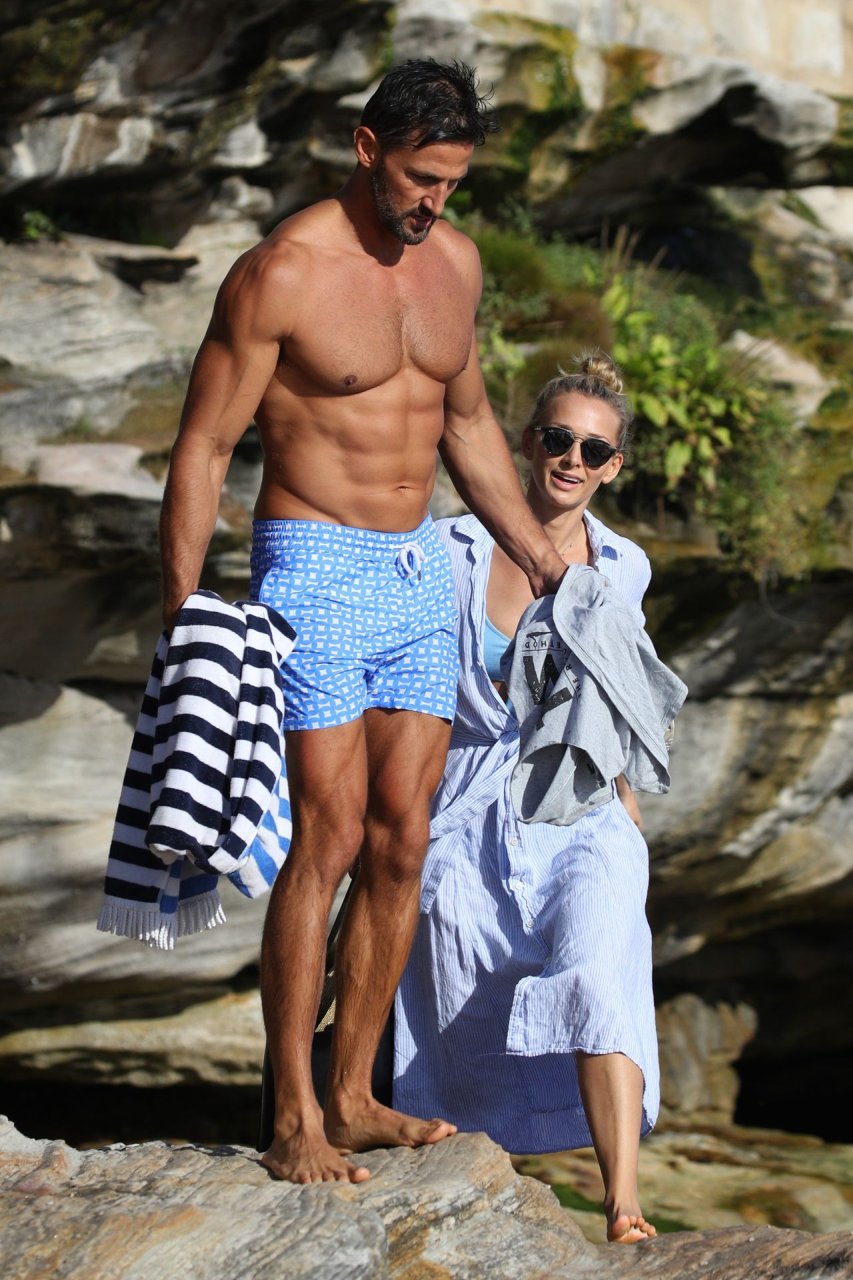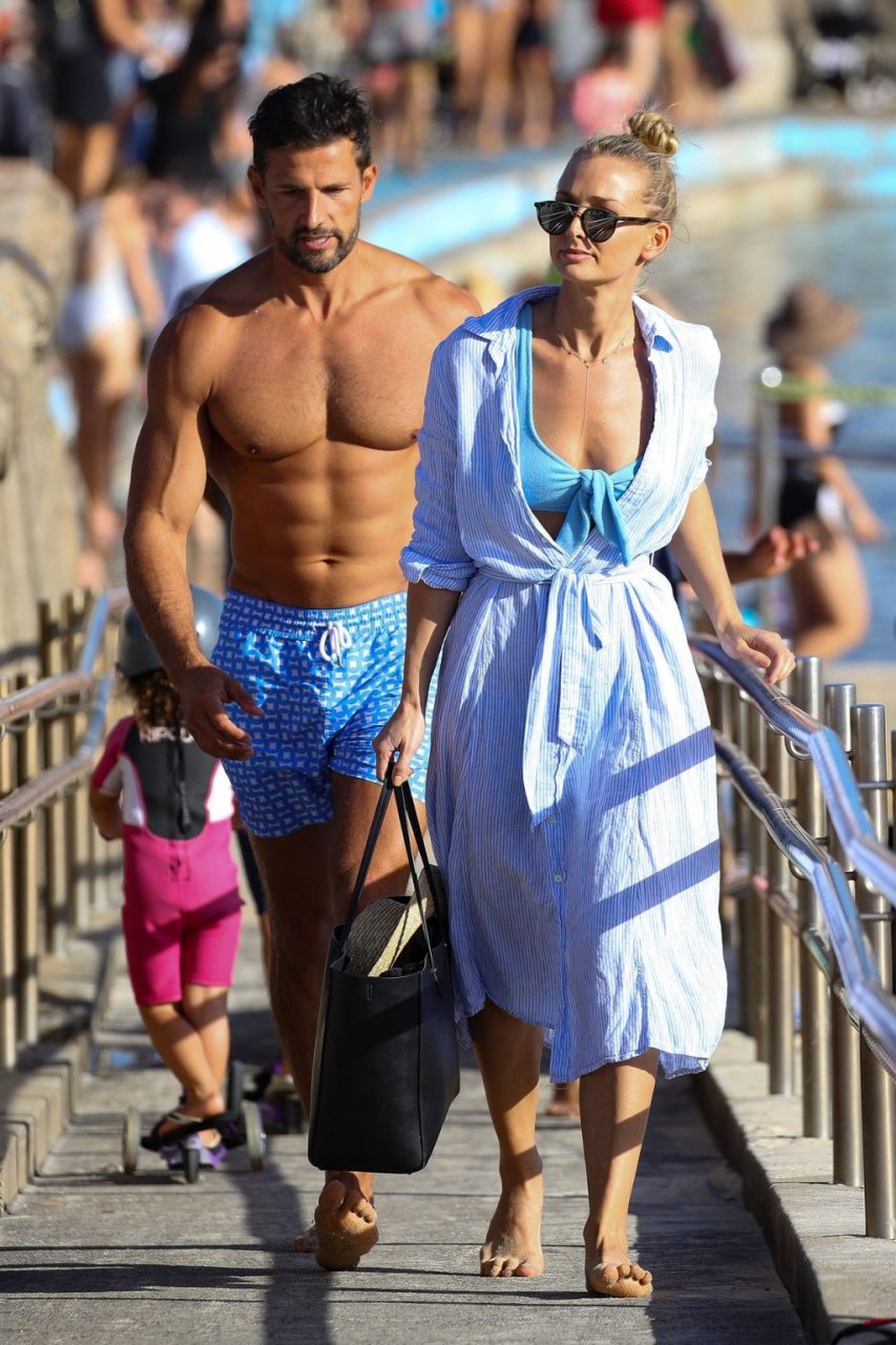 Влюбленная пара Анна Хайнрих и Тим Робардс запечатлены на пляже Бонди в Сиднее, 04/07/2019. 32-летняя австралийская звезда реалити-шоу продемонстрировала свое великолепное тело в синем бикини.