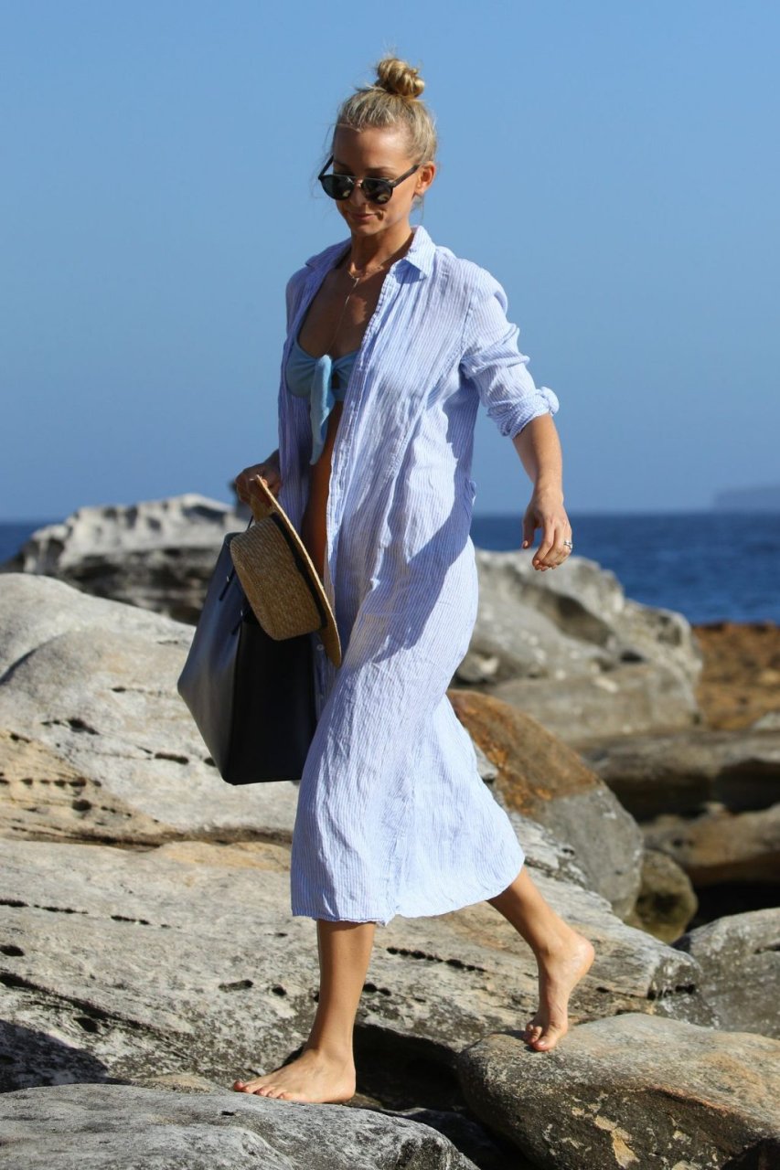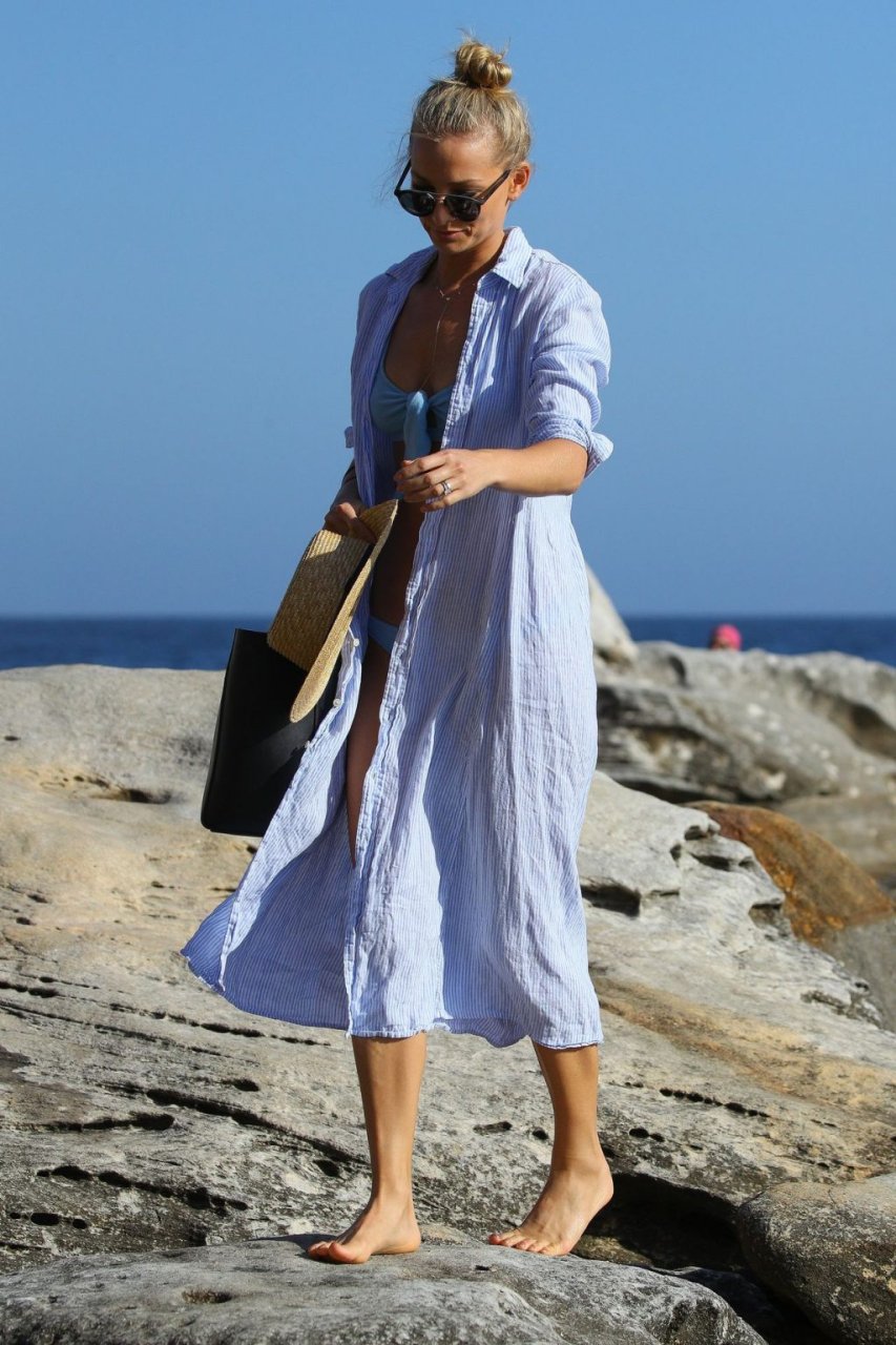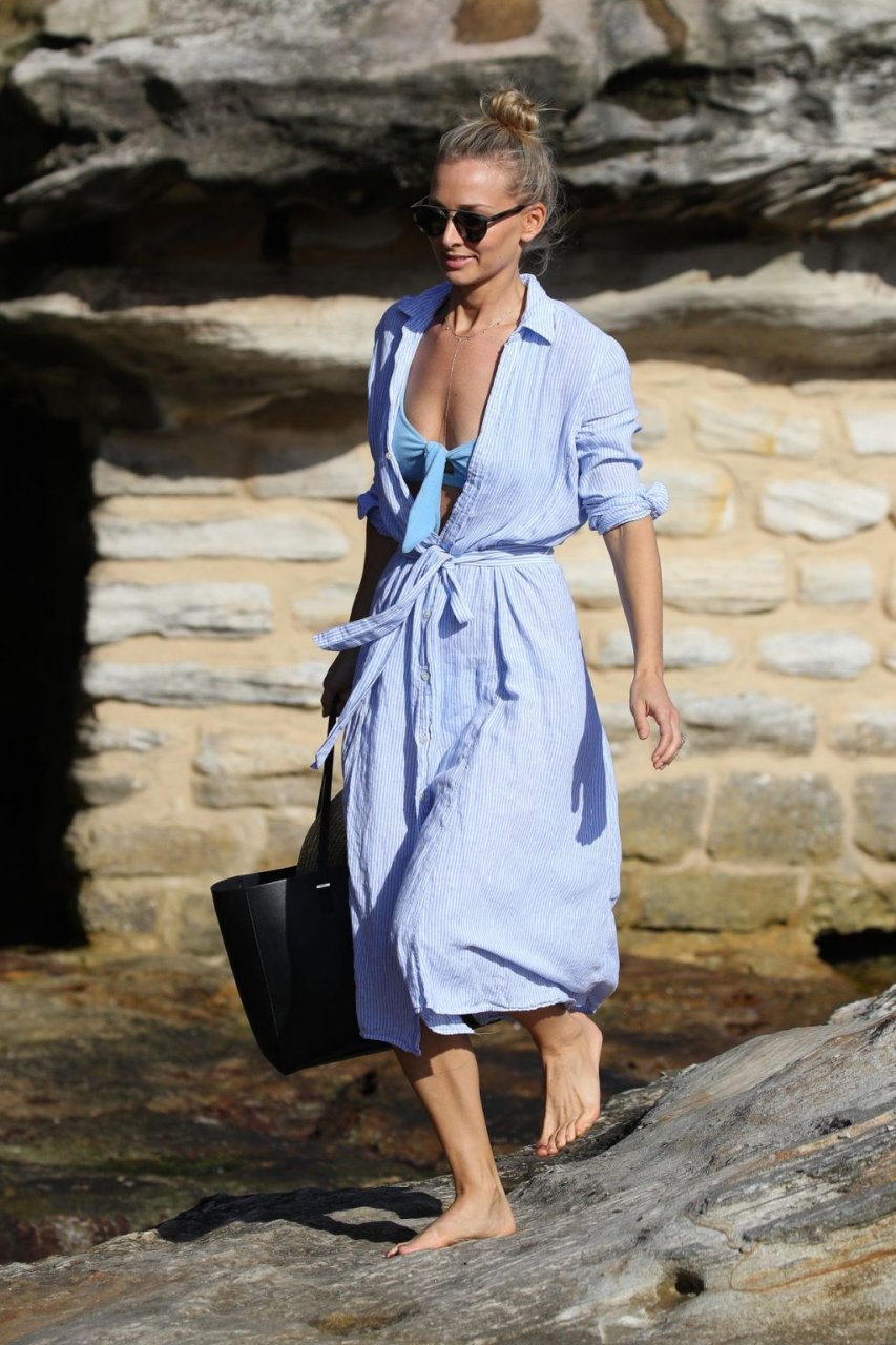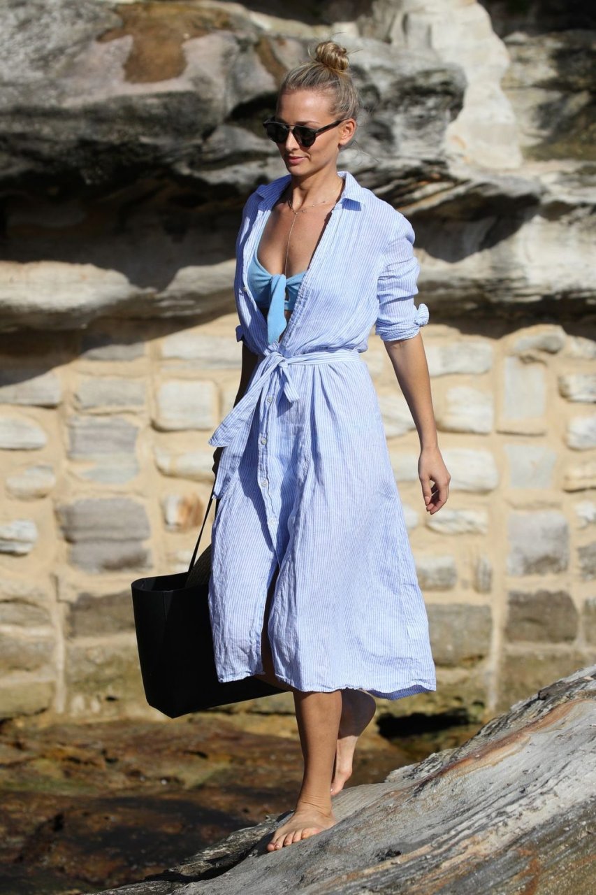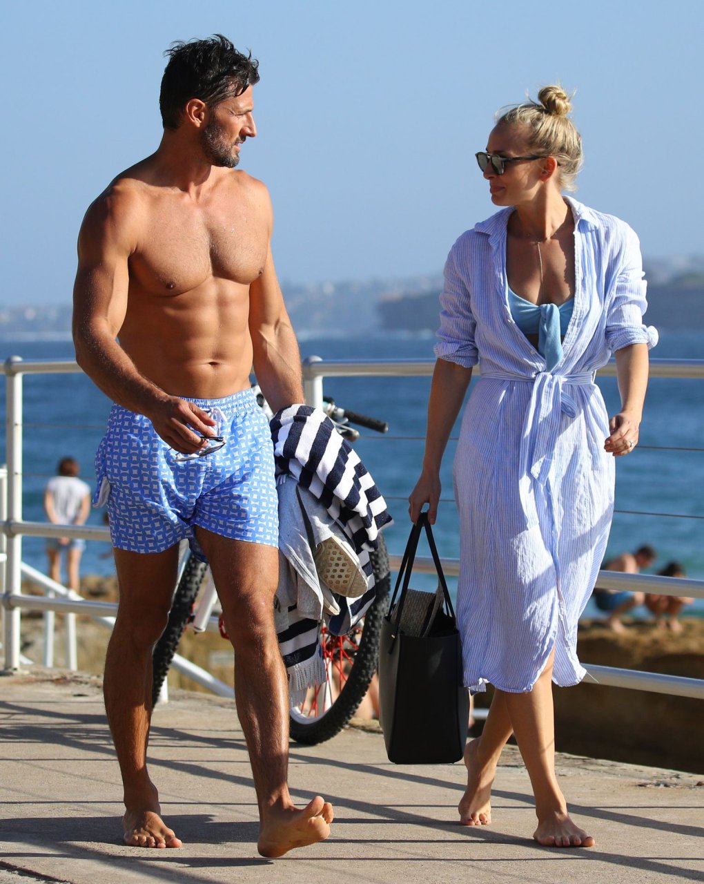 Влюбленная пара Анна Хайнрих и Тим Робардс запечатлены на пляже Бонди в Сиднее, 04/07/2019. 32-летняя австралийская звезда реалити-шоу продемонстрировала свое великолепное тело в синем бикини.