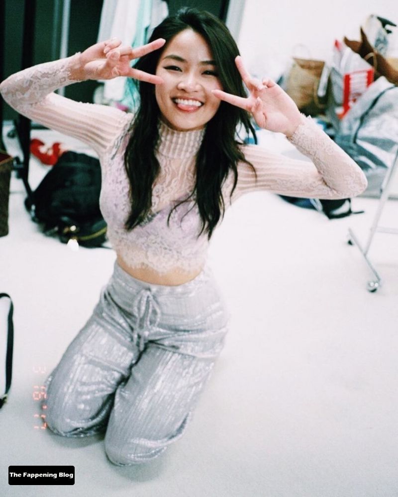 Anna Sawai is seen from across a room as she lies naked on her back on a bed having sex with a guy, one of her breasts in view.