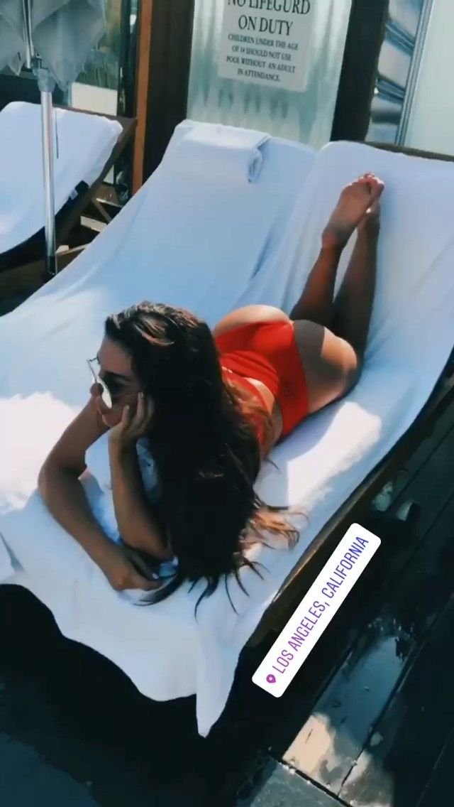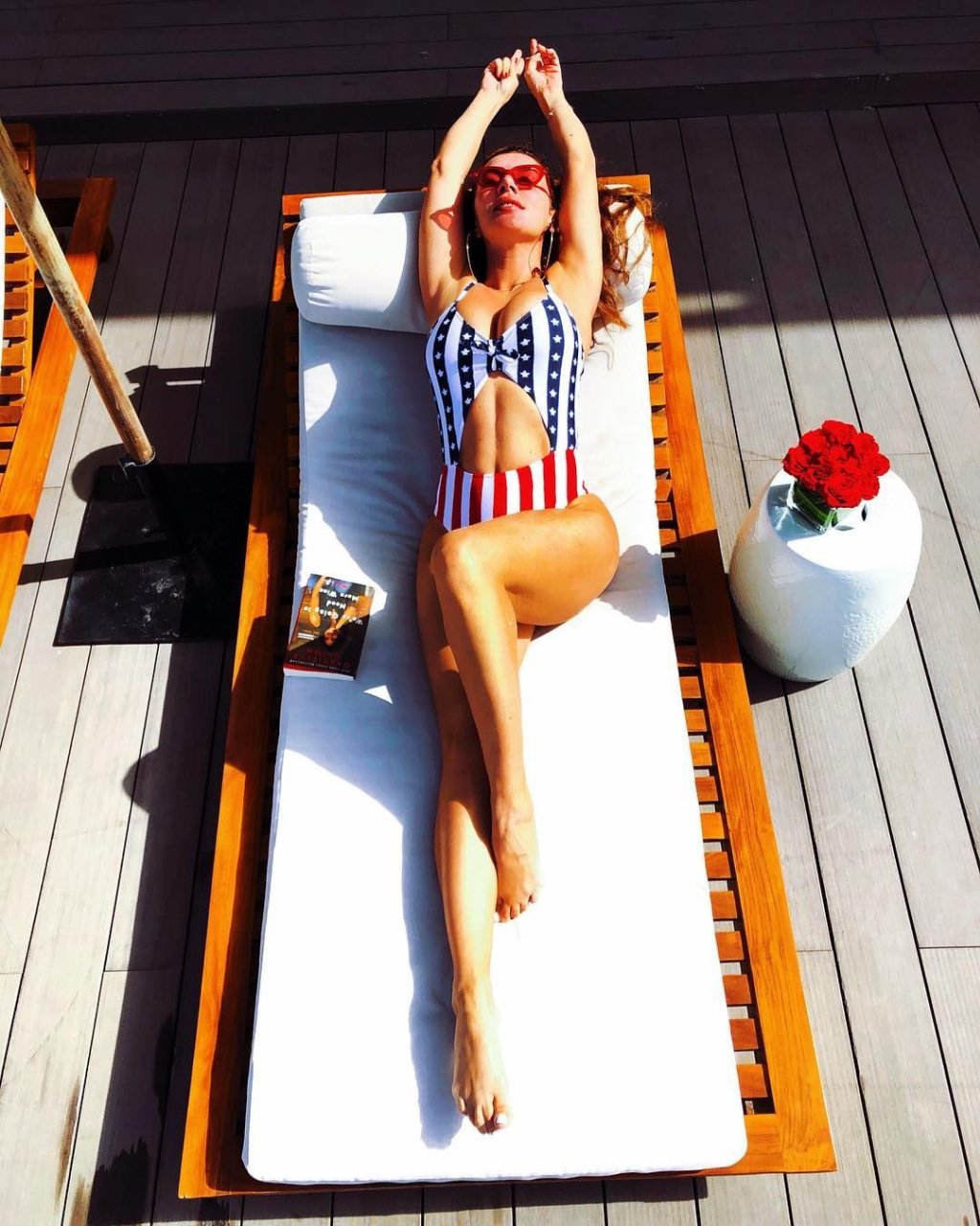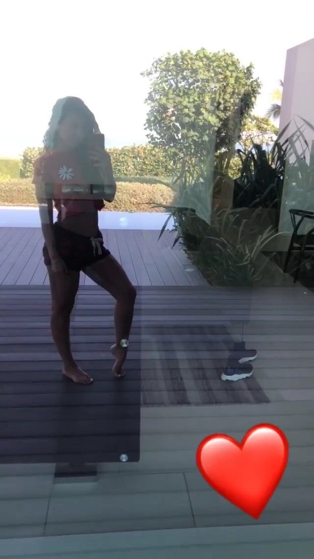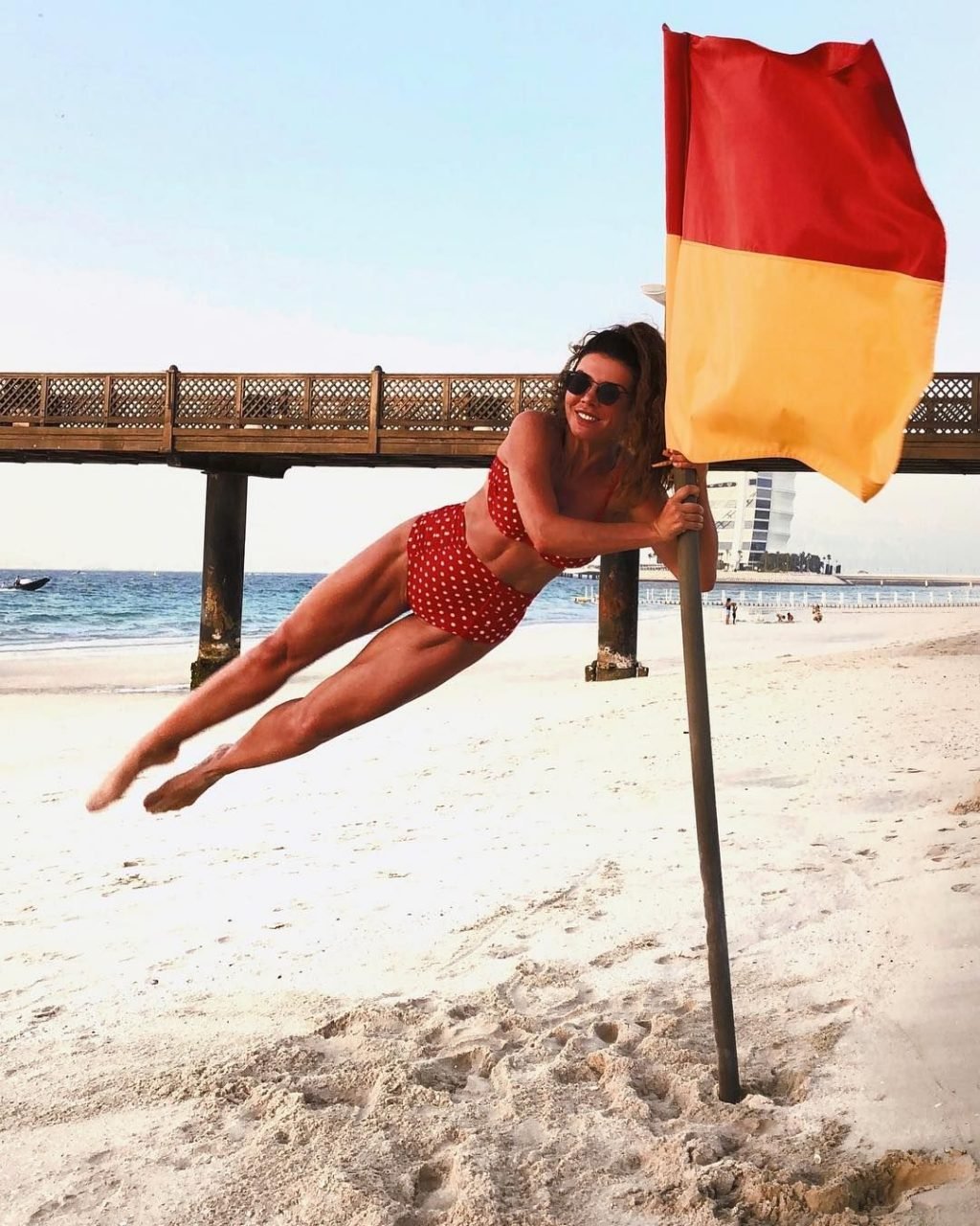На изображении, которым она поделилась с подписчиками в Instagram, вокруг неё была обёрнута пластиковая красная плёнка. Другой снимок, сделанный в то же время, показывает её в топе в стиле баск, который сочетается с пластиковой плёнкой.