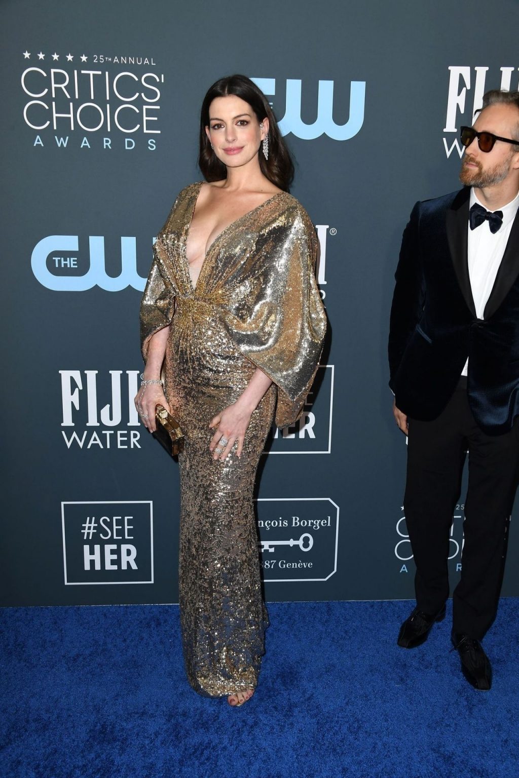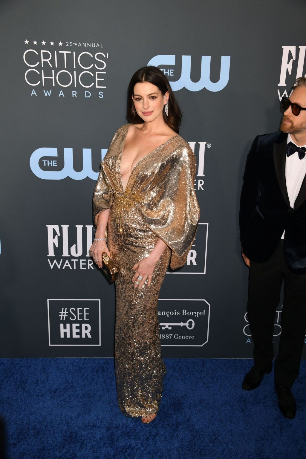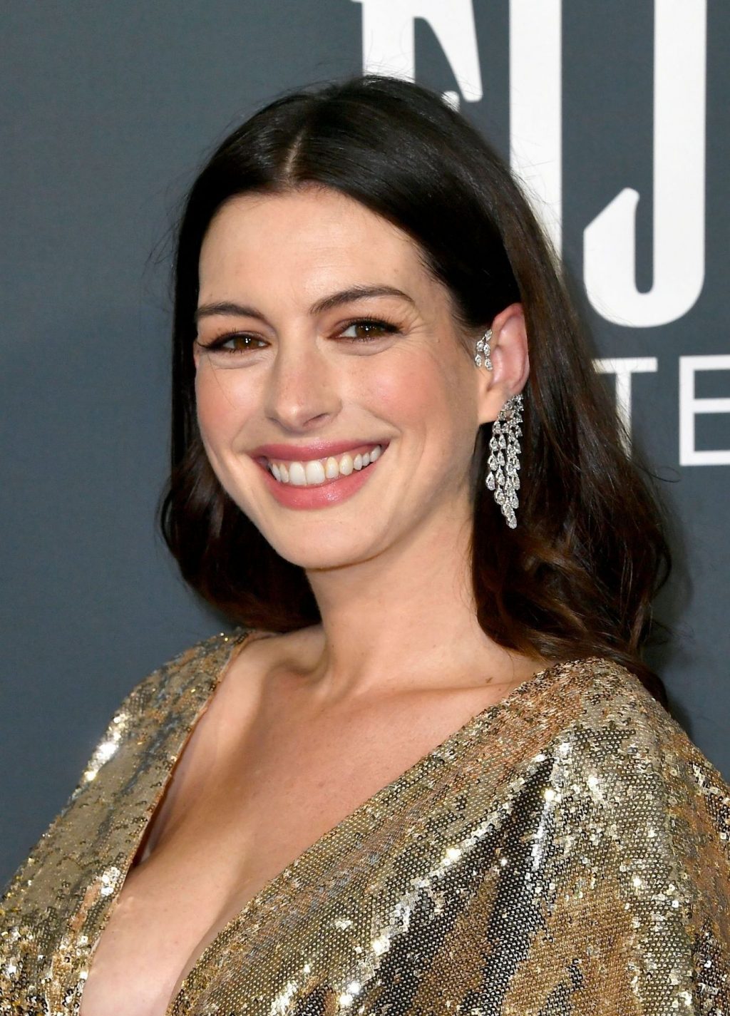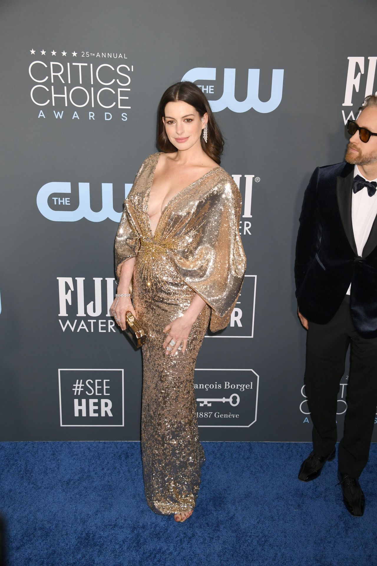 После рождения второго ребенка всего несколько недель назад, звезда The Fappening Энн Хэтэуэй снова появилась на красной дорожке. И сделала это, во всех смыслах, блестяще! Одна из гостей влиятельной премии Critics’ Choice Awards в Санта-Монике появилась в золотом платье Versace с глубоким вырезом. Это один из лучших образов мероприятия!