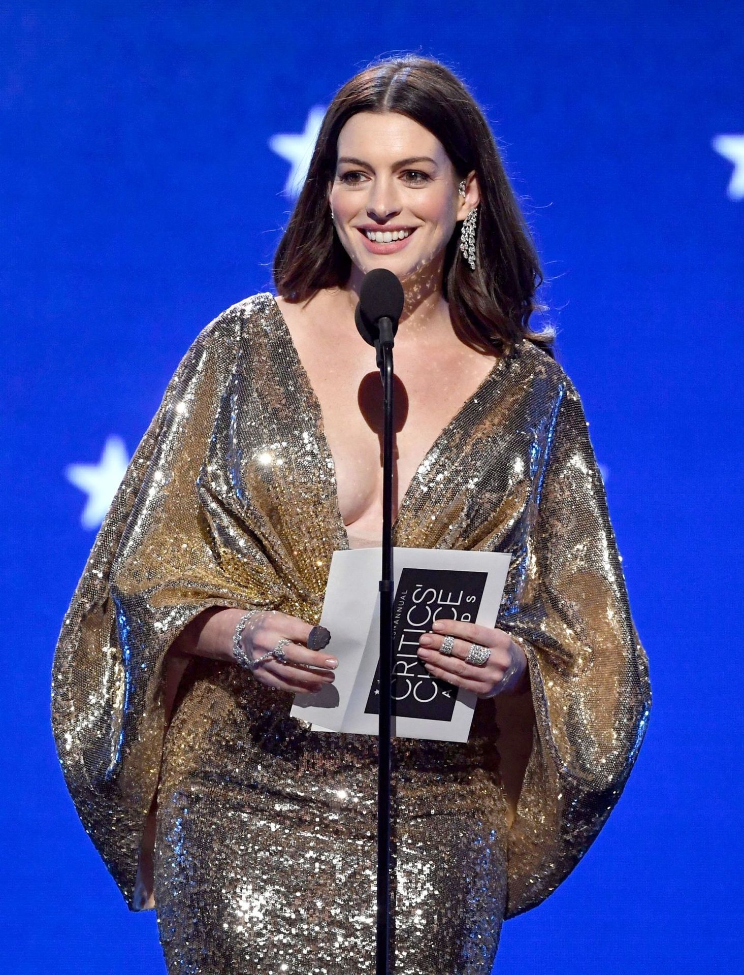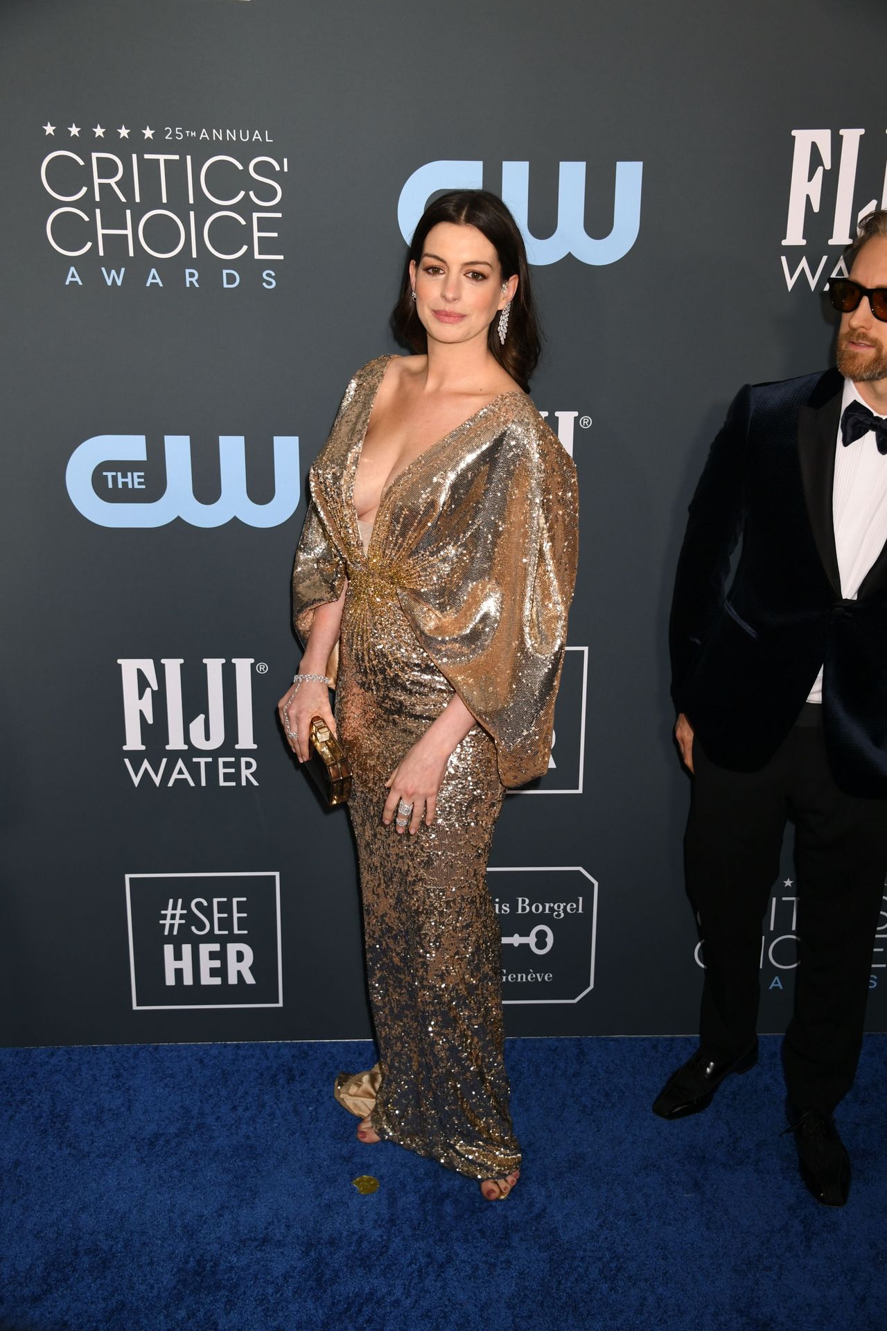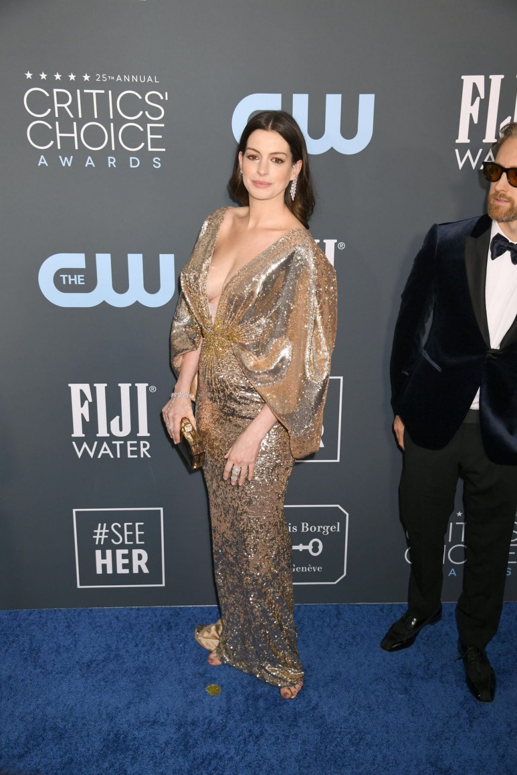 После рождения второго ребенка всего несколько недель назад, звезда The Fappening Энн Хэтэуэй снова появилась на красной дорожке. И сделала это, во всех смыслах, блестяще! Одна из гостей влиятельной премии Critics’ Choice Awards в Санта-Монике появилась в золотом платье Versace с глубоким вырезом. Это один из лучших образов мероприятия!