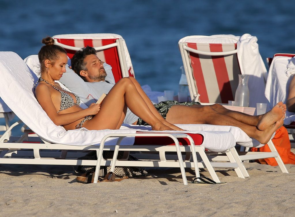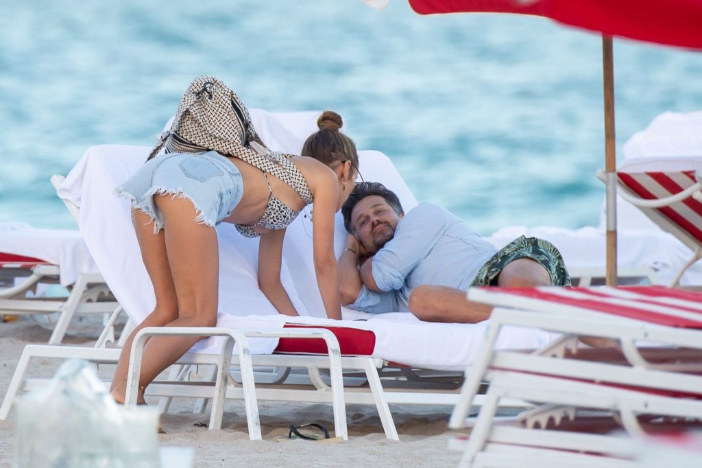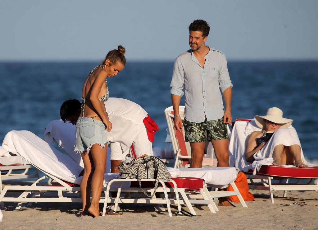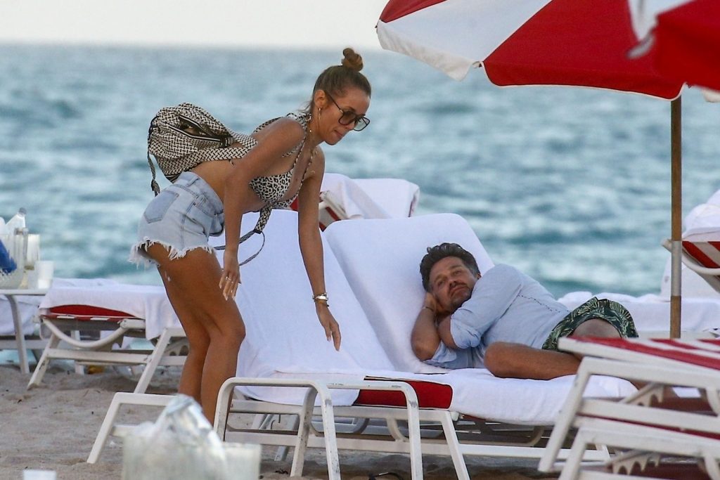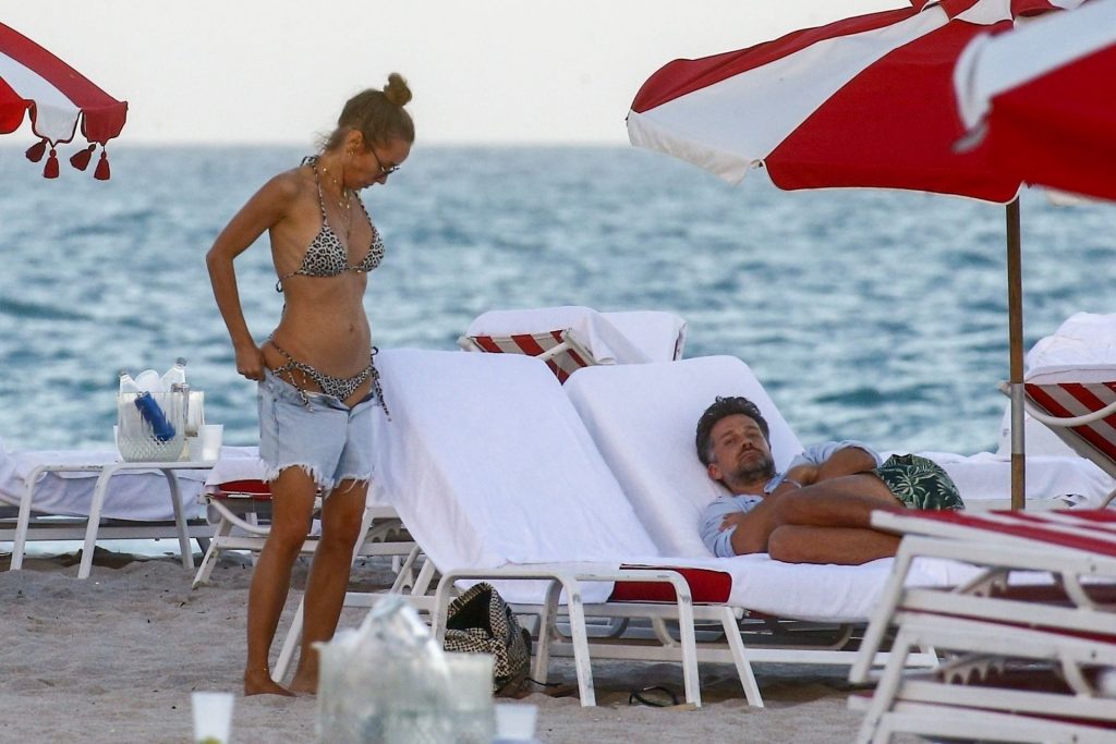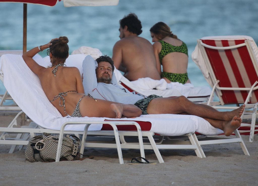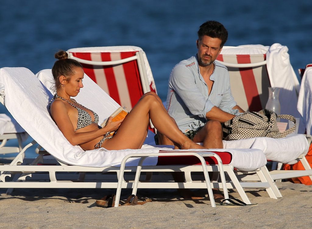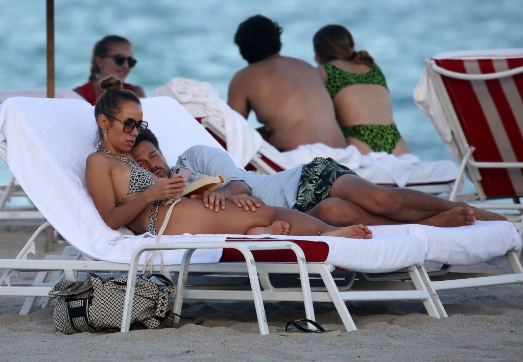 Фитнес-ведущая немецкого телевидения Аннемари Карпендале и её актёрский муж Уэйн Карпендале вместе отдыхают на пляже в Майами-Бич, 01/03/2020. Аннемари надевает свои укороченные джинсы и целует своего возлюбленного, прежде чем улыбнуться нашим камерам.