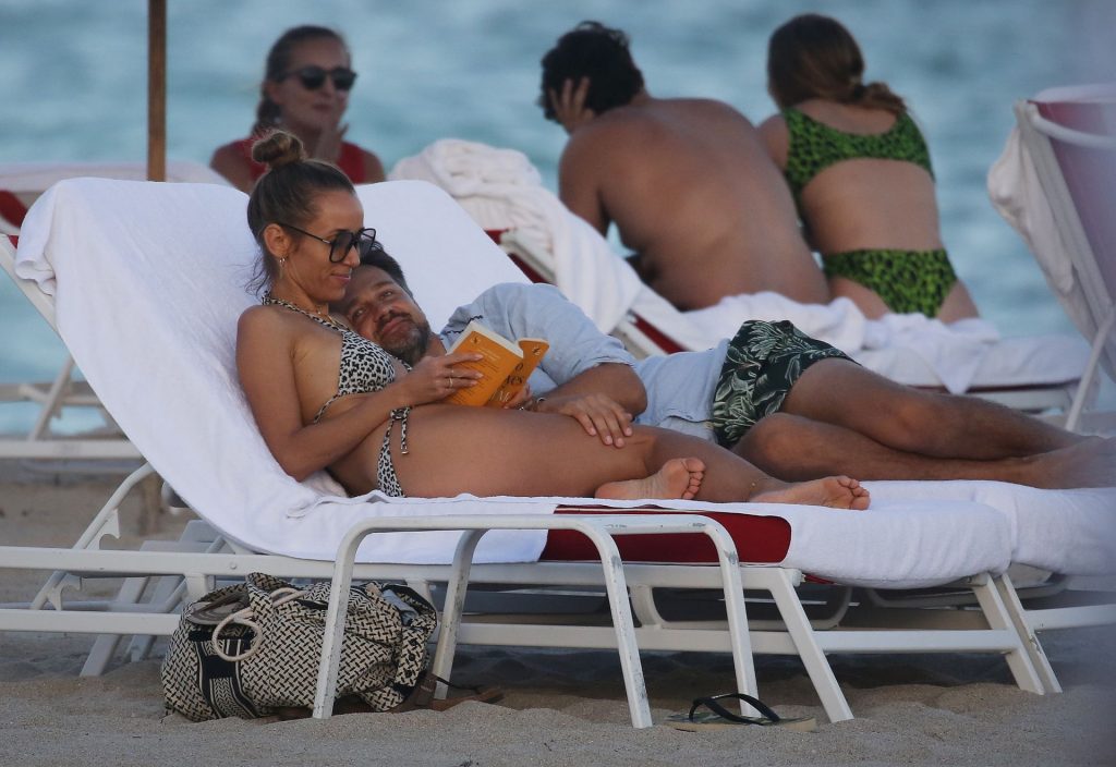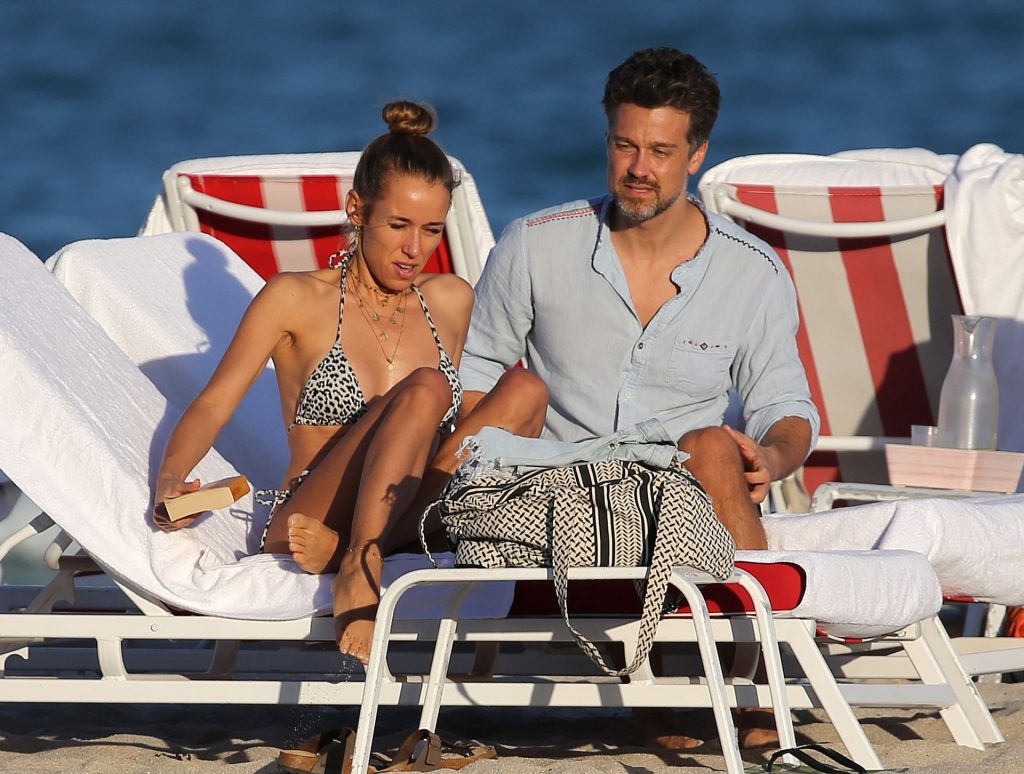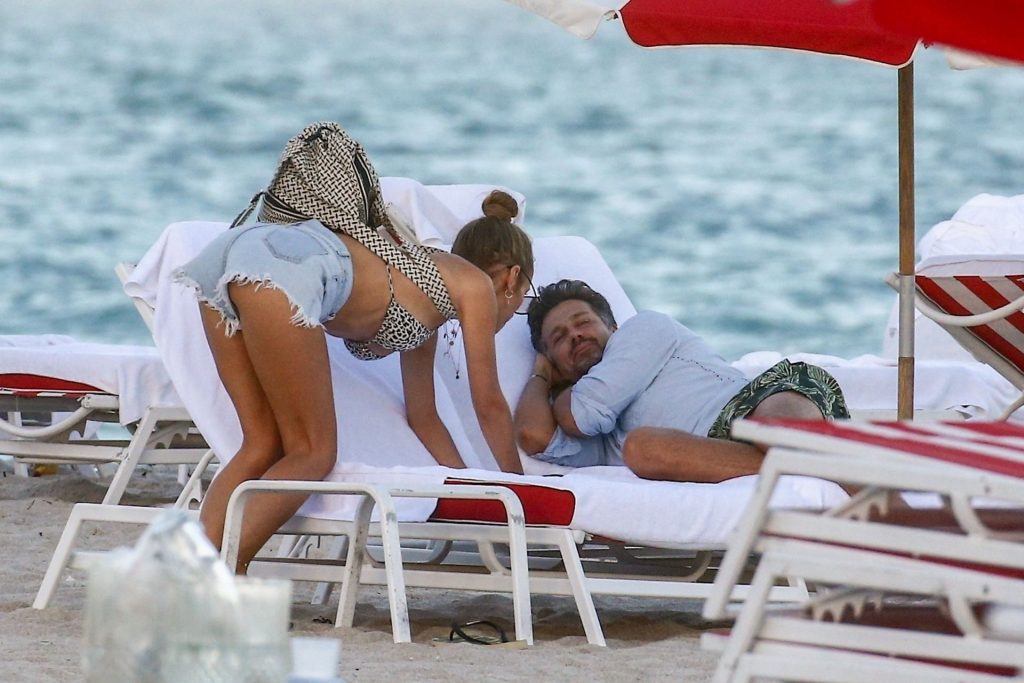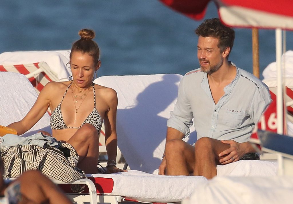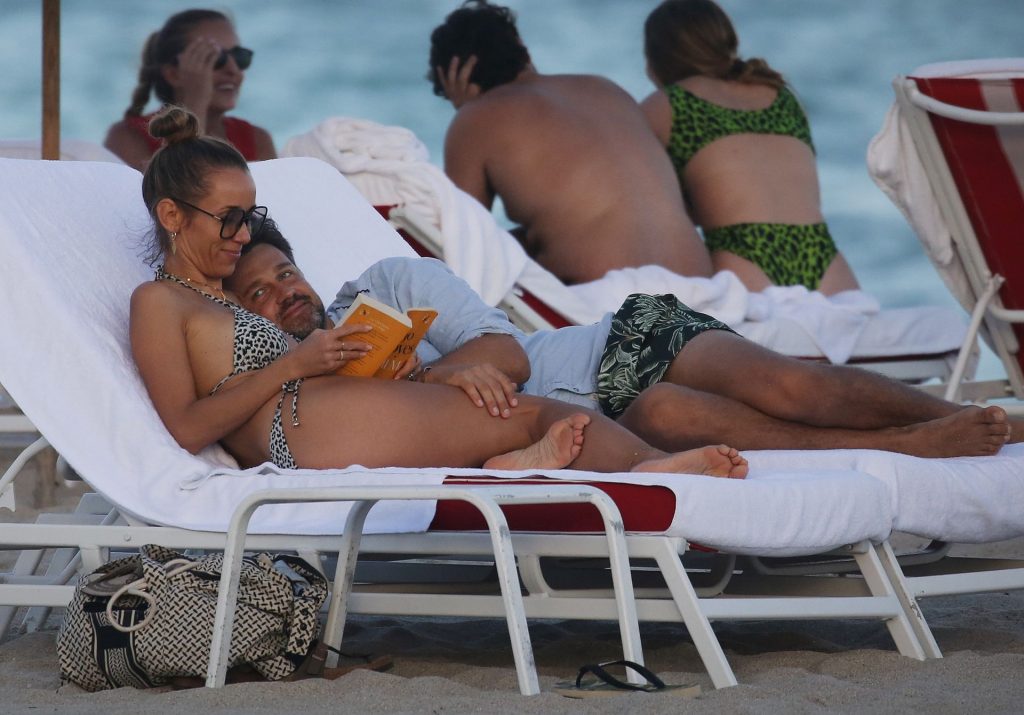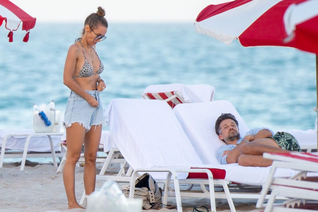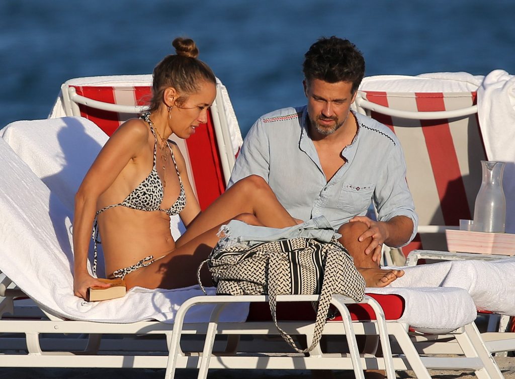 Фитнес-ведущая немецкого телевидения Аннемари Карпендале и её актёрский муж Уэйн Карпендале вместе отдыхают на пляже в Майами-Бич, 01/03/2020. Аннемари надевает свои укороченные джинсы и целует своего возлюбленного, прежде чем улыбнуться нашим камерам.