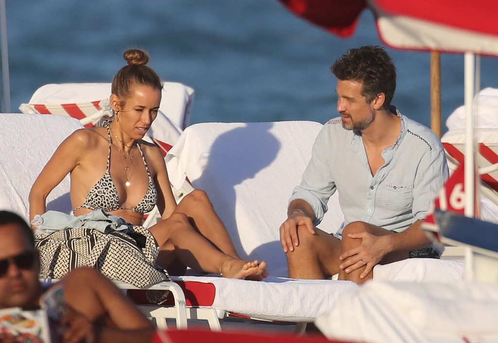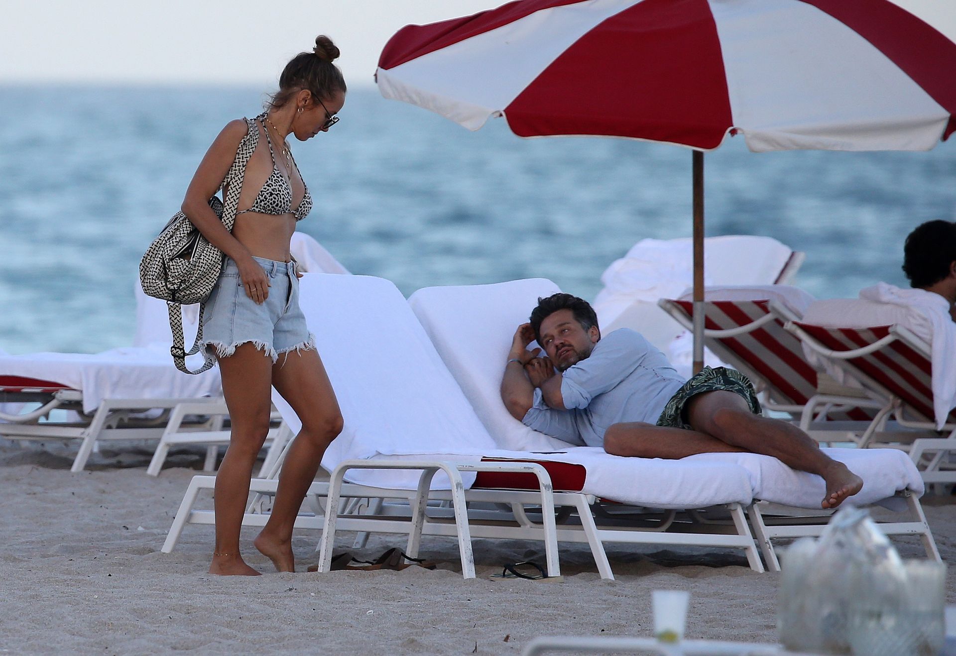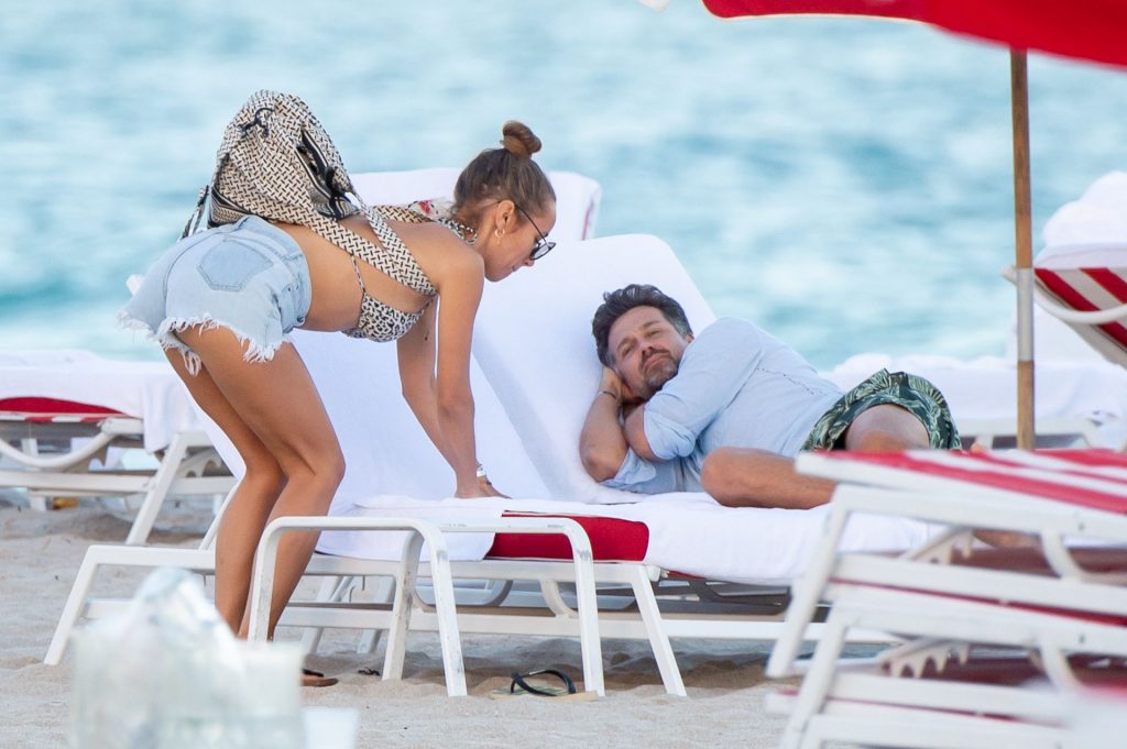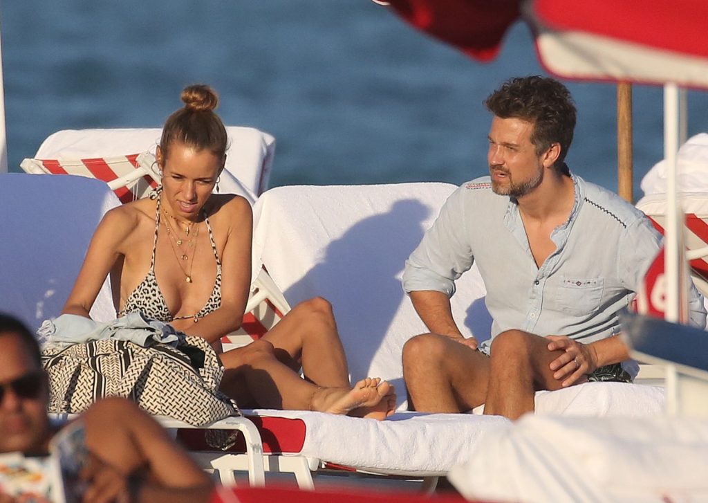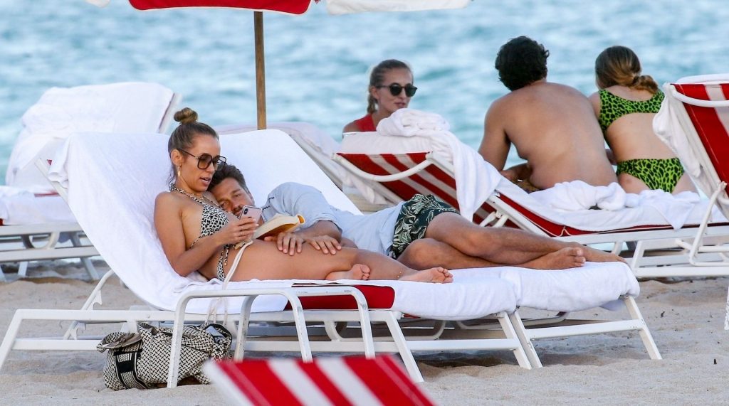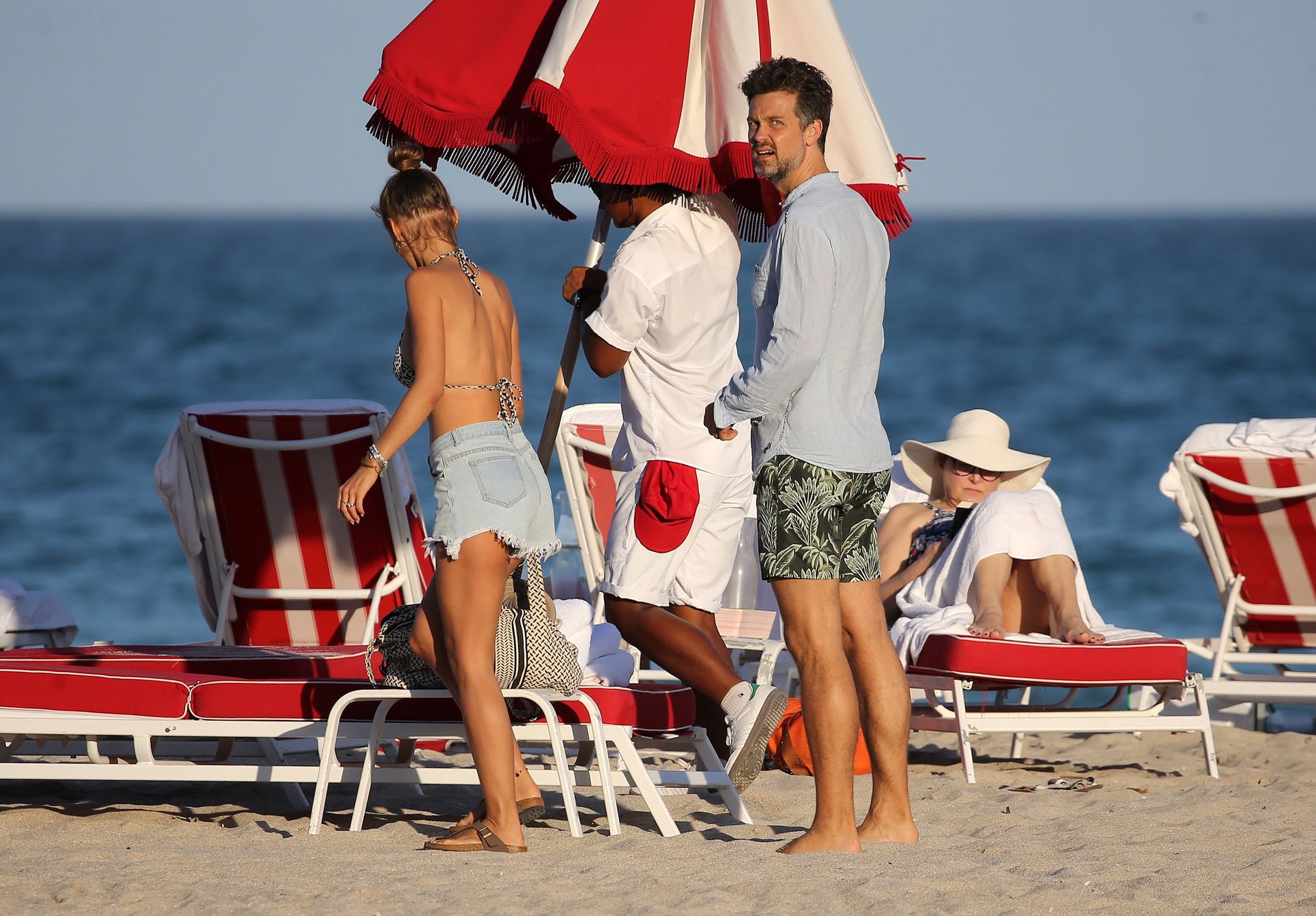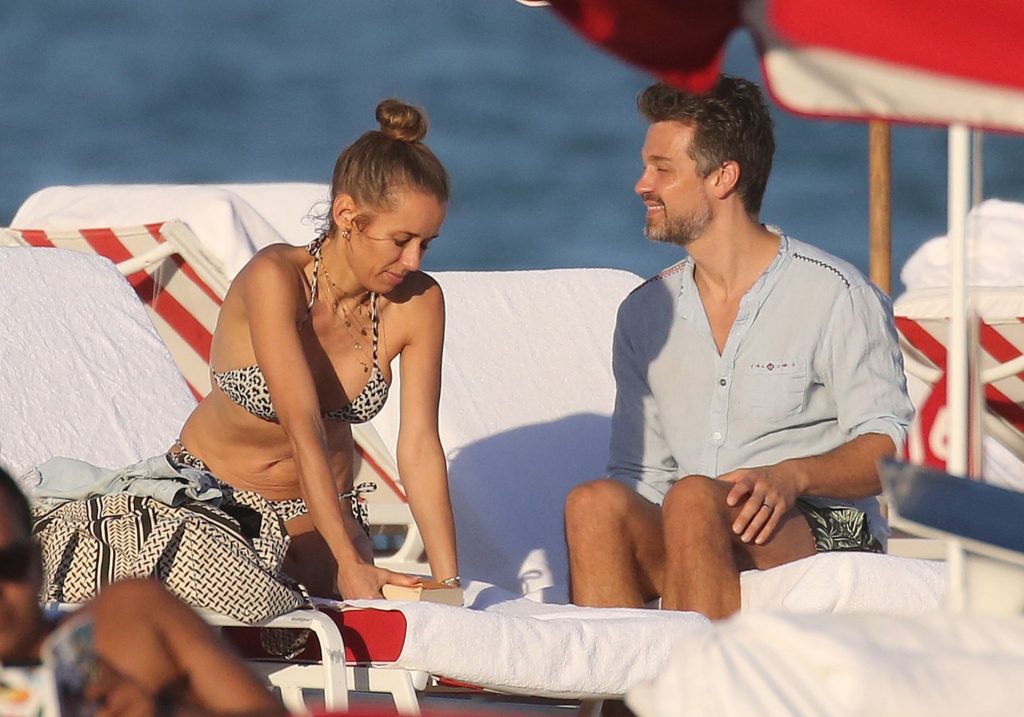 Фитнес-ведущая немецкого телевидения Аннемари Карпендале и её актёрский муж Уэйн Карпендале вместе отдыхают на пляже в Майами-Бич, 01/03/2020. Аннемари надевает свои укороченные джинсы и целует своего возлюбленного, прежде чем улыбнуться нашим камерам.