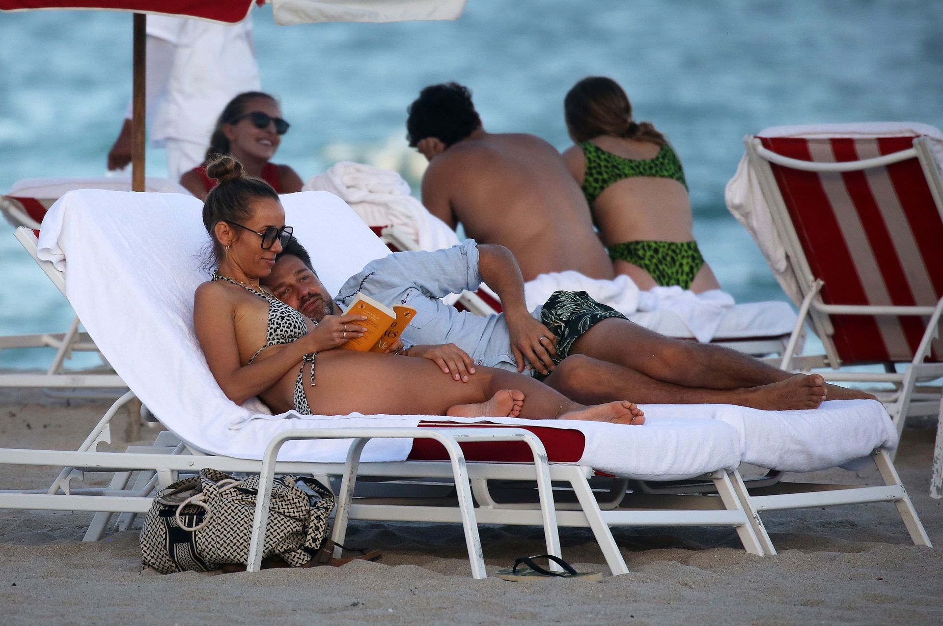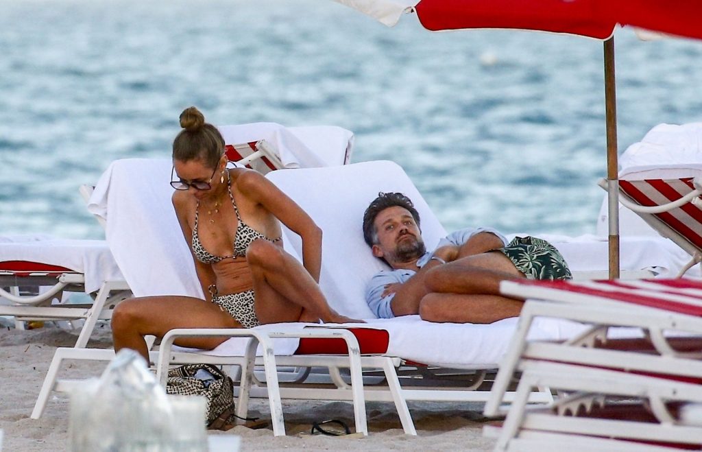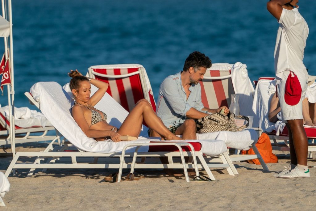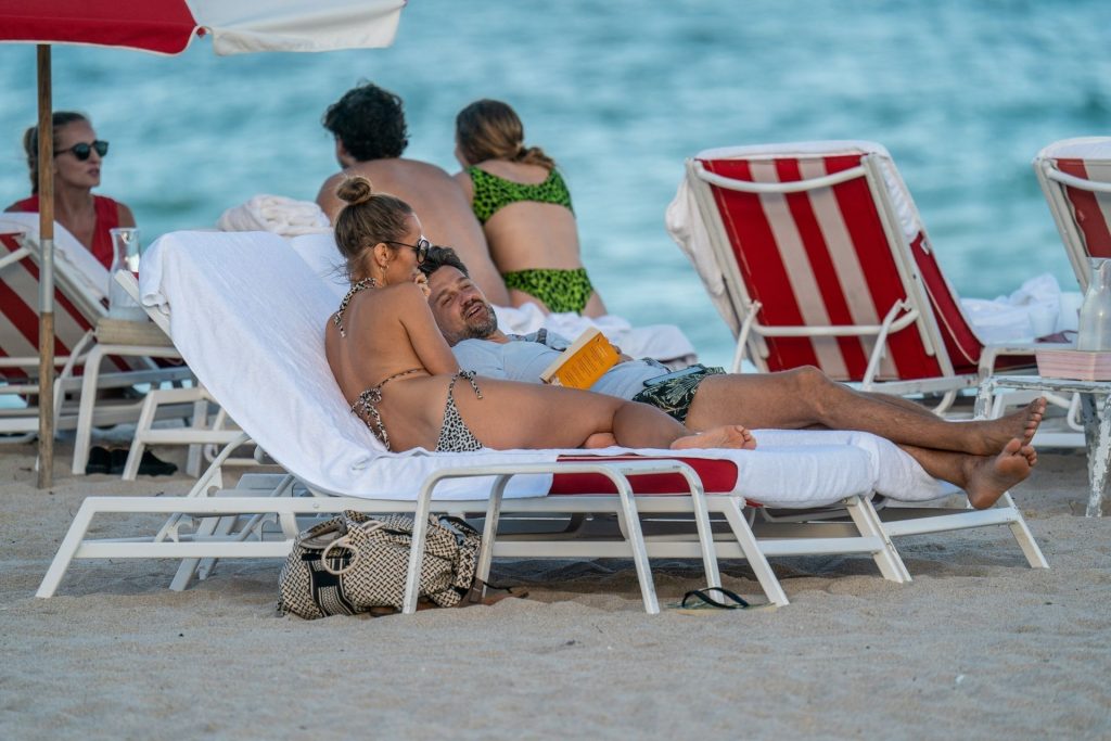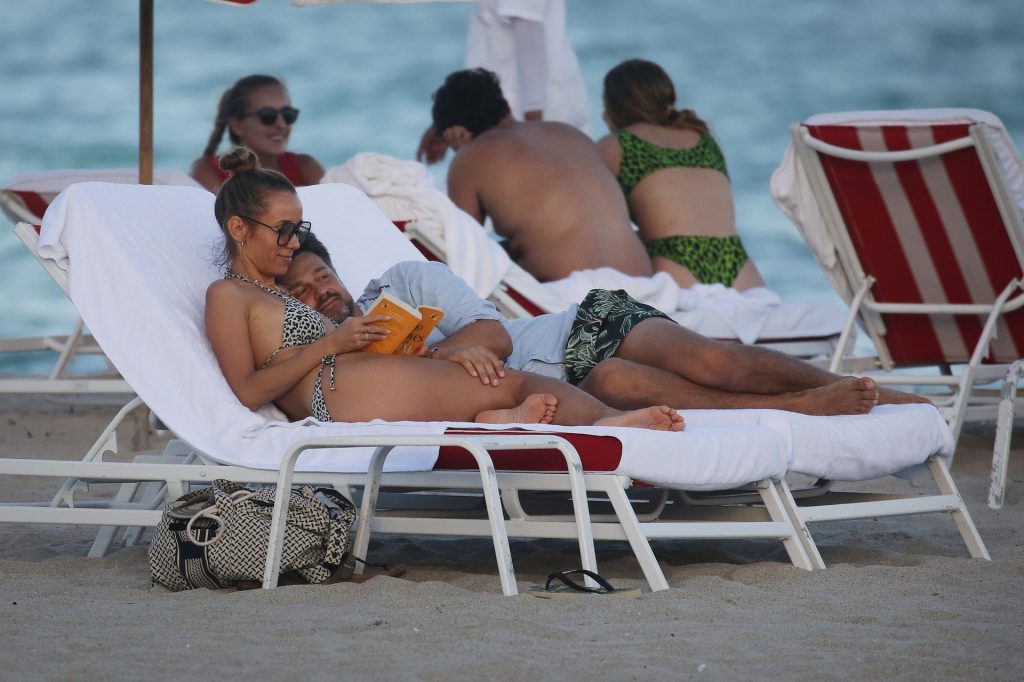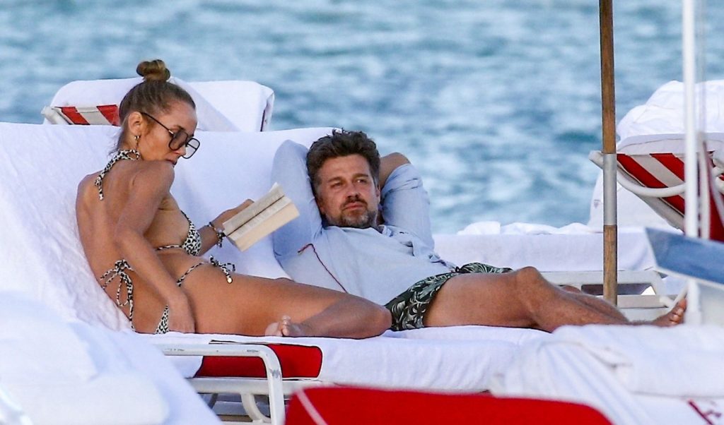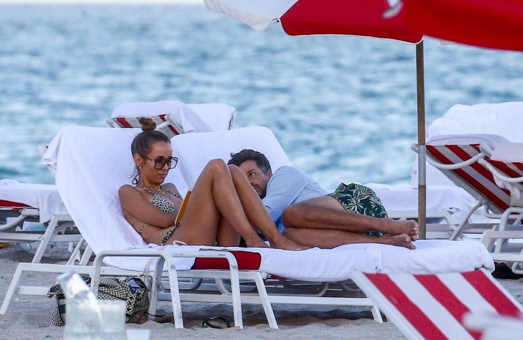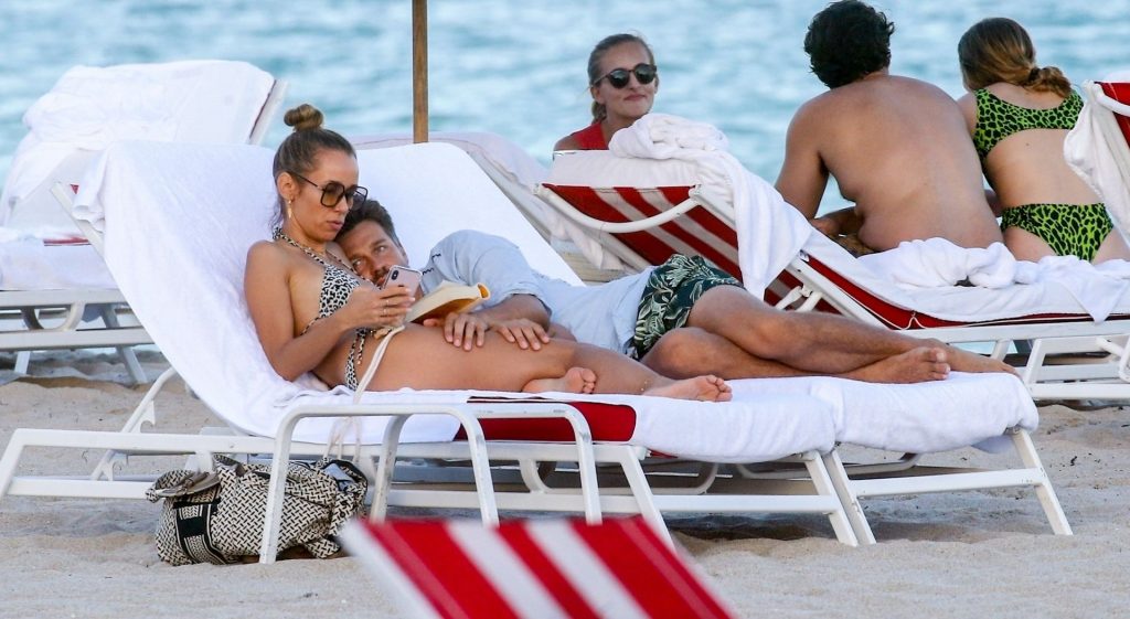 Фитнес-ведущая немецкого телевидения Аннемари Карпендале и её актёрский муж Уэйн Карпендале вместе отдыхают на пляже в Майами-Бич, 01/03/2020. Аннемари надевает свои укороченные джинсы и целует своего возлюбленного, прежде чем улыбнуться нашим камерам.
