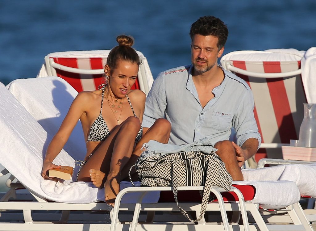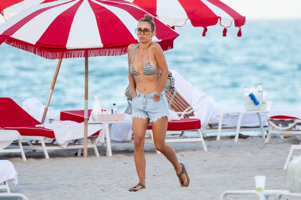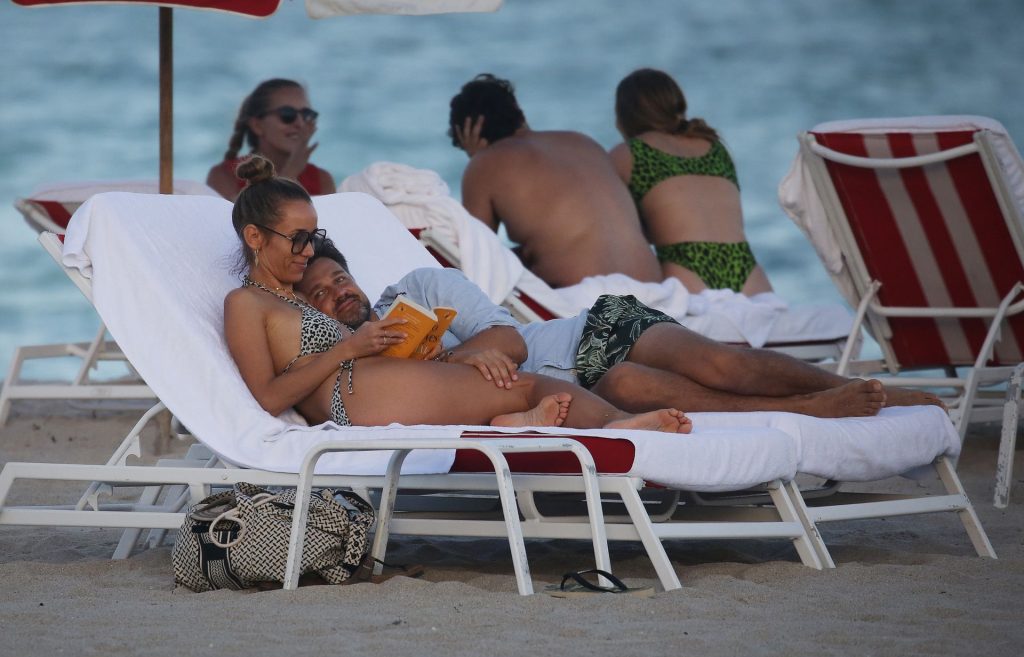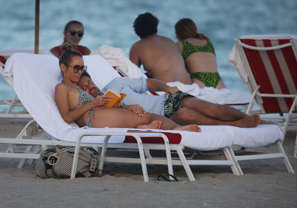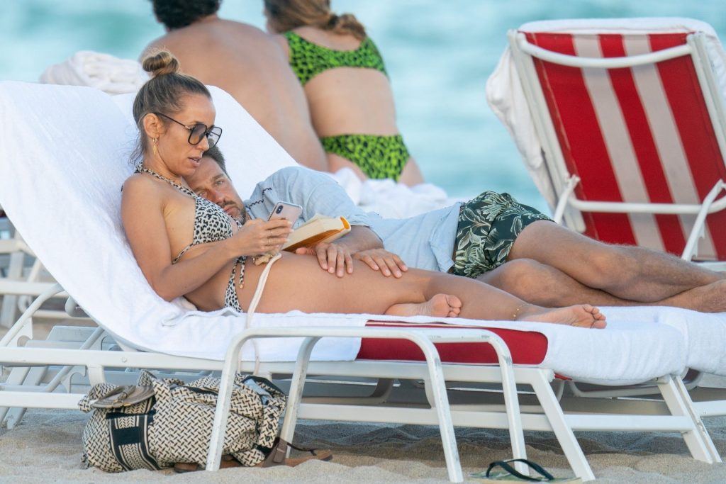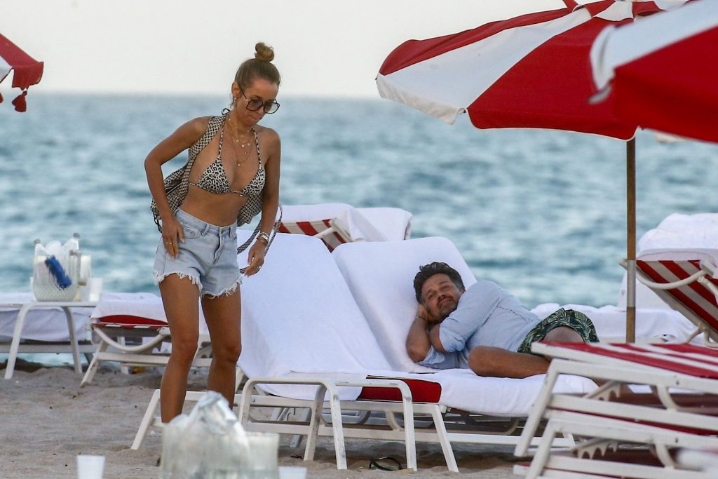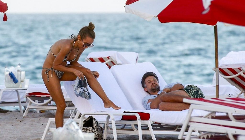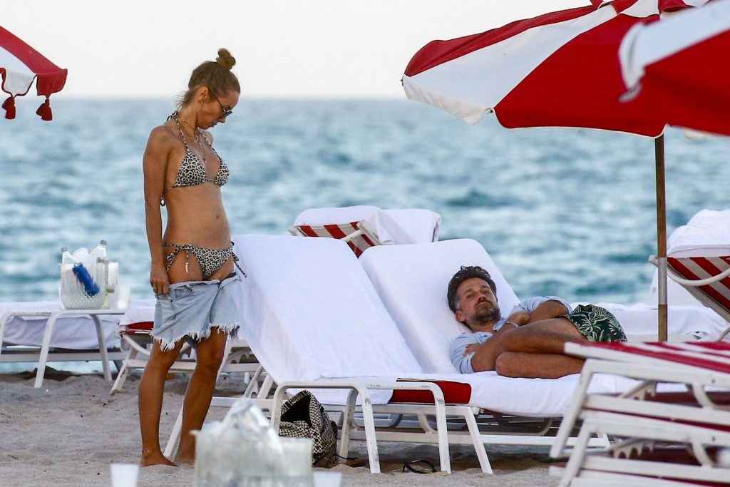Фитнес-ведущая немецкого телевидения Аннемари Карпендале и её актёрский муж Уэйн Карпендале вместе отдыхают на пляже в Майами-Бич, 01/03/2020. Аннемари надевает свои укороченные джинсы и целует своего возлюбленного, прежде чем улыбнуться нашим камерам.