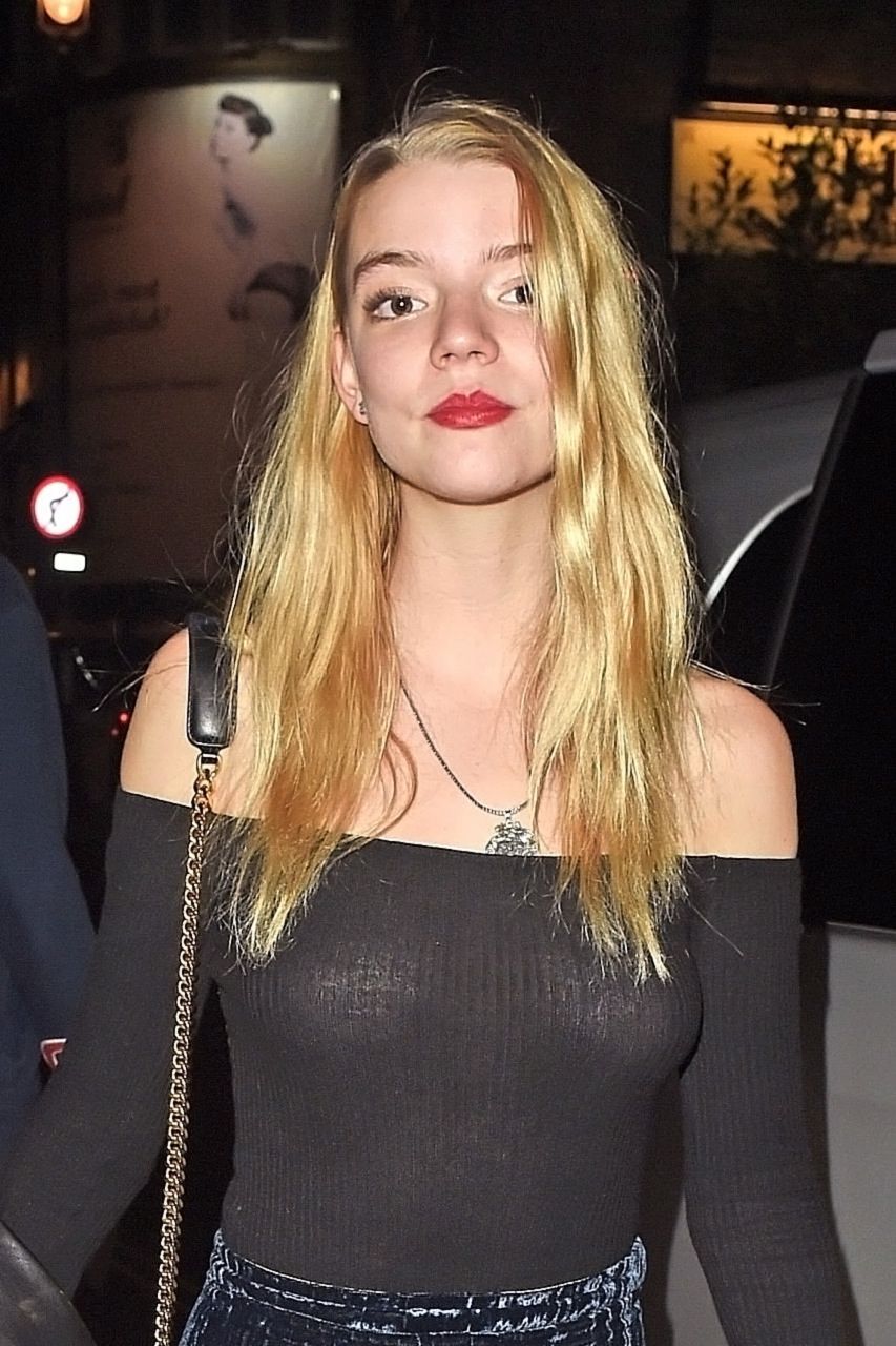 Blonde sexy actress Anya Taylor-Joy was seen leaving the Chiltern Firehouse in London. Anya showed her nipples, and saggy tits in see thru blouse with also naked shoulders!
