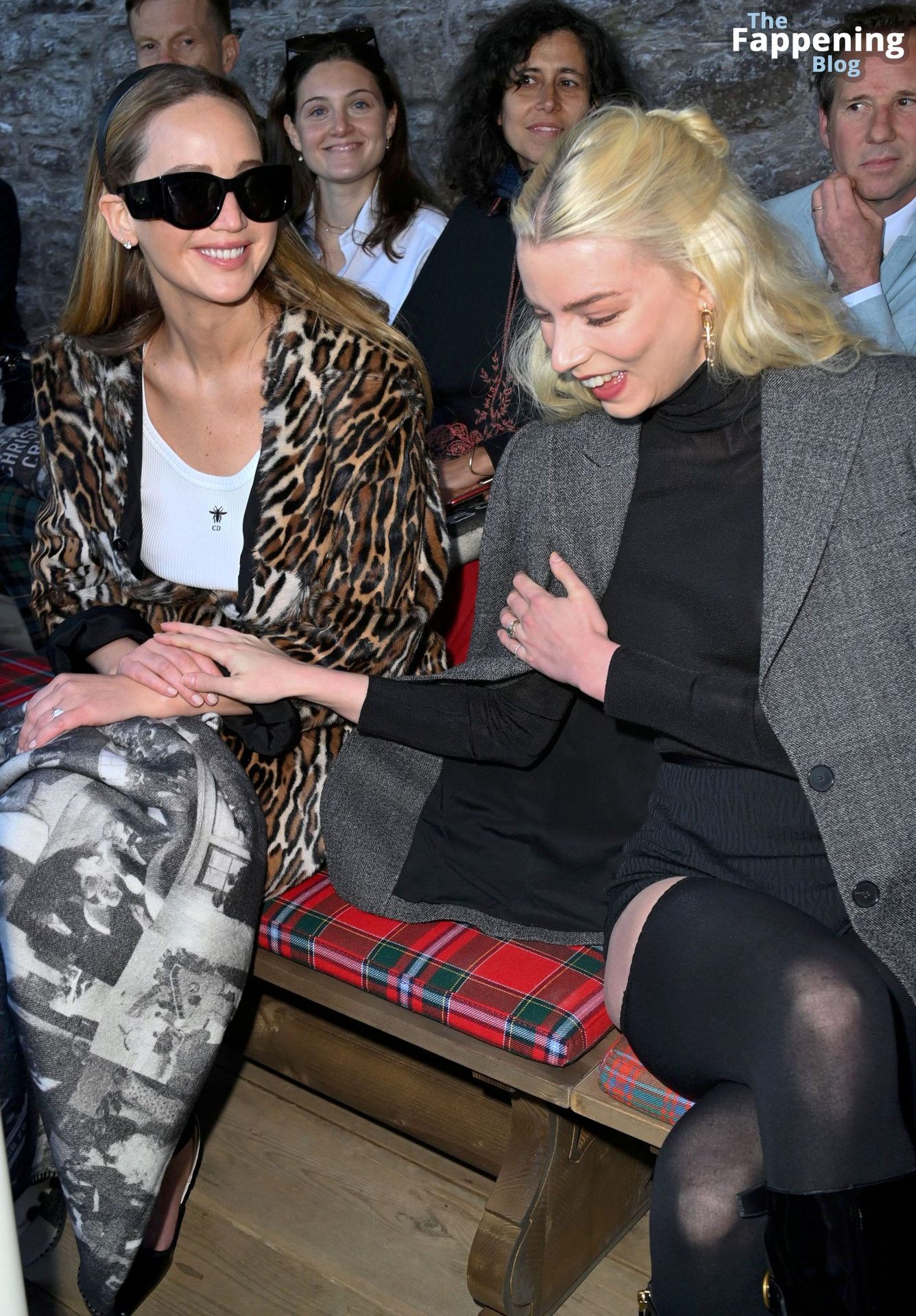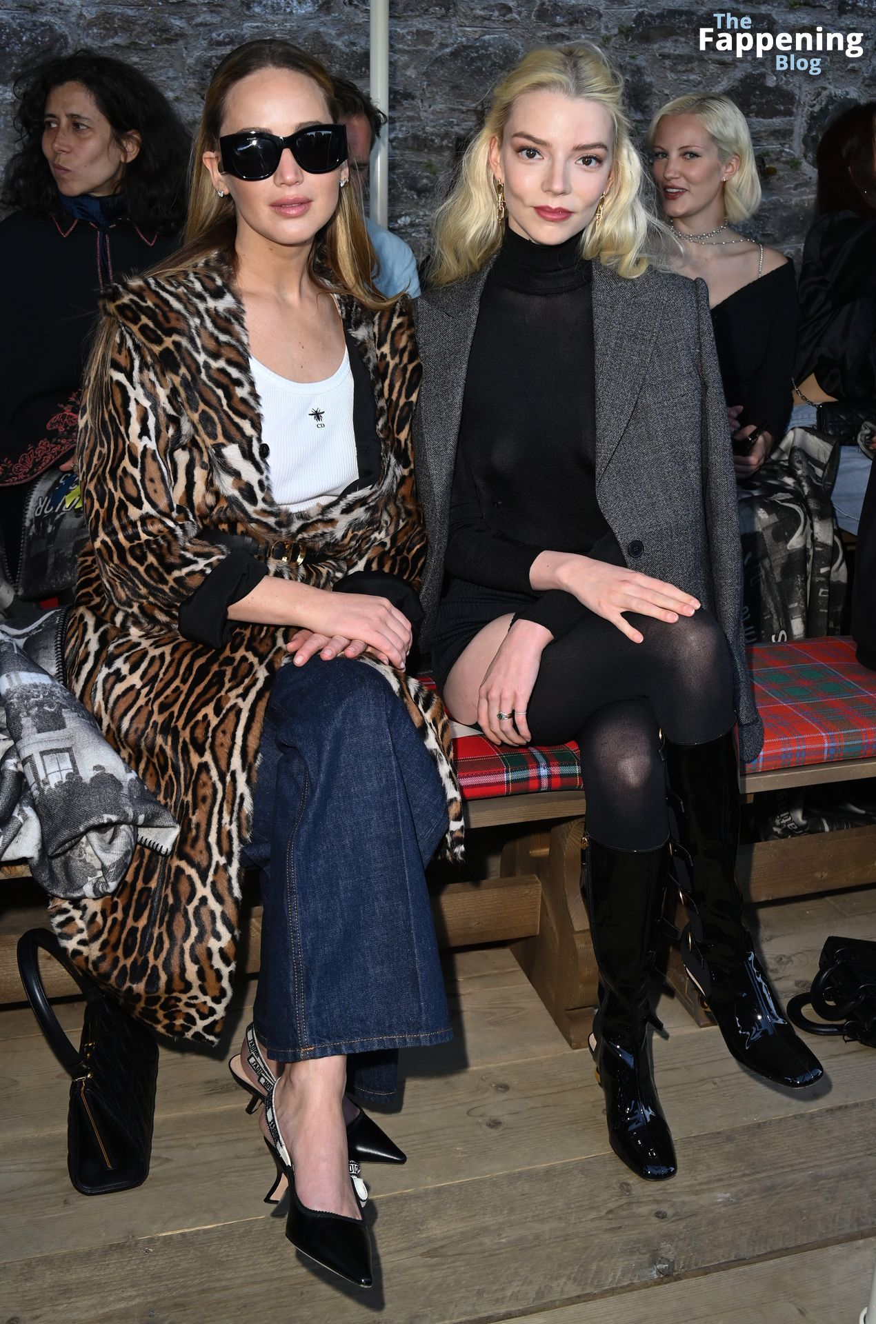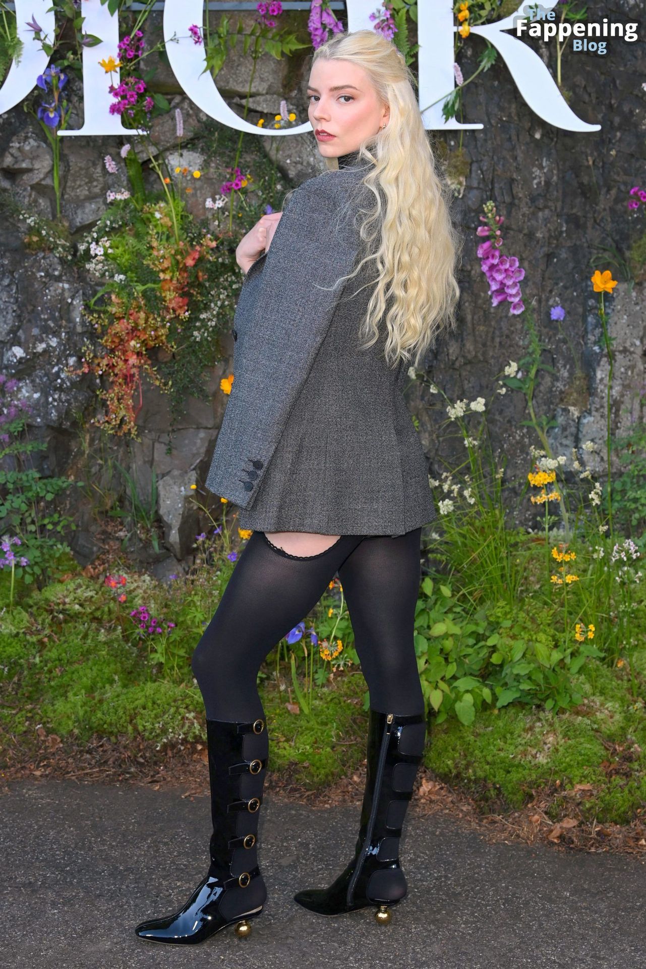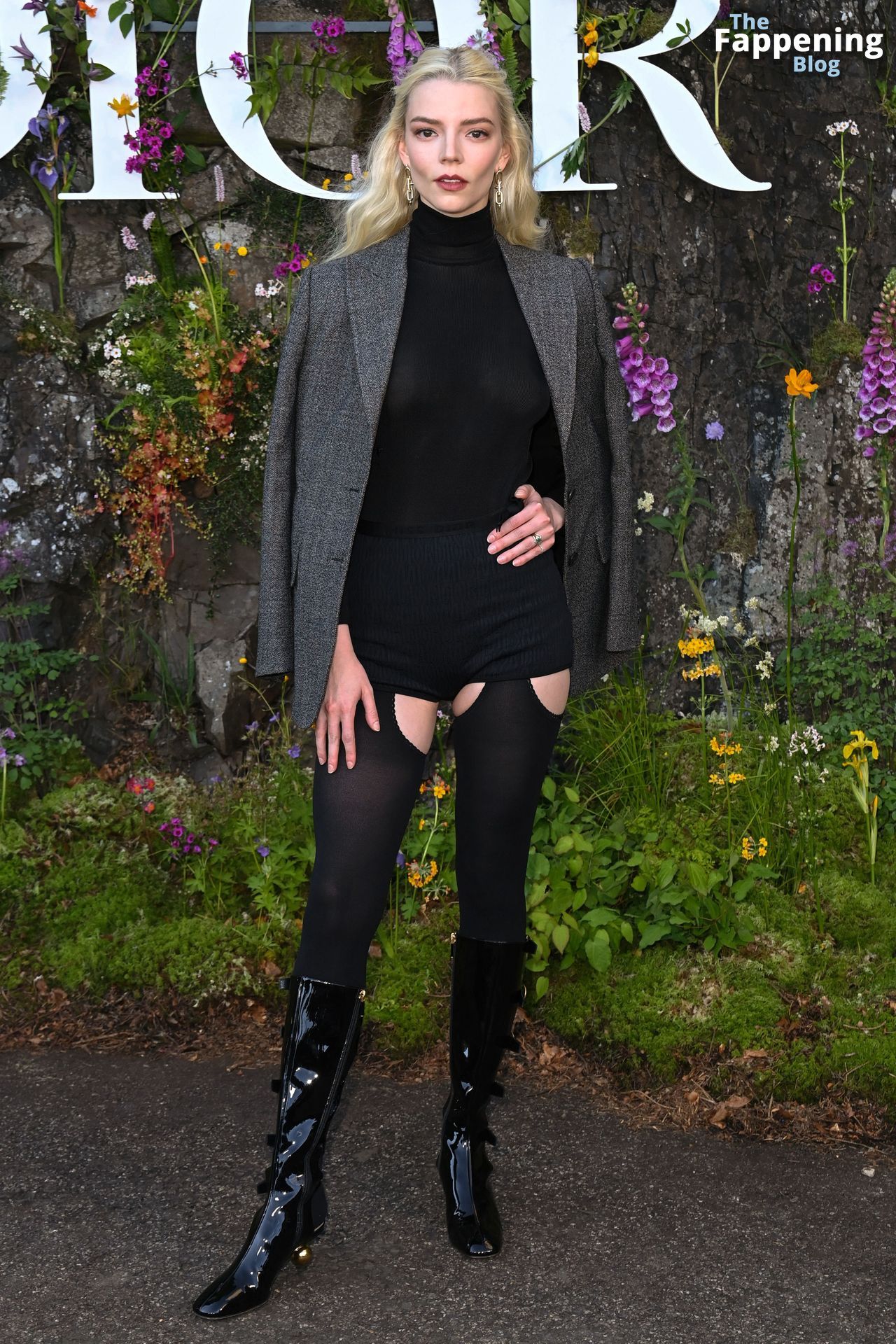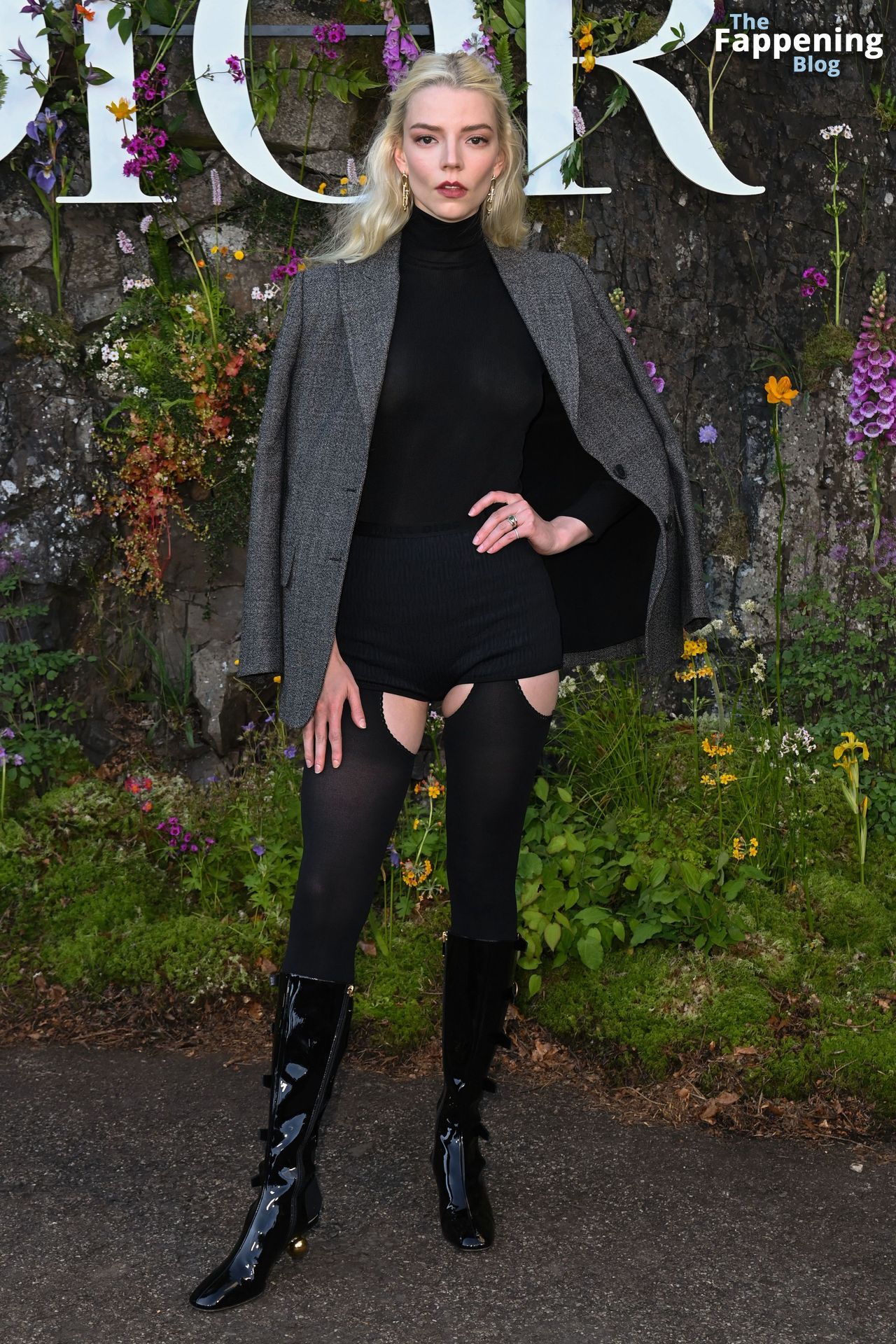 Актриса Аня Тейлор-Джой запечатлена на модном показе Dior Cruise 2025, появившись без бюстгальтера и с дерзким настроем. Эта прозрачная ткань и черные чулки создают очень соблазнительный образ.