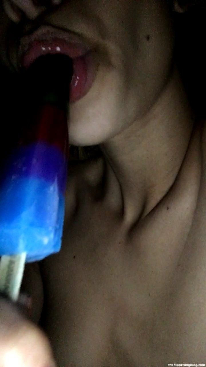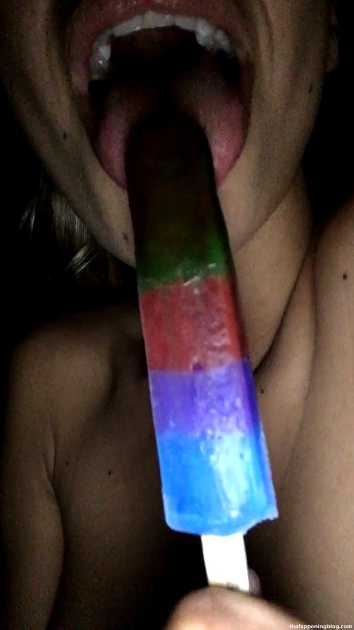 The model shows her ass while lying in bed and takes a selfie in the bathroom. She sucks a popsicle and shows her shaved pussy in red panties.