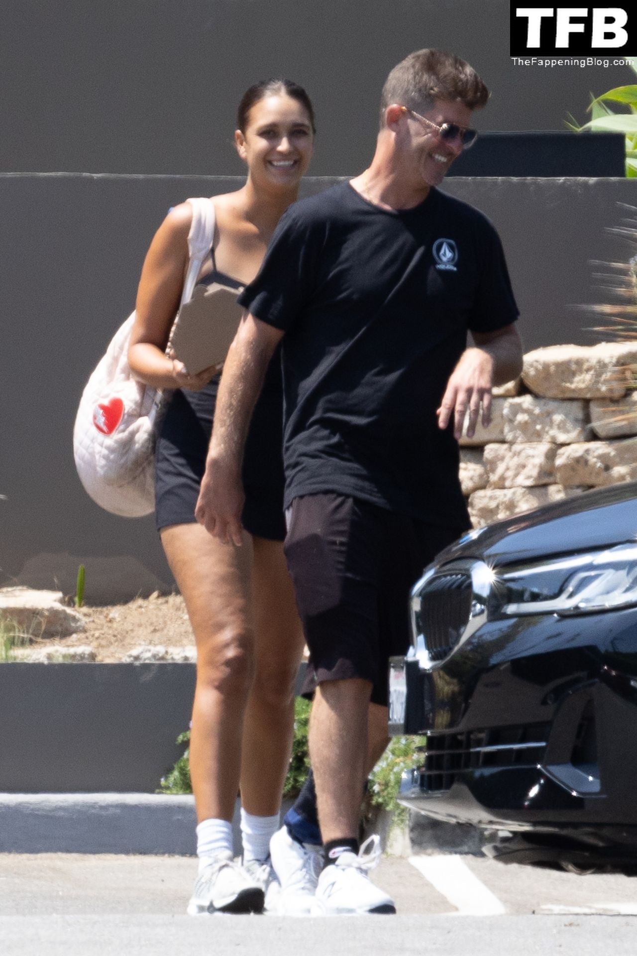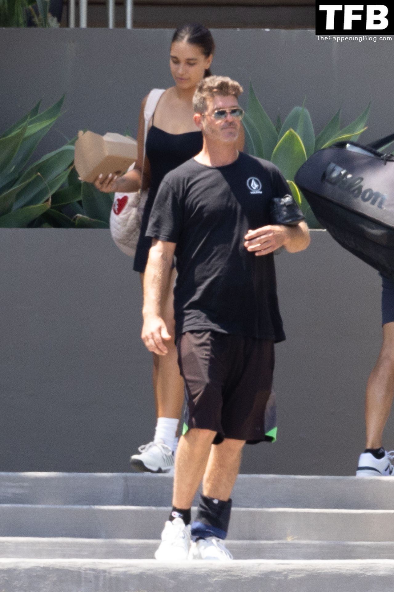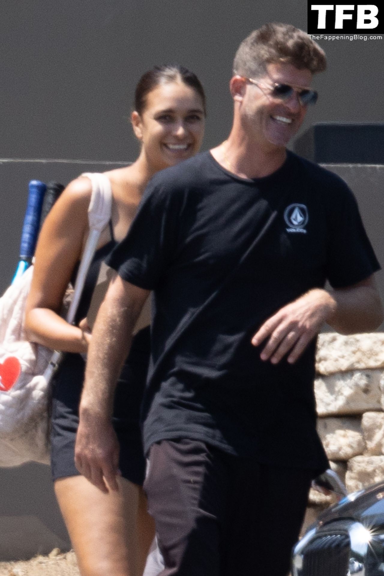 Певец Робин Тик и его невеста Эйприл Лав Гири смеются, расходясь после игры в теннис в Малибу, 03.08.2022.