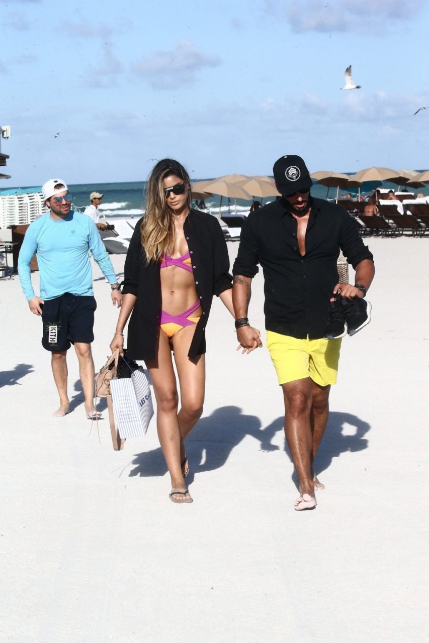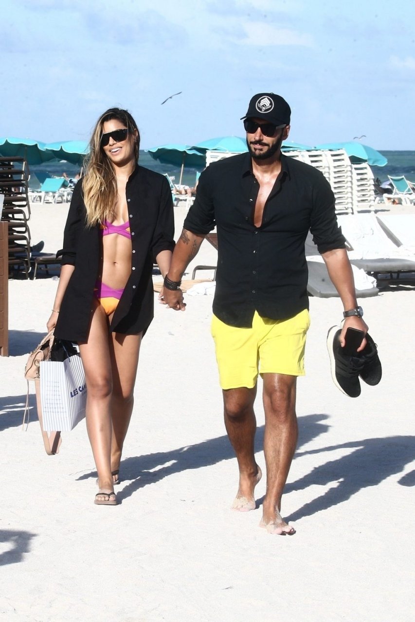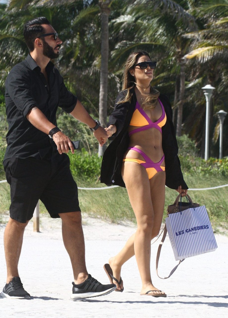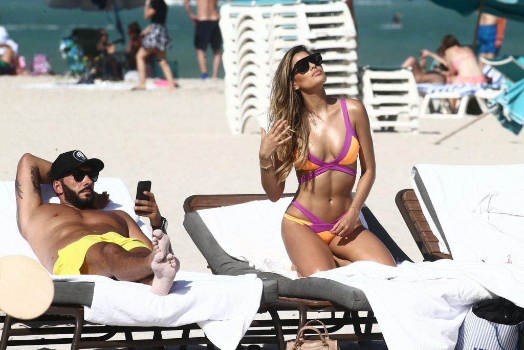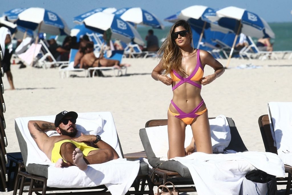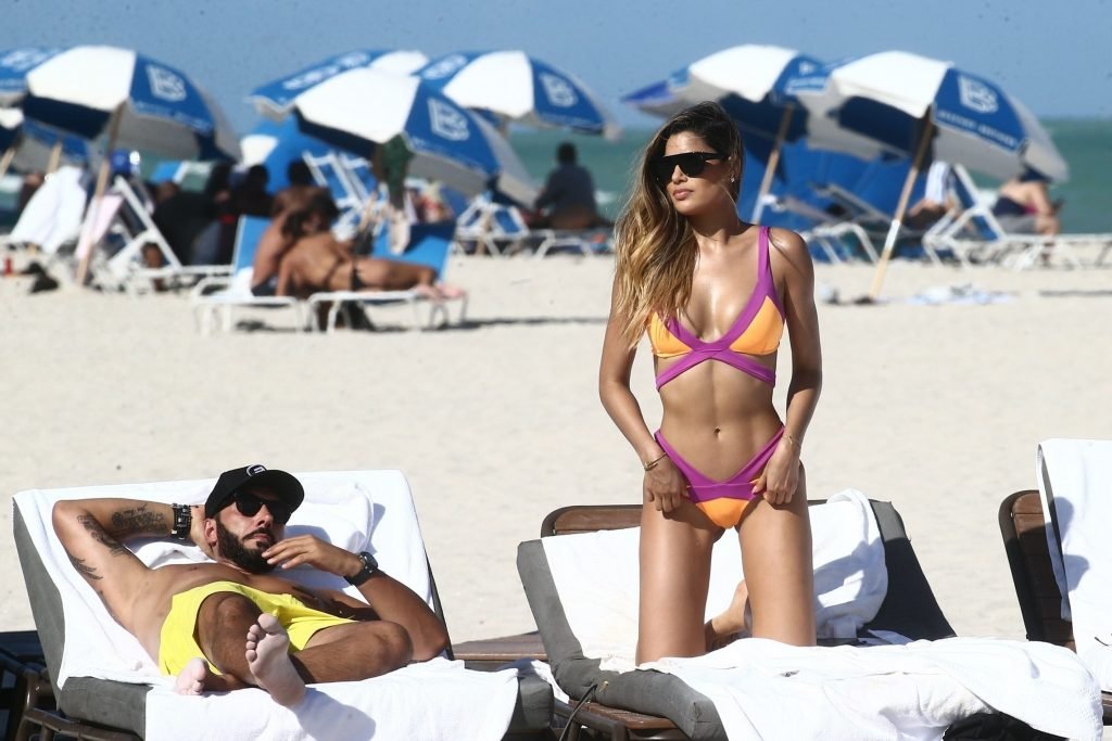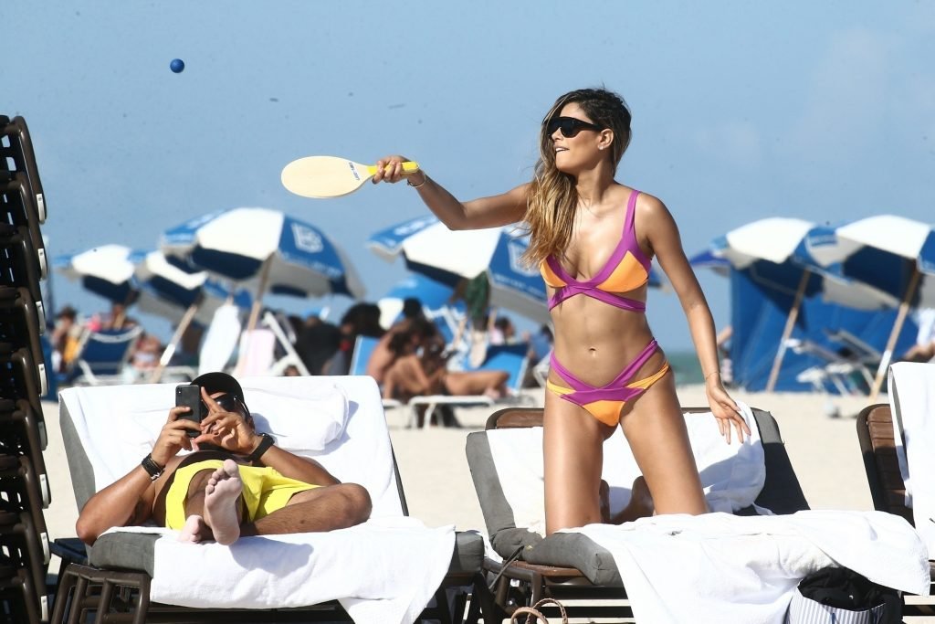 Колумбийская красавица, 24-летняя бывшая Мисс Вселенная Ариадна Гутьеррес продемонстрировала своё тело в бикини, играя с другом на пляже в Майами-Бич, 30.08.2018.