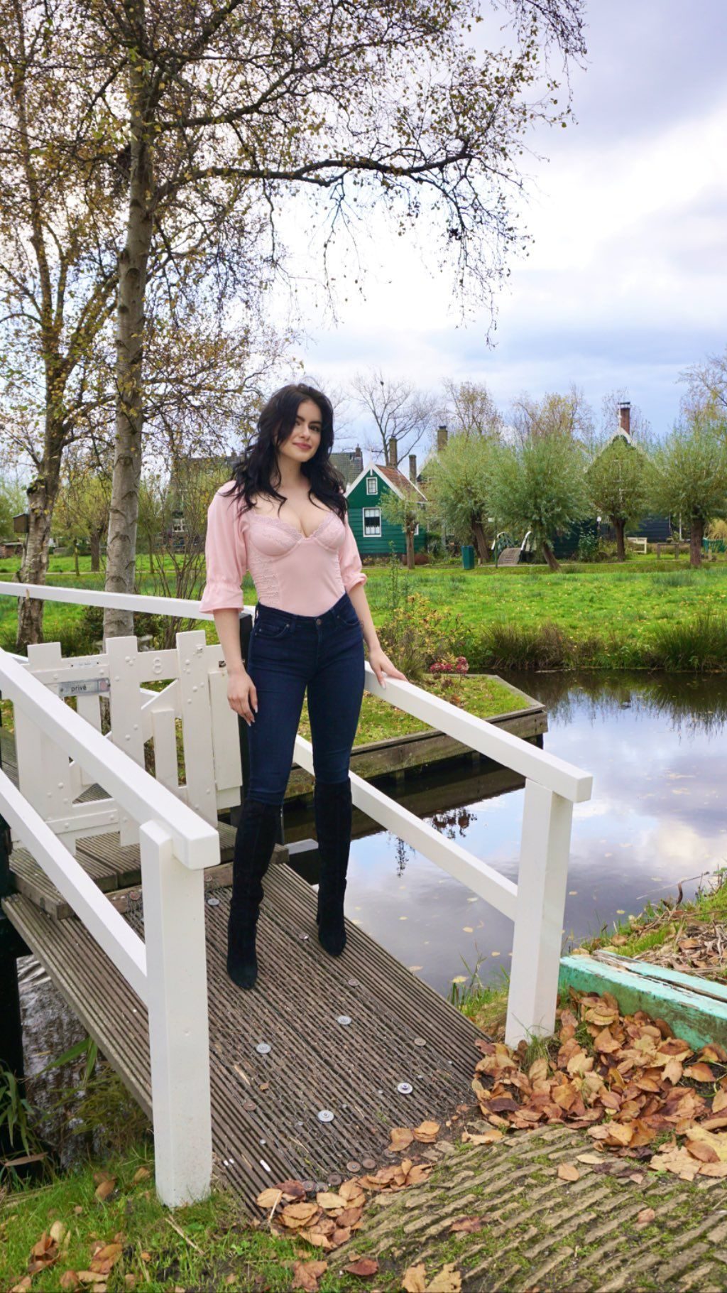 Ariel Winter показывает свои сиськи, надевая розовую блузку в Заансе Сханс, Амстердам, Голландия – Instagram, 19.11.2019. Вы всё ещё можете смотреть на её грудь, а не на дом сзади.