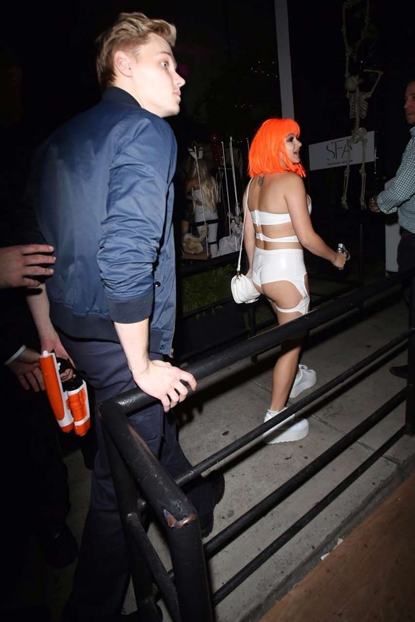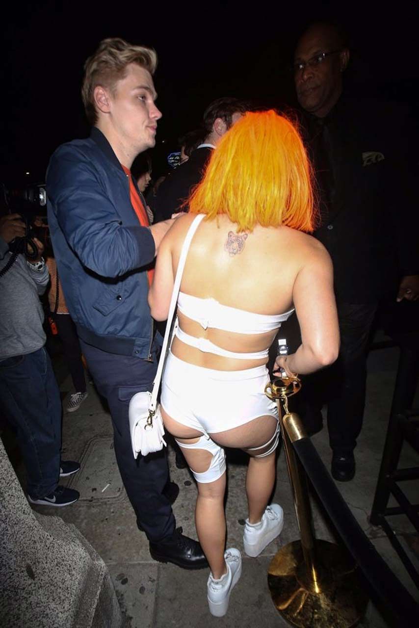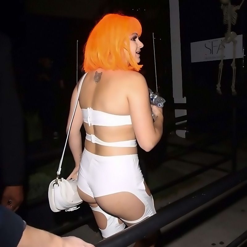 Ariel Winter again fleshes her disgusting white ass, this time while she was attending a Halloween party at Poppy’s Nightclub in Beverly Hills! Ariel Winter is always crying about how she doesn’t want to be sexualized, but girl you are making yourself a whore! That’s your fault! Ariel was trying to be sexy Leeloo from The Fifth Element, but this fat ass and chubby face was everything but sexy!