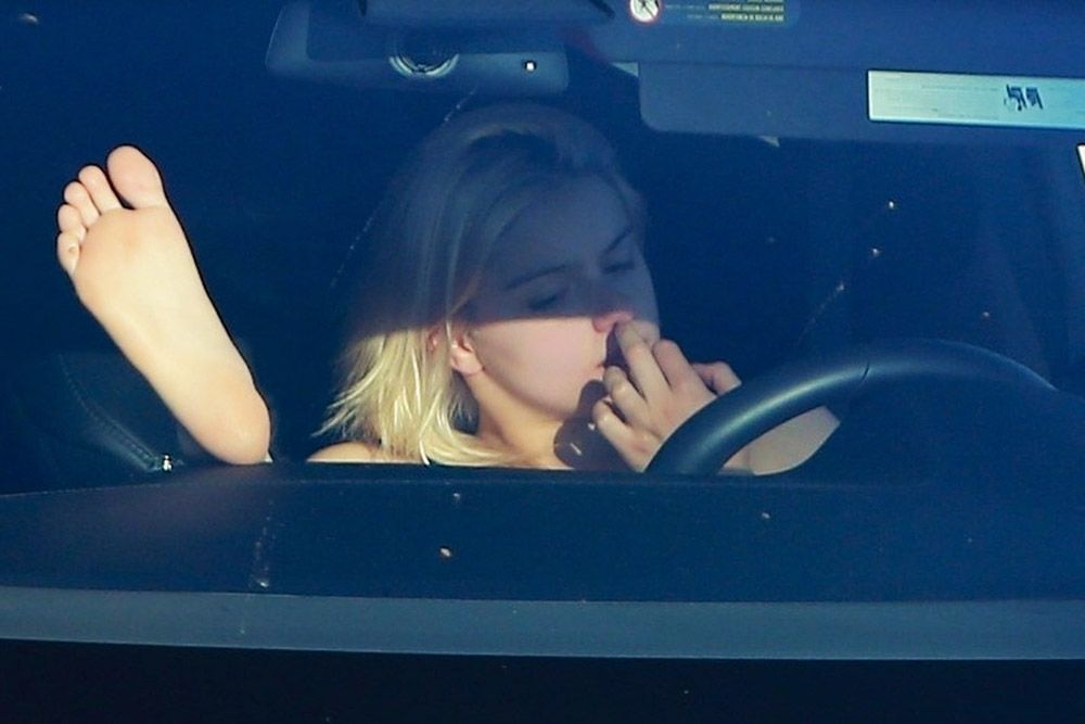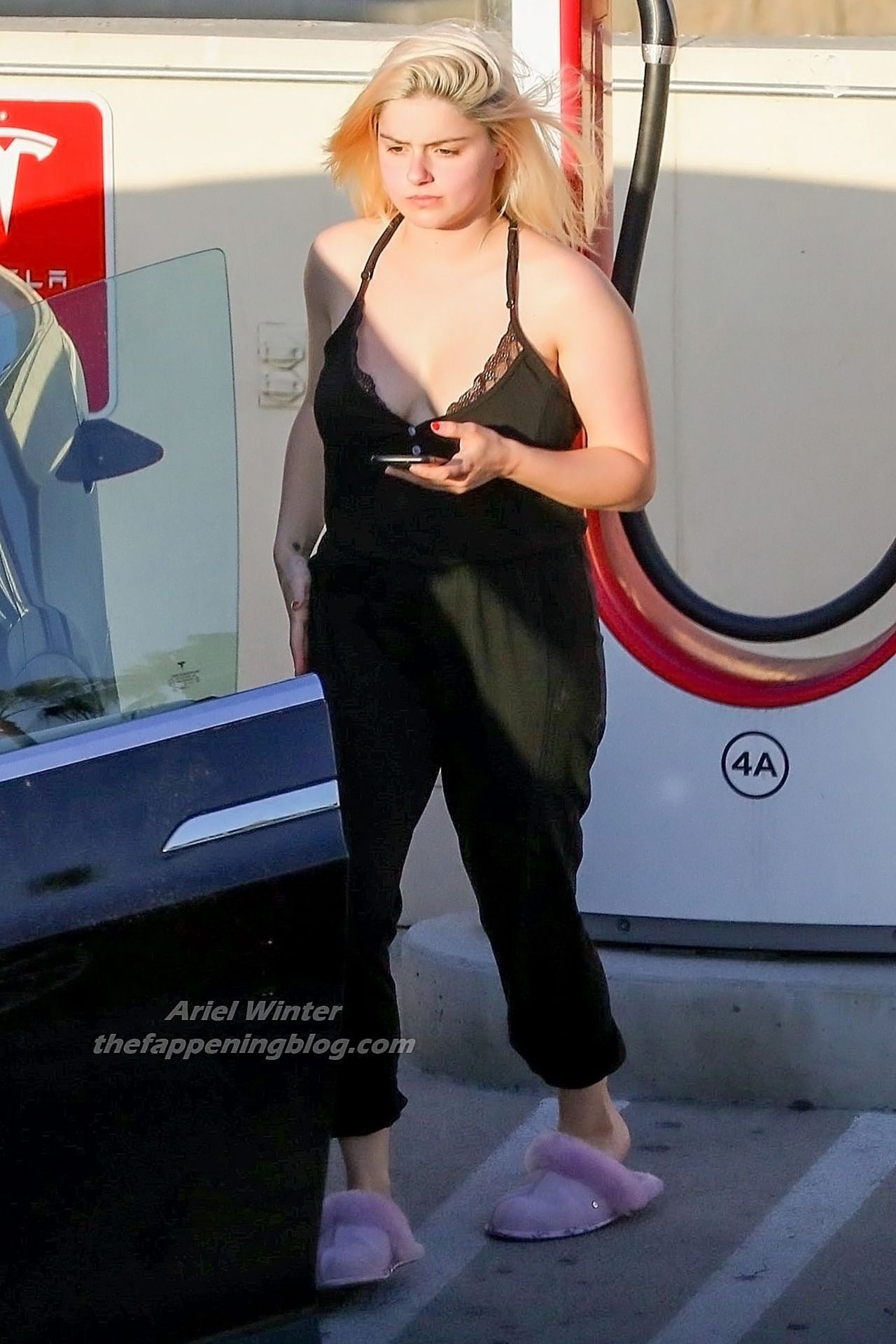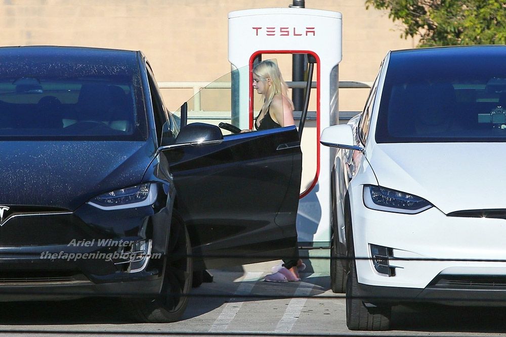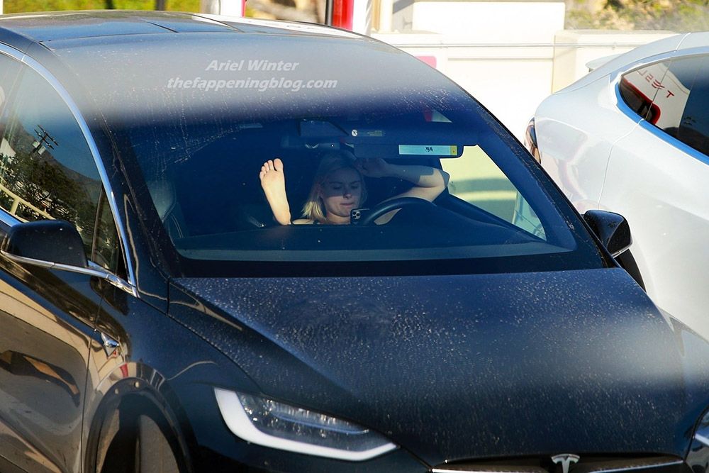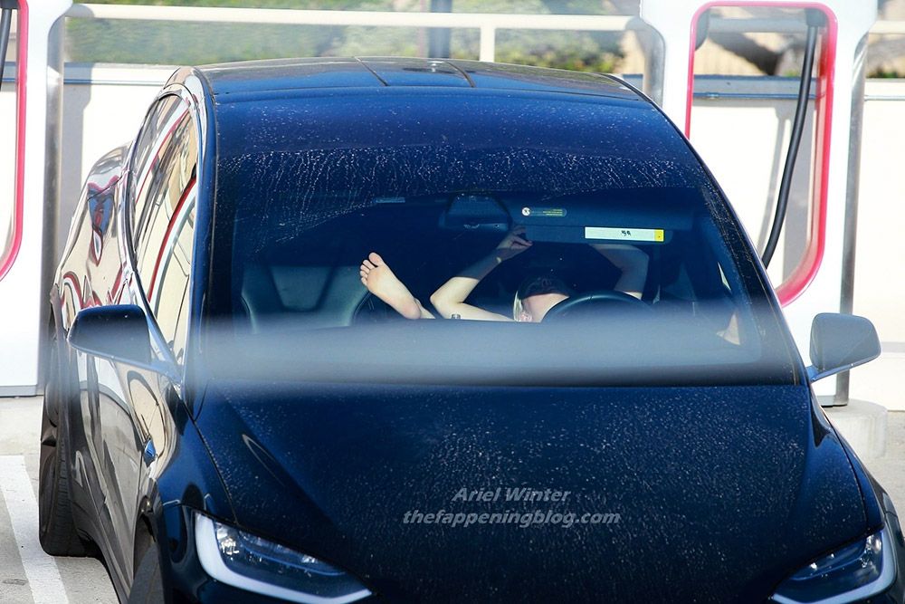 A makeup-free Ariel Winter kicks her feet up while waiting for her car to charge at the Tesla Charging Station in Burbank. The pretty babe spreads her legs for us and plays with her wet pussy alone.