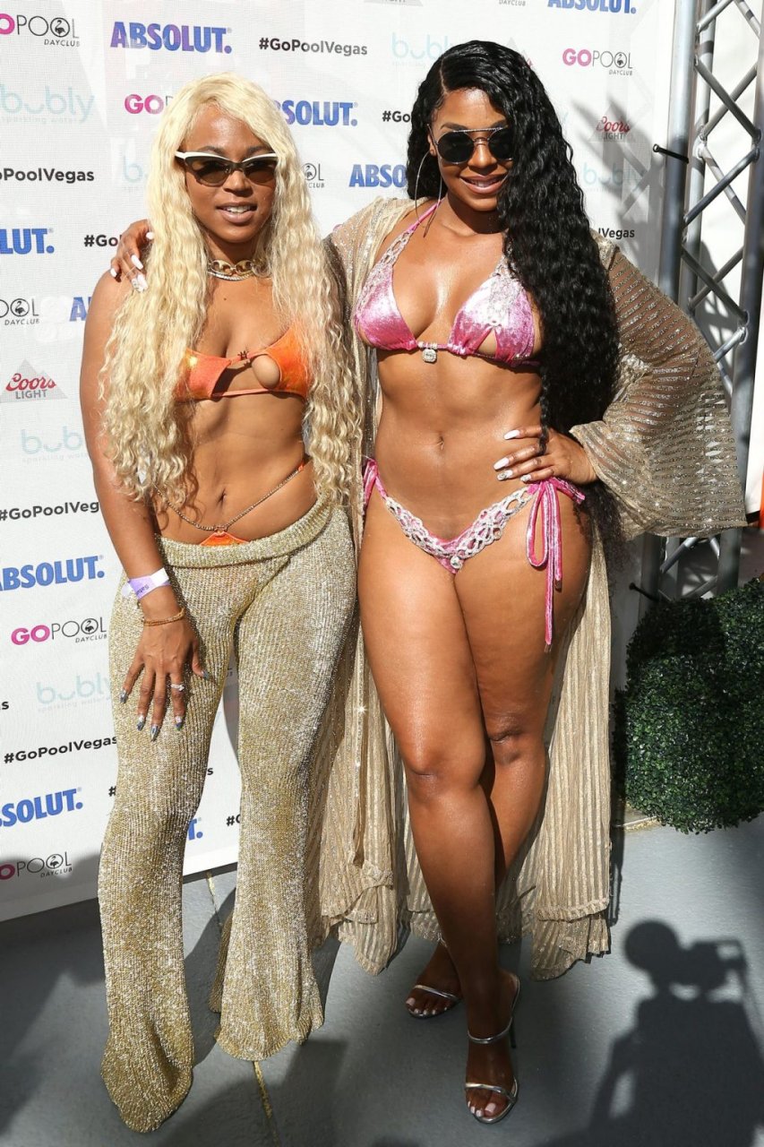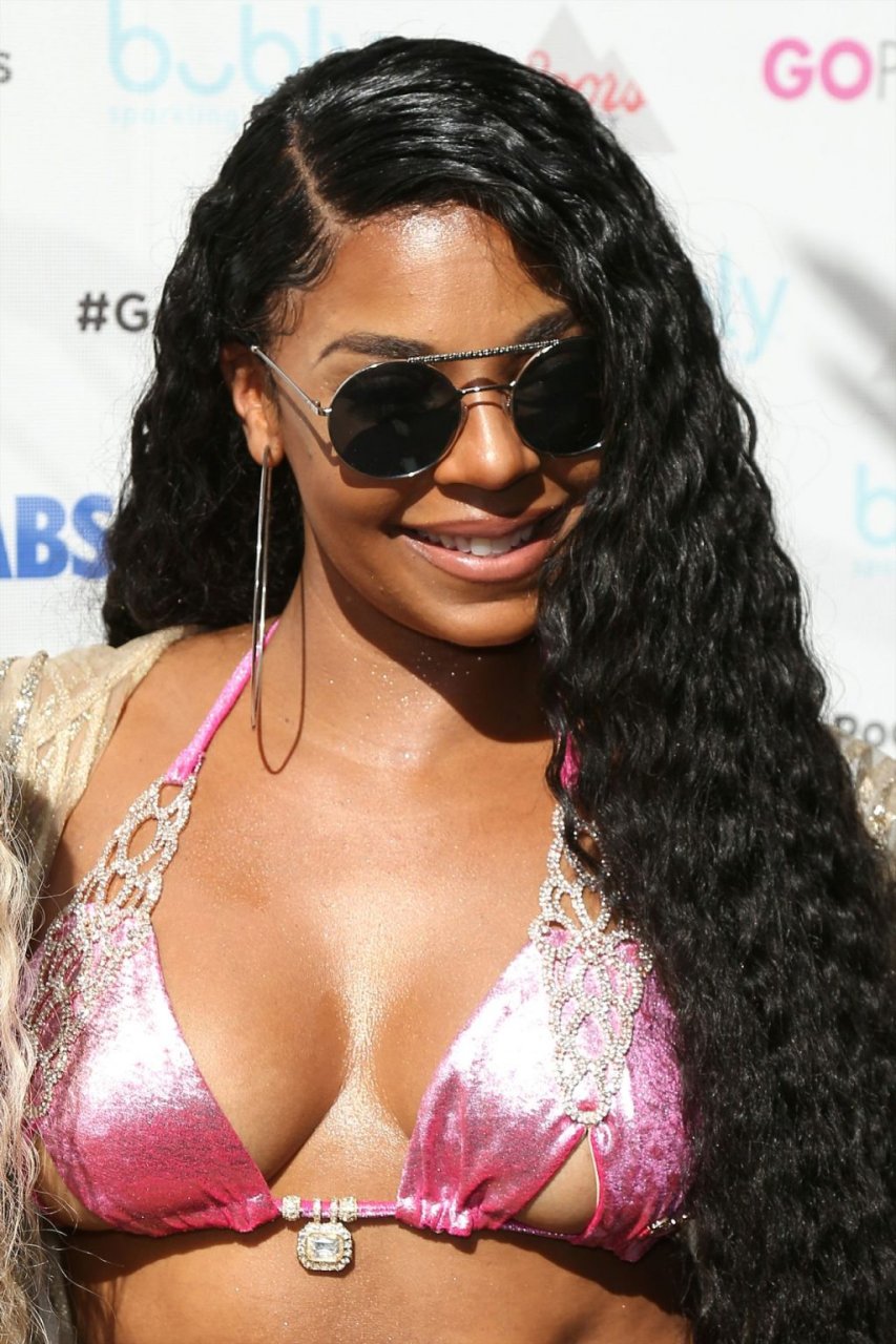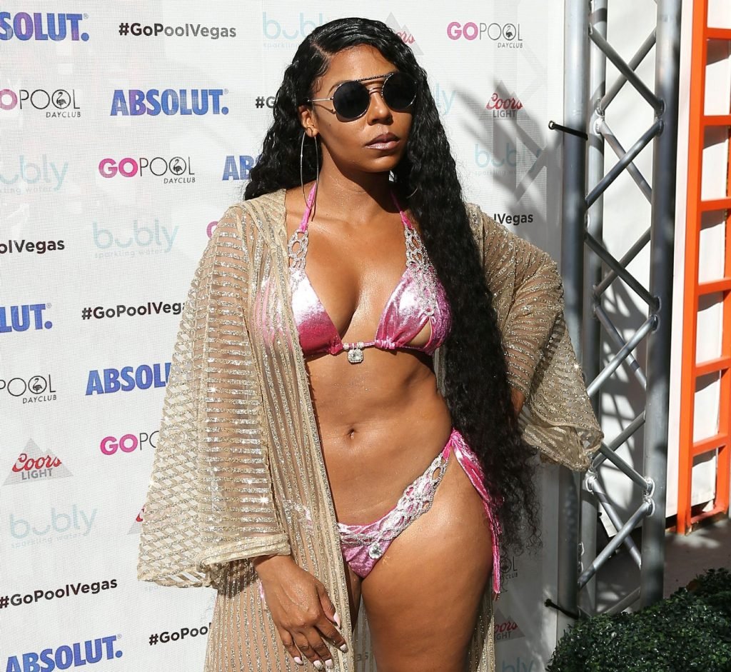 Ashanti в розовом бикини и солнцезащитных очках позирует для фотографий перед выходом на сцену для живого выступления в Go Pool Dayclub отеля Flamingo Las Vegas, 08.06.2019.