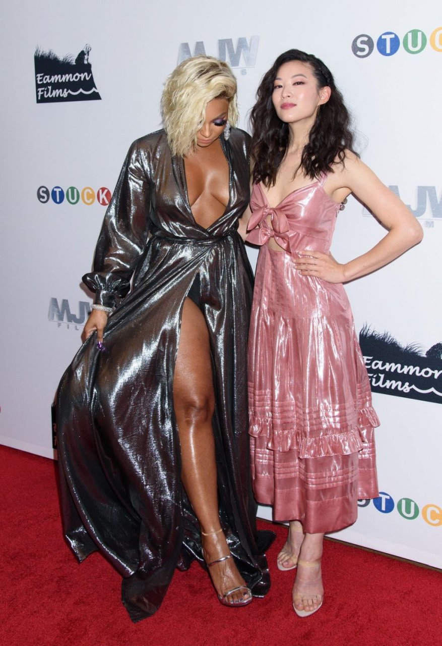 Американская певица Эшанти столкнулась с проблемами гардероба (“upskirt”) на премьере фильма “Stuck” в Нью-Йорке, 16.04.2019. Она появилась на красной дорожке в прозрачном платье без бюстгальтера, демонстрируя свои груди.
