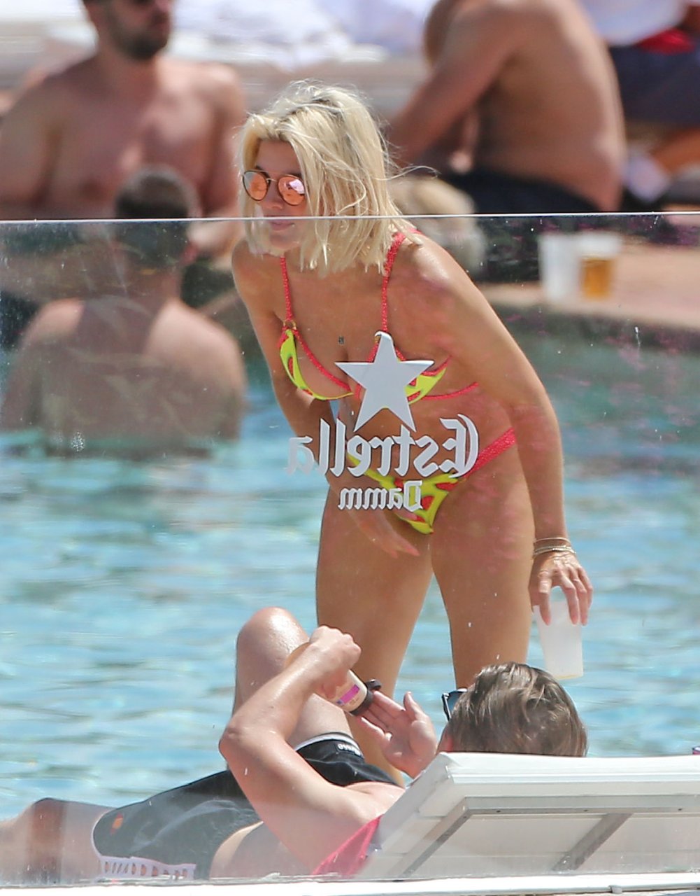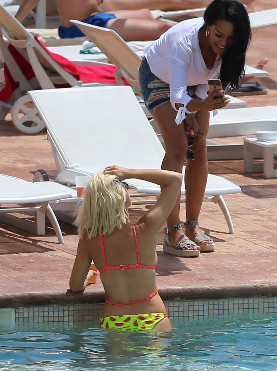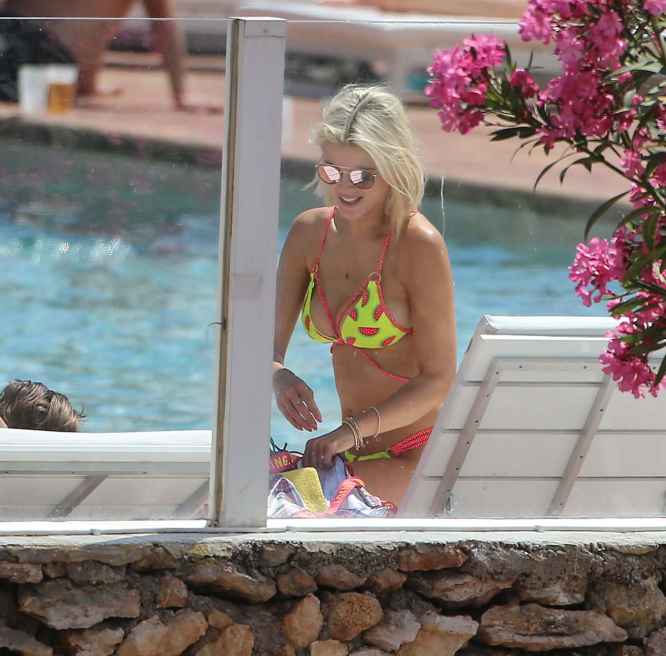 Блондинка Эшли Джеймс демонстрирует своё пляжное тело в сексуальном бикини с принтом арбуза во время отпуска на Ибице, Испания, 07.06.2018. Звезда Celebrity Big Brother (известного как Big Brother VIP) и Made In Chelsea, 31 год, наслаждалась солнцем и была замечена с напитком.