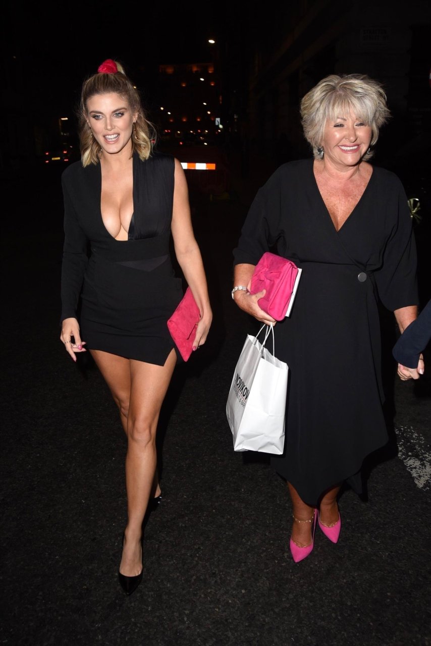 Пышногрудая Эшли Джеймс покидает ресторан Novikov в Лондоне, Мейфэр, в компании бывшего детектива полиции Большого Манчестера Мэгги Оливер, 27.06.2019.