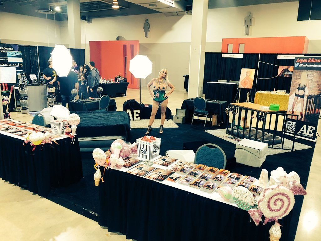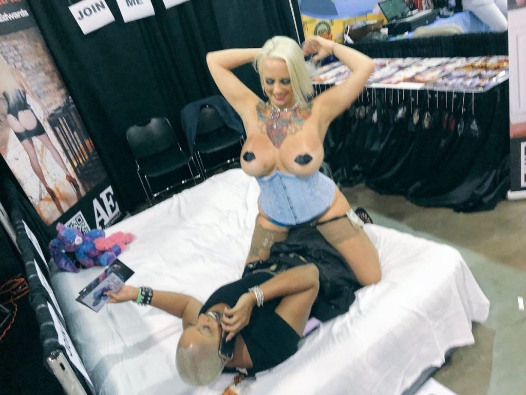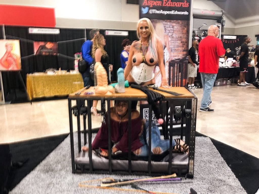 Пышногрудая блондинка Aspen Edwards представила BDSM-атрибутику, клетку и огромные дилдо на выставке EXXXOTICA в Конгресс-центре аэропорта Майами во Флориде, 21.07.2018. Aspen Edwards — американская модель для взрослых в стиле фетиш, порноактриса, продюсер, режиссер и предприниматель. Дата рождения: 13 сентября 1985 года.