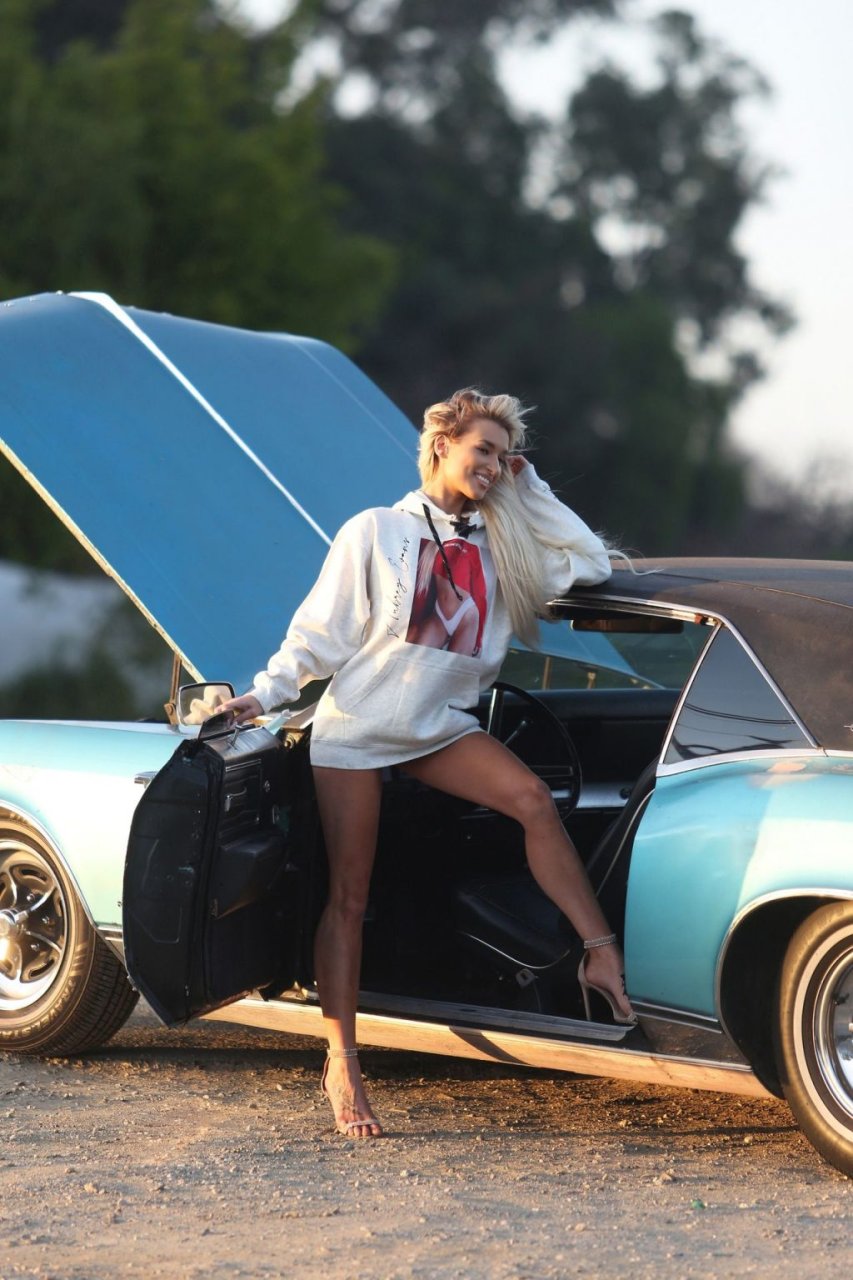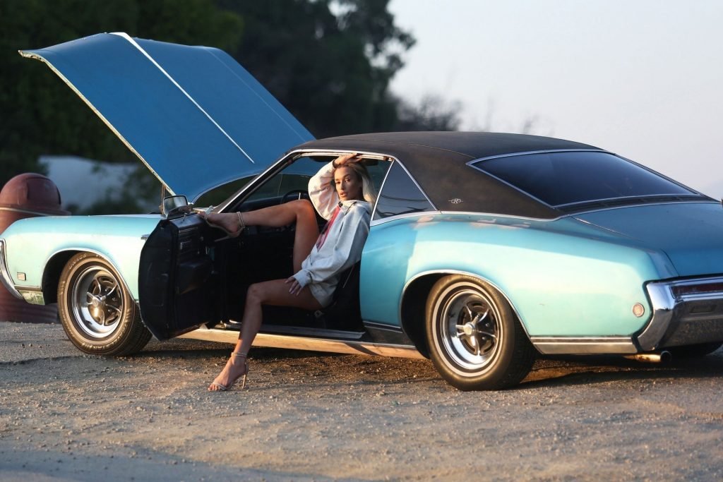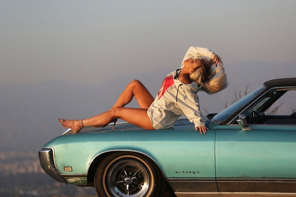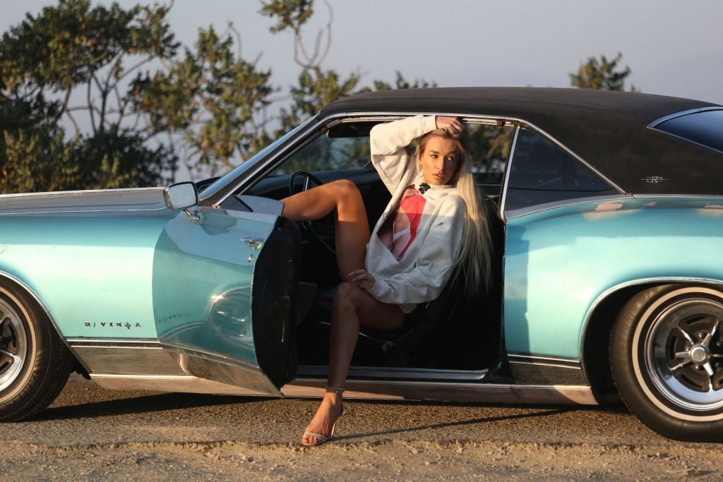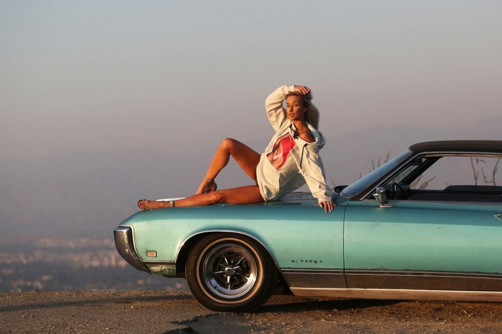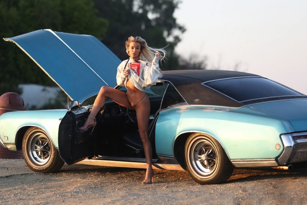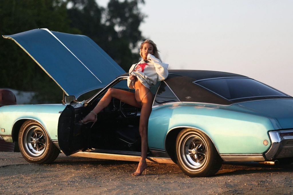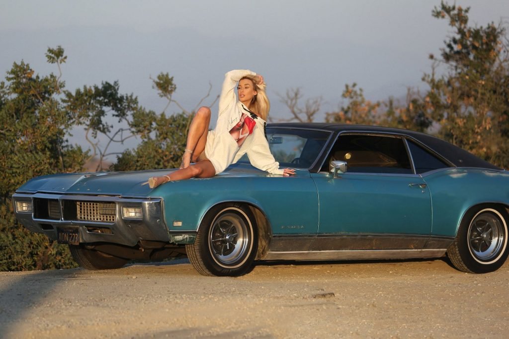 Playboy Playmate Обри Эванс позирует в новой уличной фотосессии для 138 Water с винтажным Buick Riviera 1968 года на Mulholland Drive в Лос-Анджелесе, 28.10.2019.