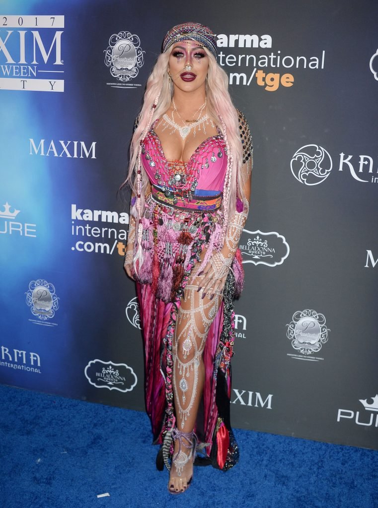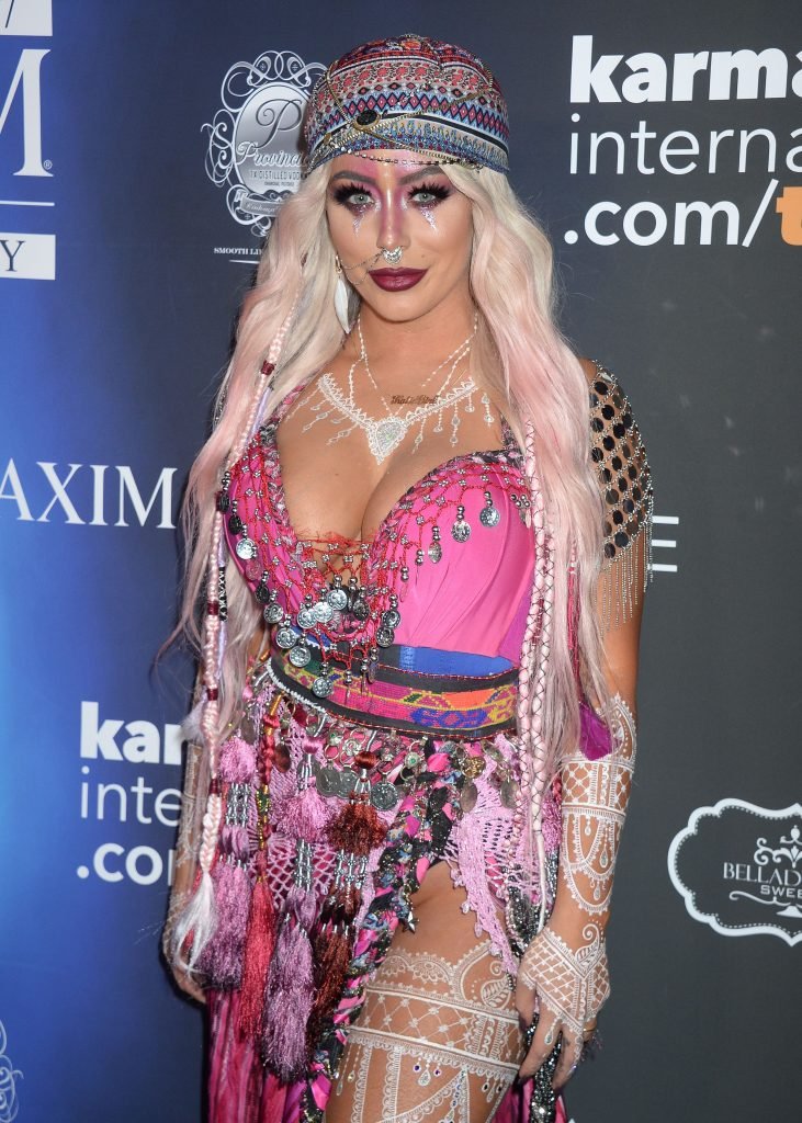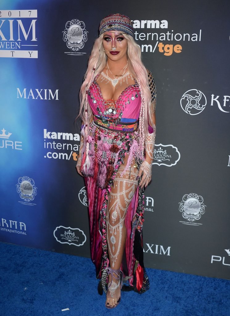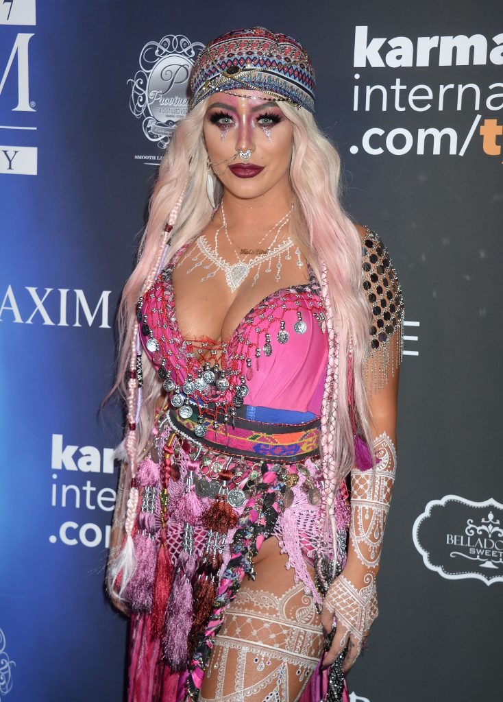 Обри О’Дэй демонстрирует свой экзотический костюм (включая накладные груди) на Хэллоуин-вечеринке Maxim 2017 в Лос-Анджелесе, 21.10.2017. Обри О’Дэй — американская певица/автор песен, актриса и звезда реалити-шоу. Возраст: 33 года.