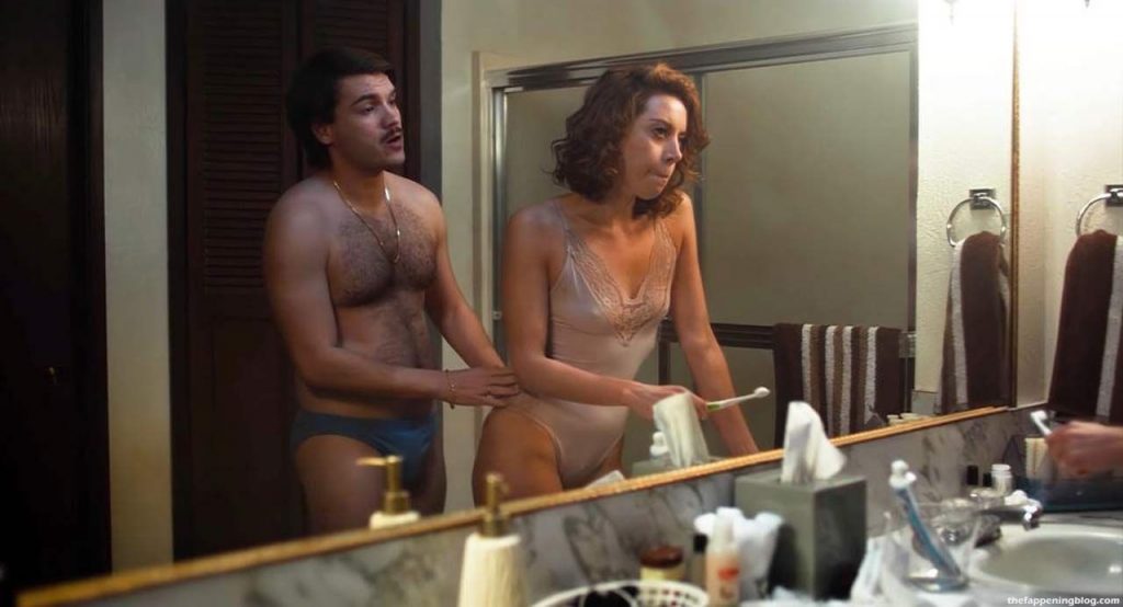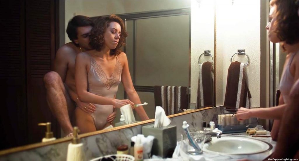 In this scene from ‘An Evening with Beverly Luff Linn’, we can see Aubrey Plaza sexy in beige lingerie brushing her teeth in the bathroom. Then her man enters and starts to kiss her neck from behind, but Aubrey is not satisfied and leaves the bathroom. Her nipples are poking!