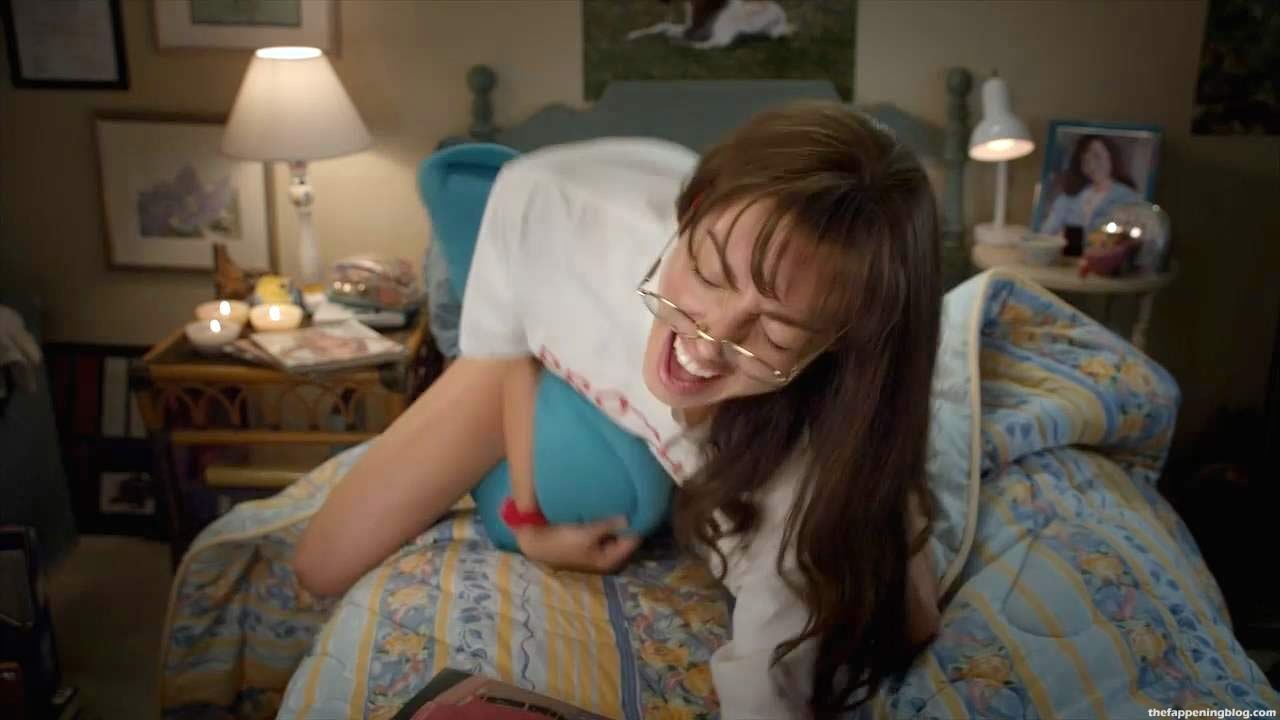 Here is Aubrey Plaza lying in her bed, wearing blue panties and a t-shirt. Then she goes down with her hand to touch the pussy and masturbate. She imagines a guy with long blonde hair giving her the massage and moans!