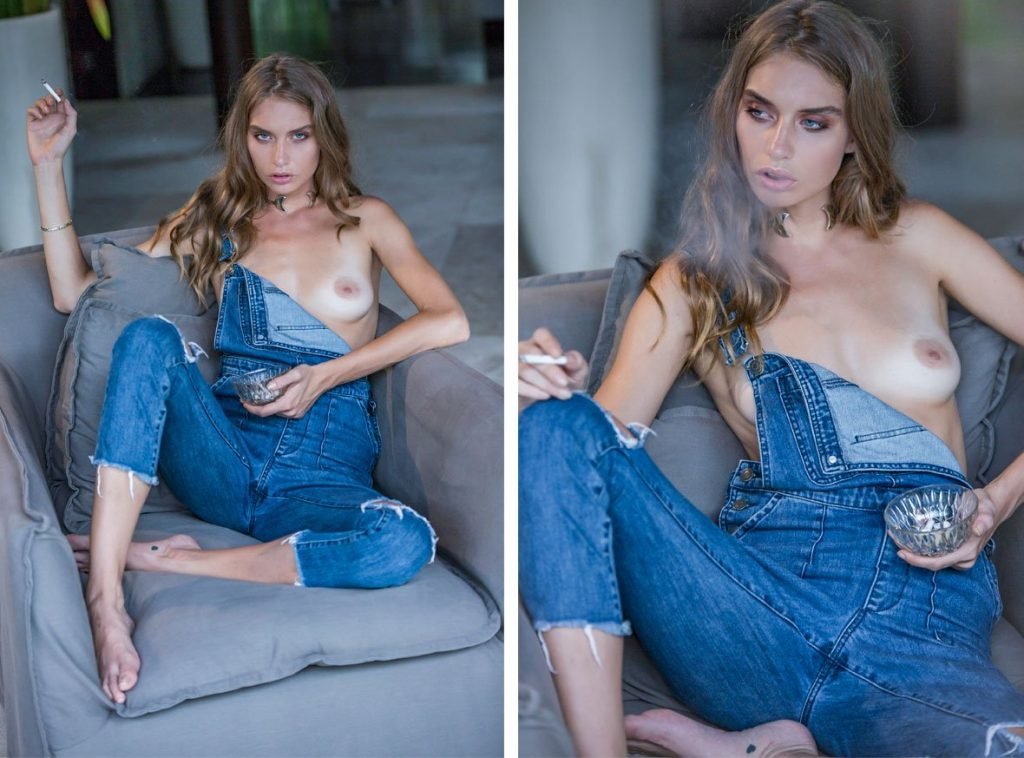 Ей нужно положить в рот копчёную ветчину вместо этой сигареты. Вау, она очень худая. Милые сиськи.