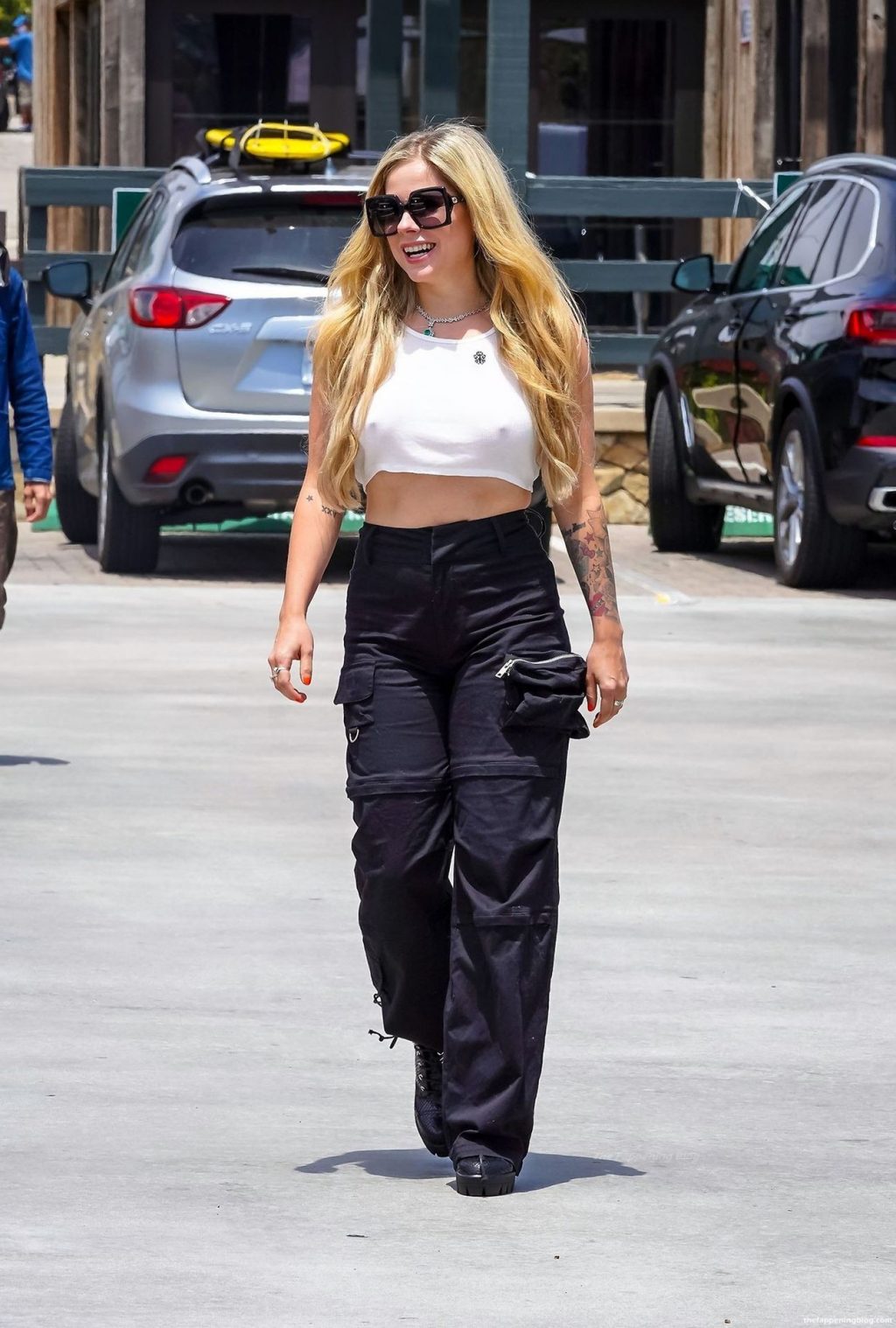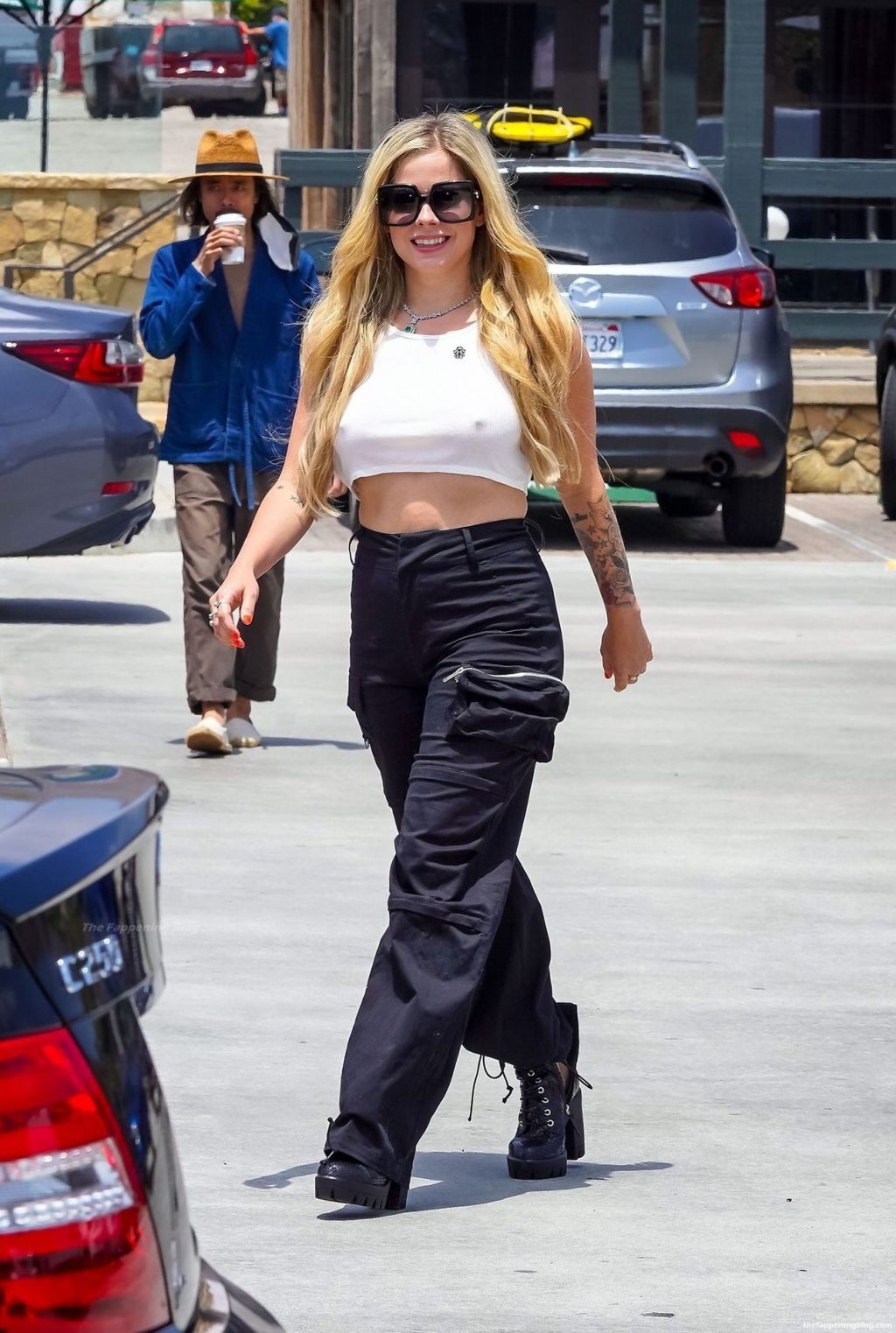 And again, our lovely miss Avril Lavigne has forgotten to put a bra on! Luckily, a paparazzi man was following her around, and when she was spotted in front of a coffee house, they managed to take some photos! Her tits are still not saggy, even though that she is almost 40 years old!