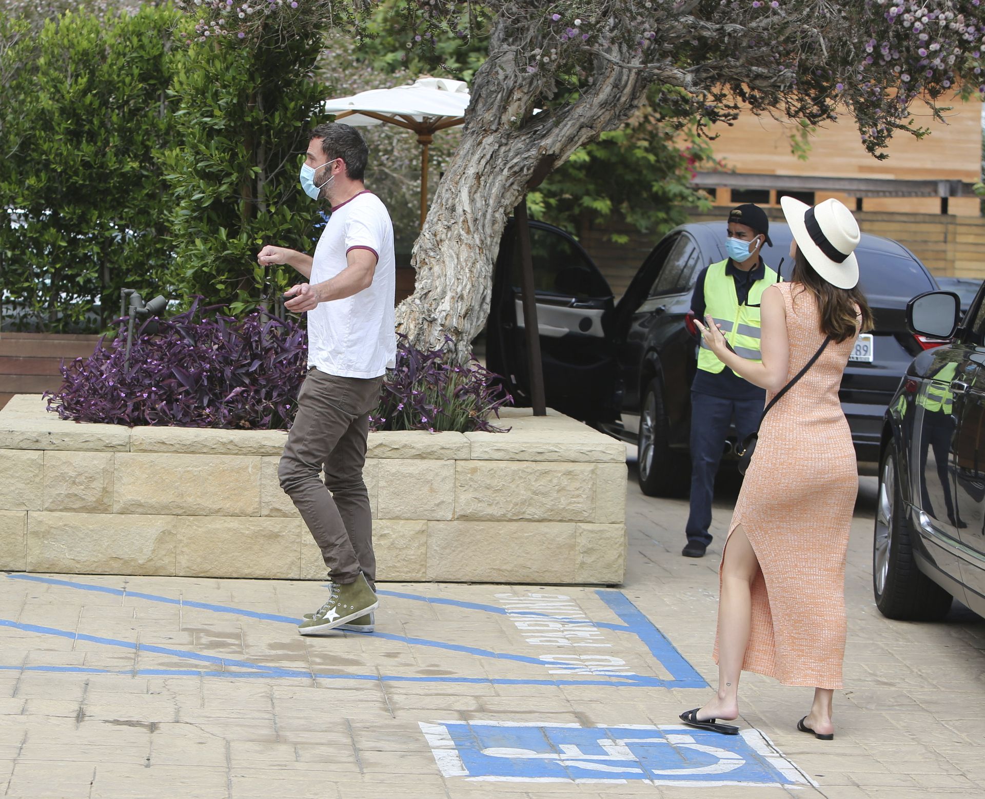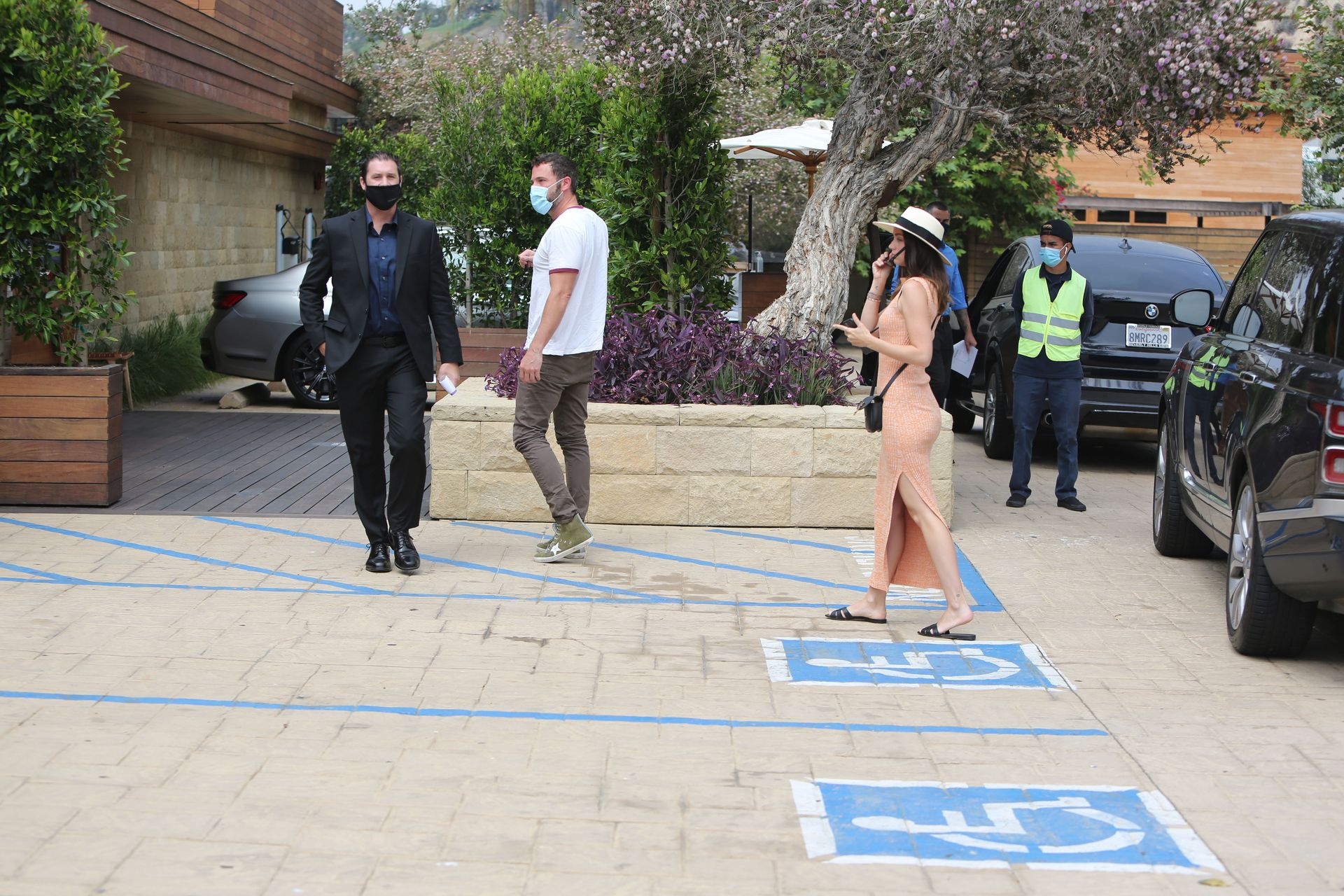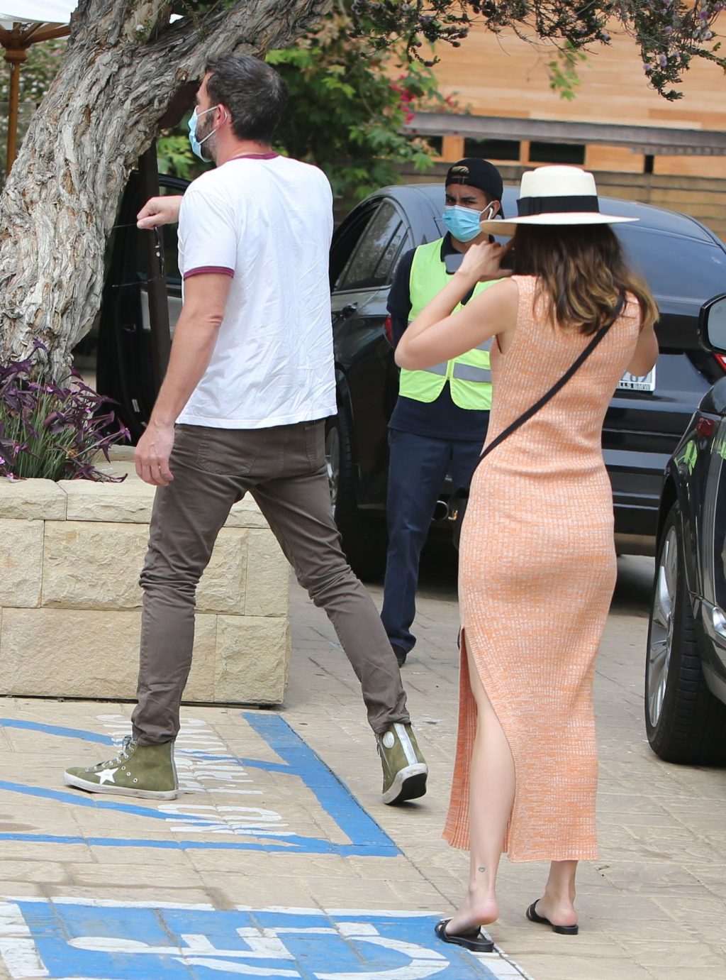 Бен Аффлек приглашает свою девушку Ану де Армас в Nobu Malibu на ранний субботний обед (июль 2020). Кубинско-испанская актриса почти выглядела ГОЛОЙ в своем ребристом персиковом платье, дополненном сумкой через плечо Saint Laurent и шлепанцами YSL. Бен был в высоких кроссовках Golden Goose стоимостью 550 долларов. Эй, эти двое — настоящие модники!