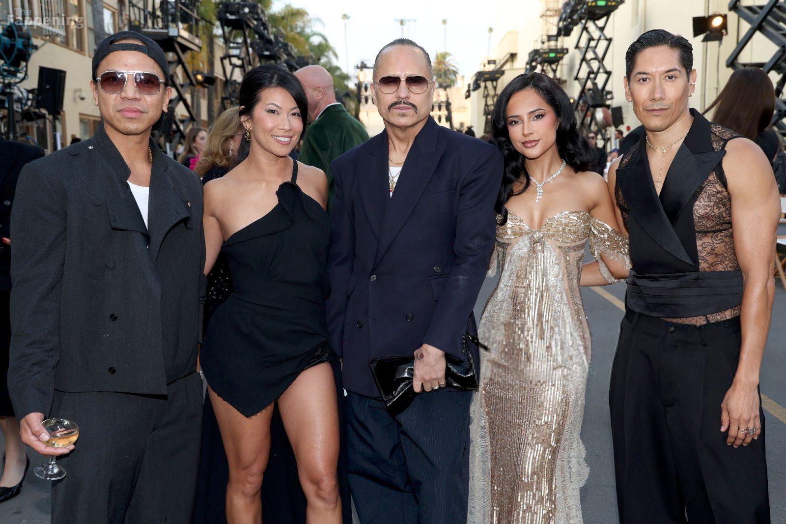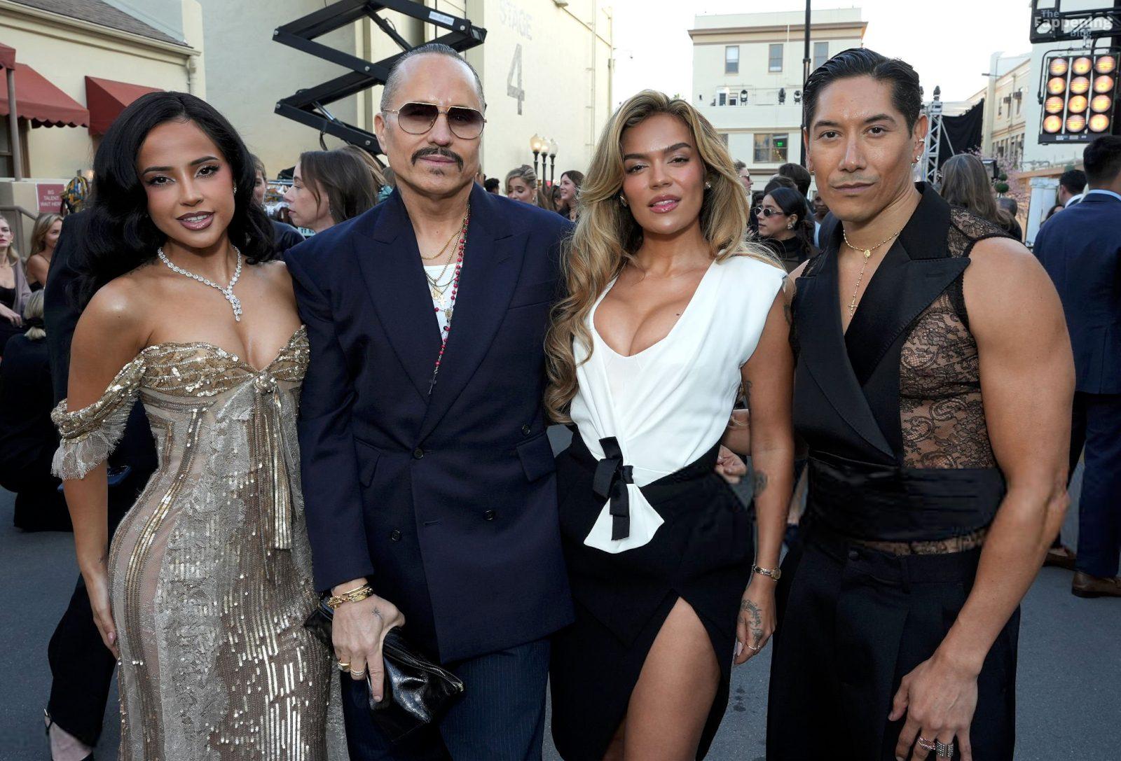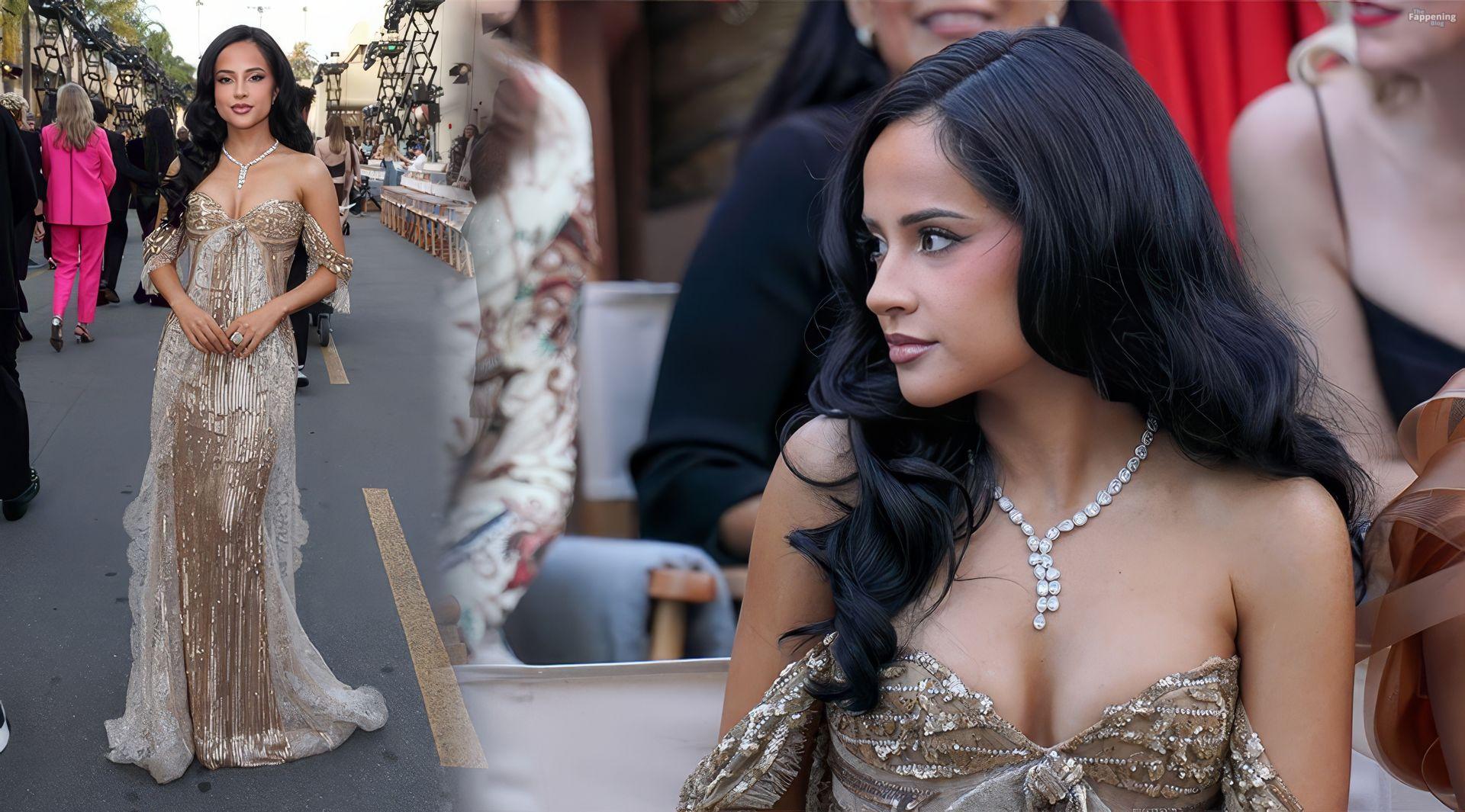 Певица Бекки Джи демонстрирует свое декольте в золотом платье с пайетками на Vogue World: Hollywood 2025.
