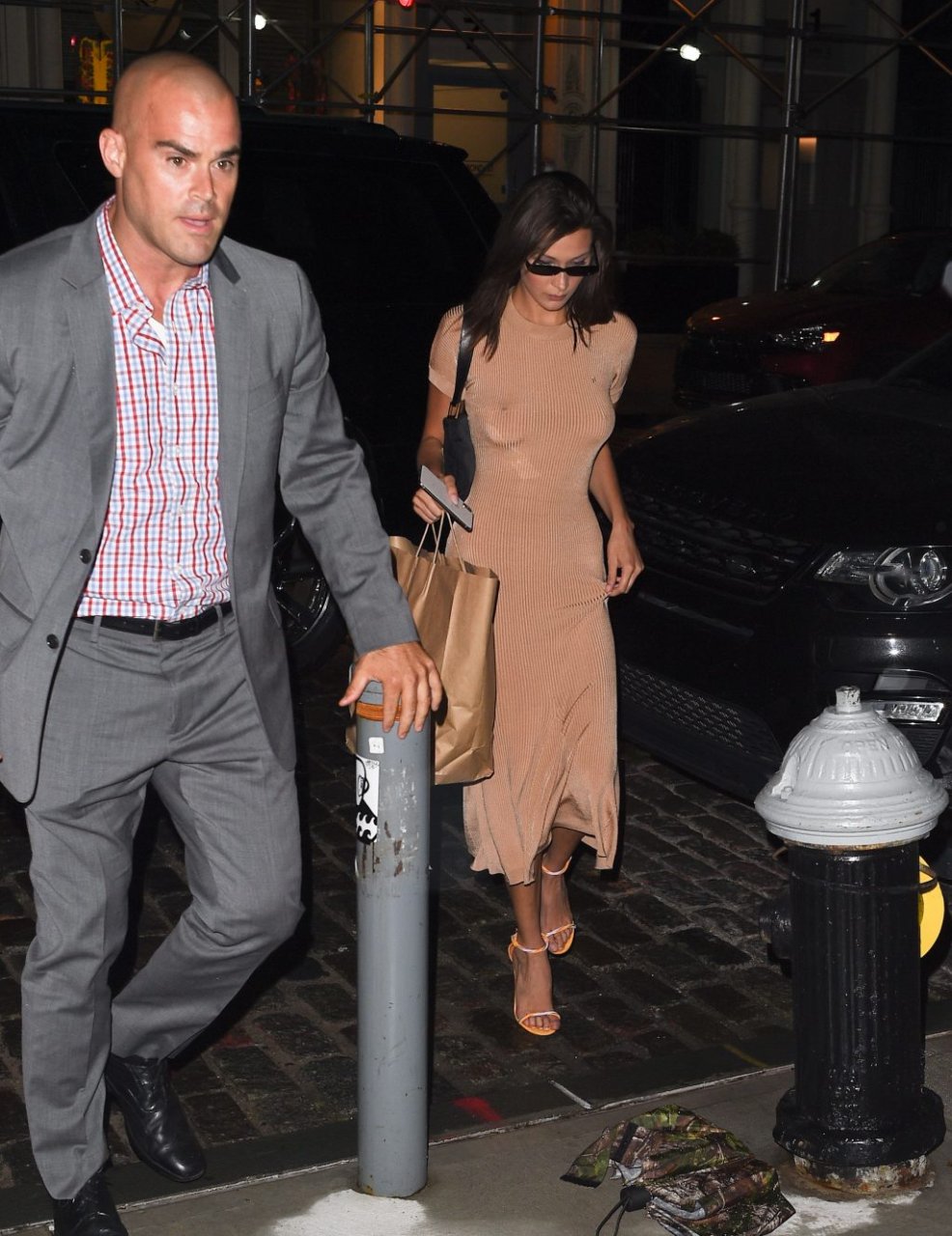 Модель Белла Хадид замечена при приезде в квартиру сестры Джиджи в Нью-Йорке, 09/08/2018. Белла выбрала облегающее бежевое платье без бюстгальтера. К этому образу она добавила стильную обувь.