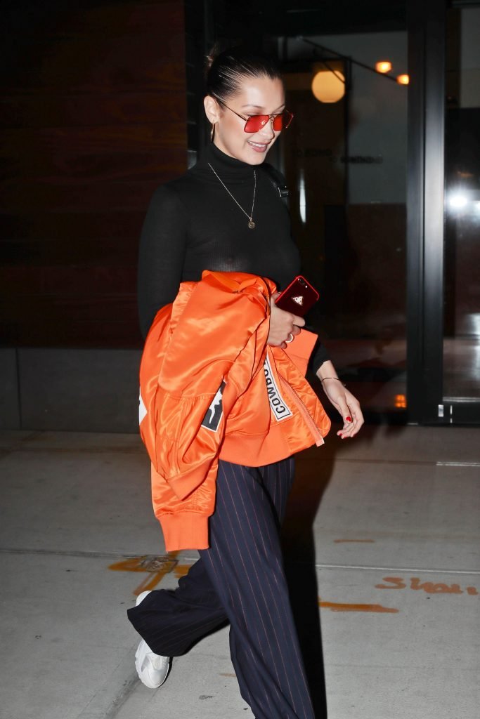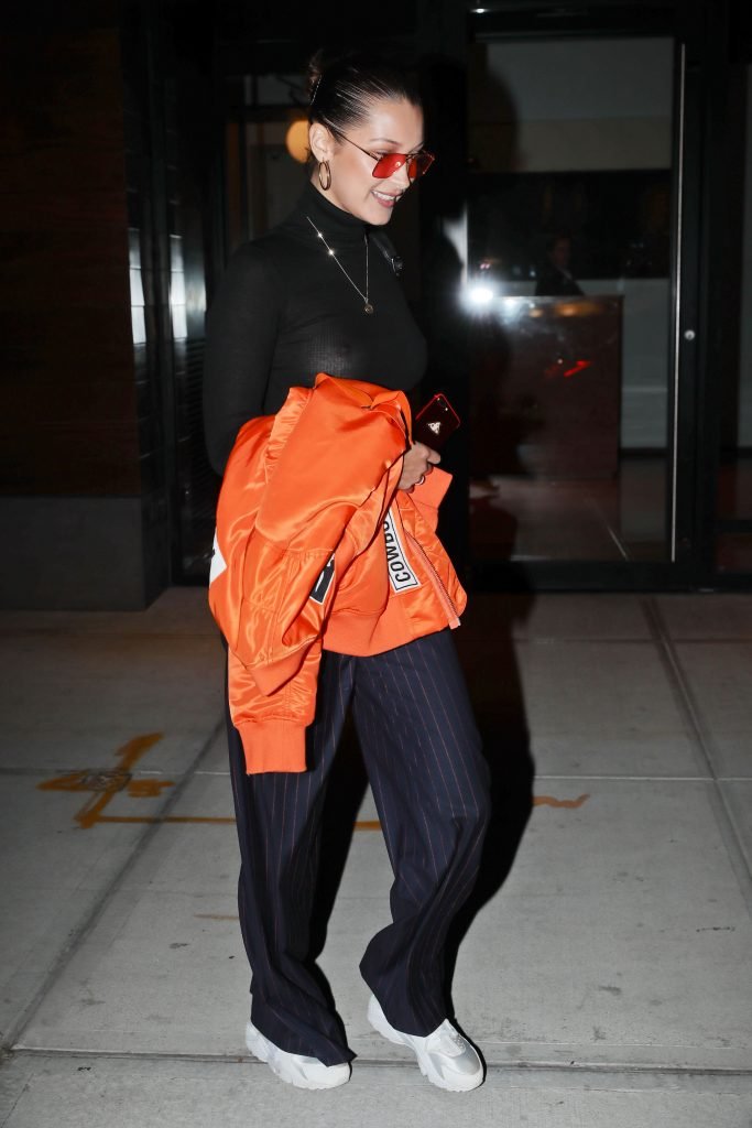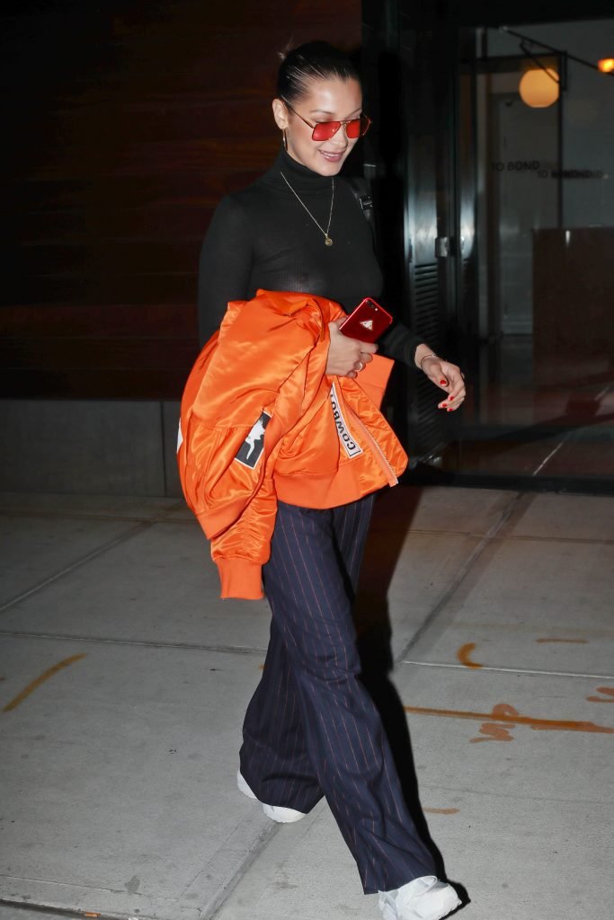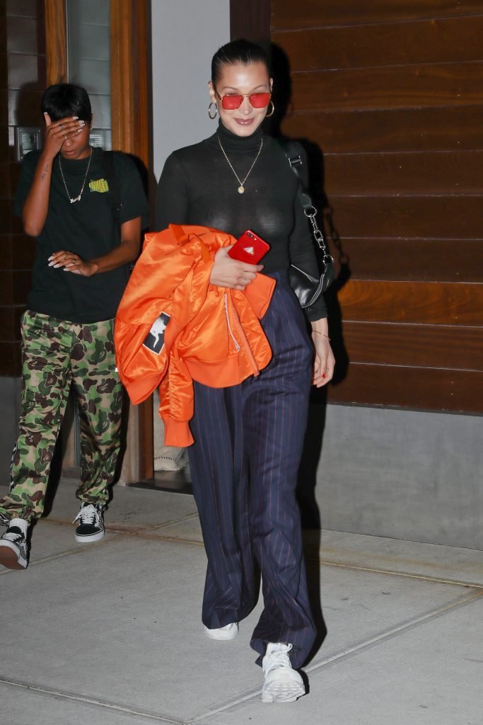 Белла Хадид выходит на улицы Нью-Йорка. 20-летняя американская модель надела прозрачный черный топ с высоким воротником без бюстгальтера.