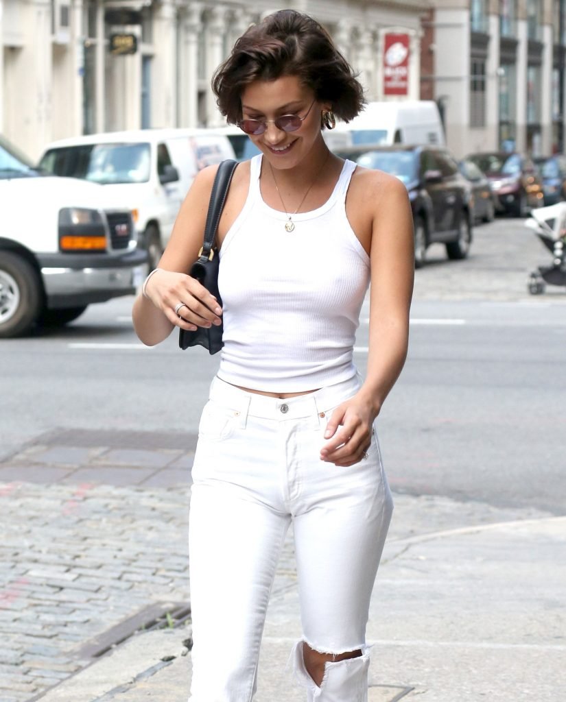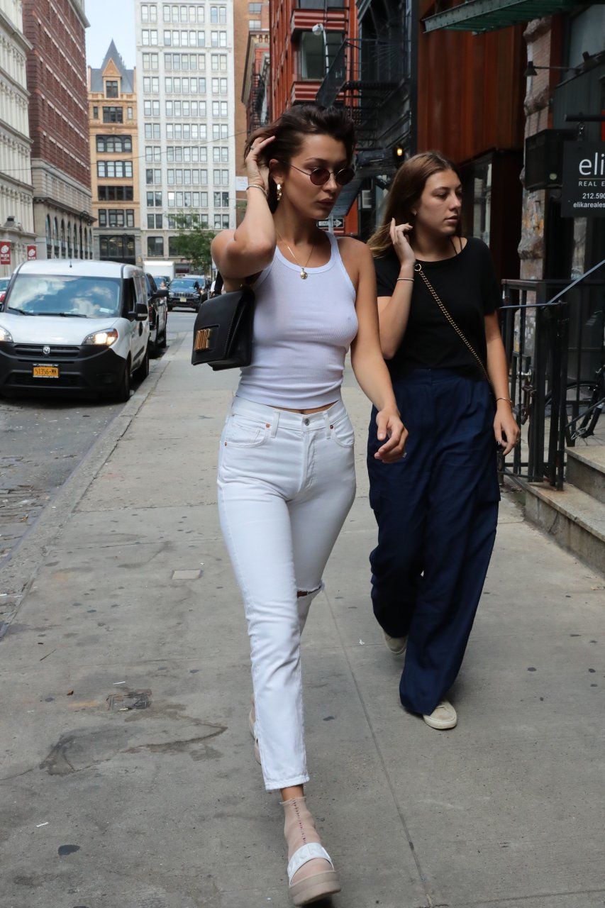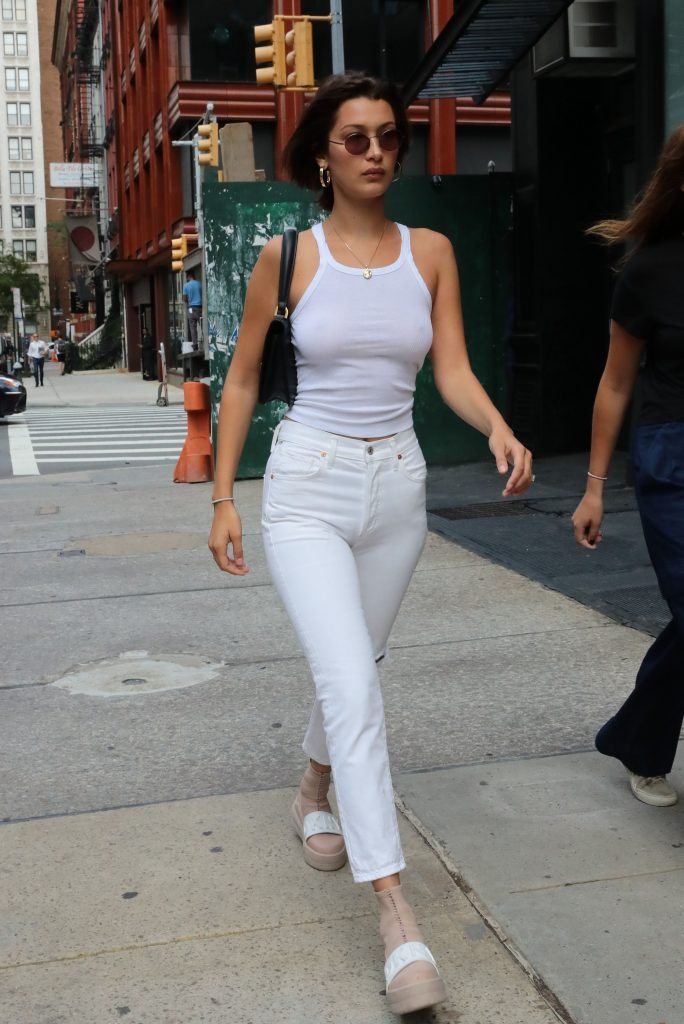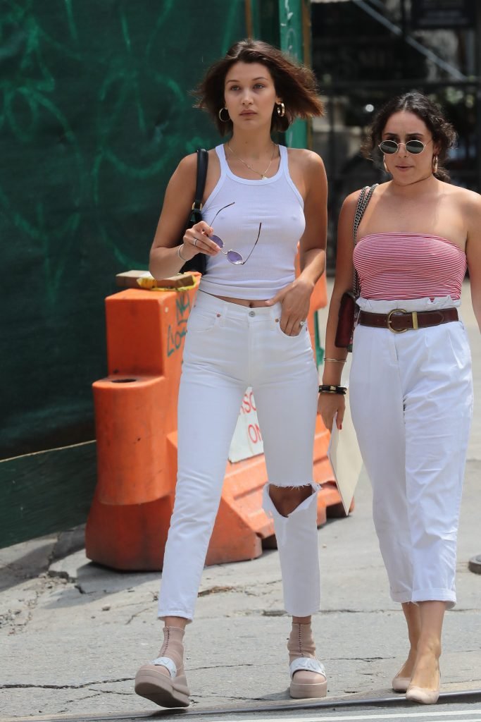 Модель Белла Хадид вышла на улицу без бюстгальтера и в полностью белом в Нью-Йорке, 17.07.2017.