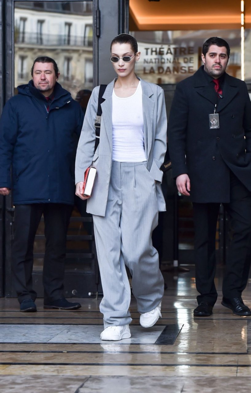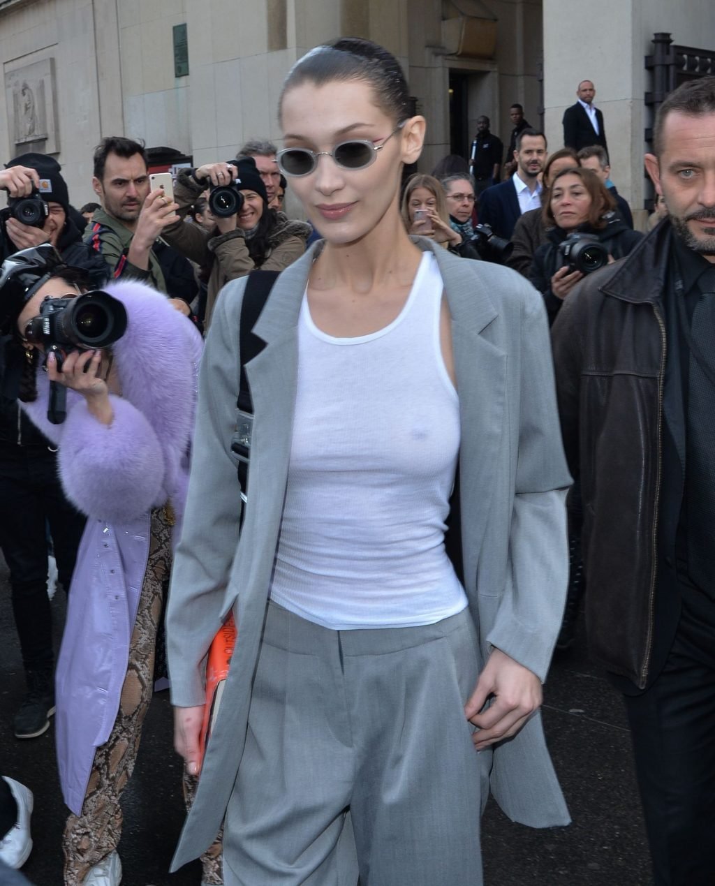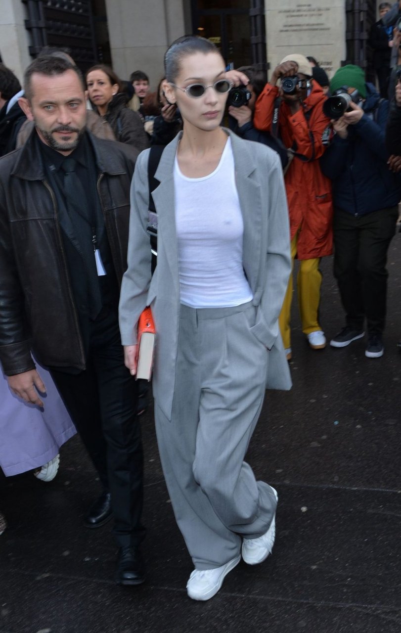 Модель Белла Хадид без бюстгальтера покидает показ мод Haider Ackermann в Париже, 03/02/2019.