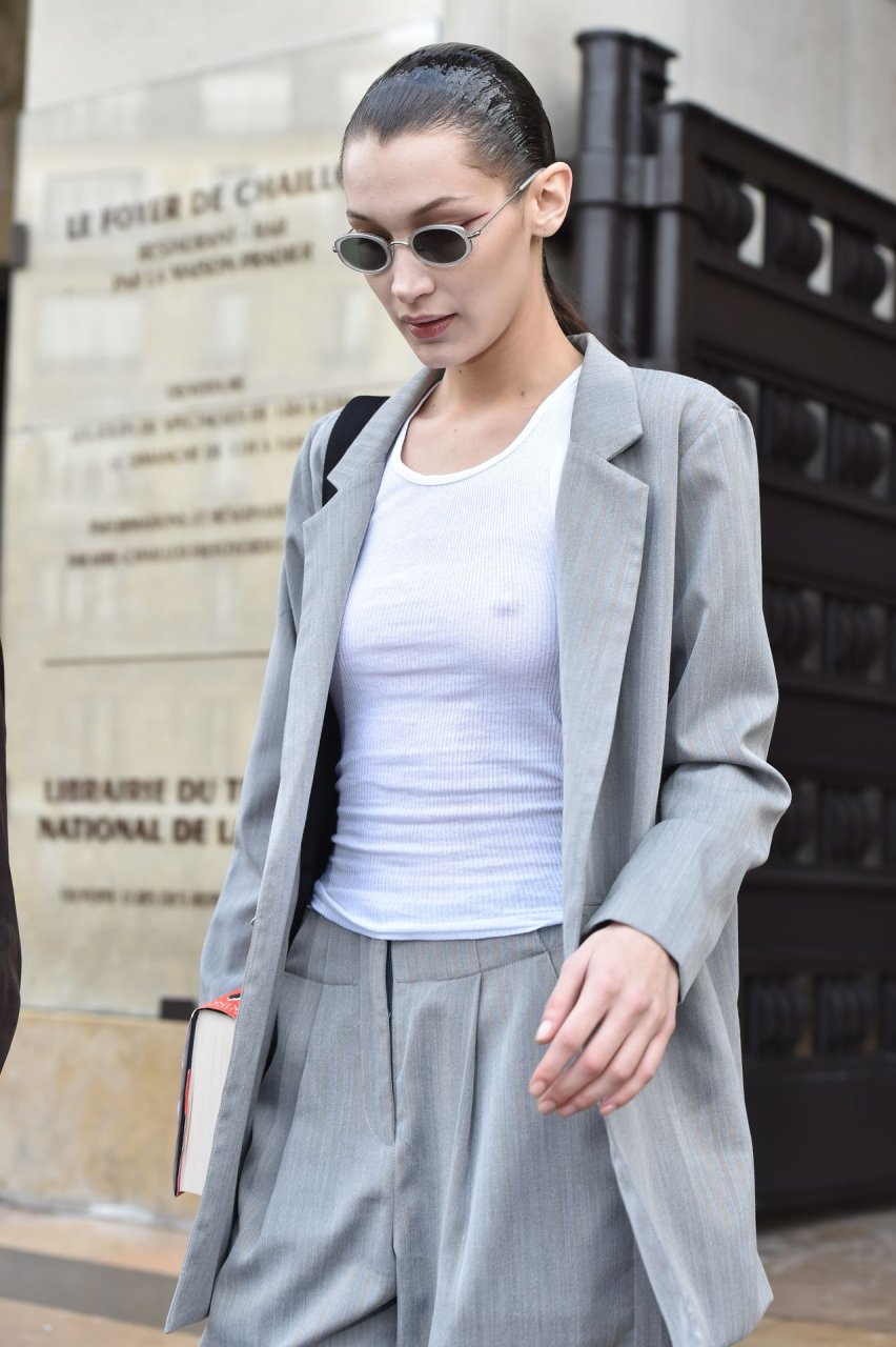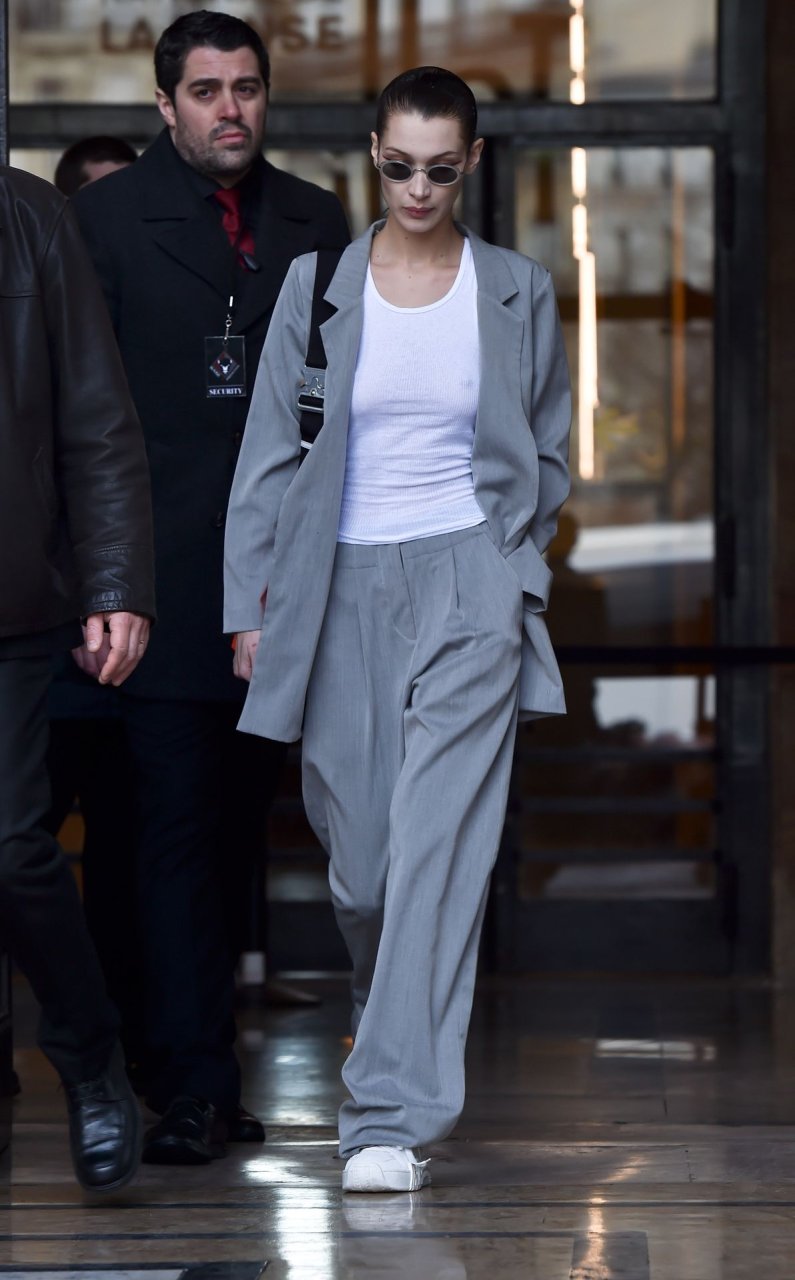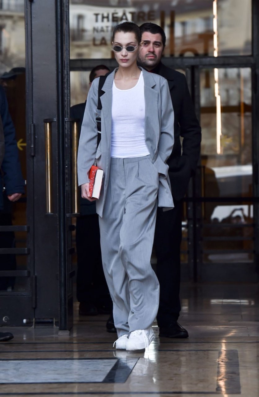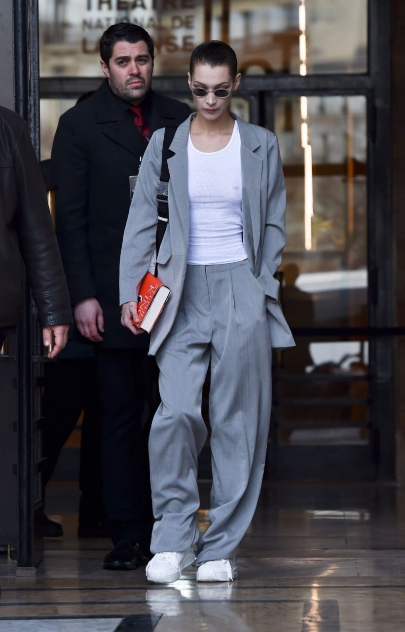 Модель Белла Хадид без бюстгальтера покидает показ мод Haider Ackermann в Париже, 03/02/2019.